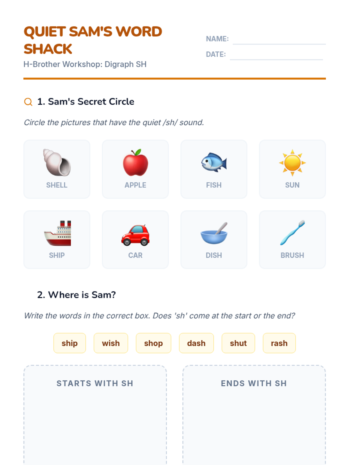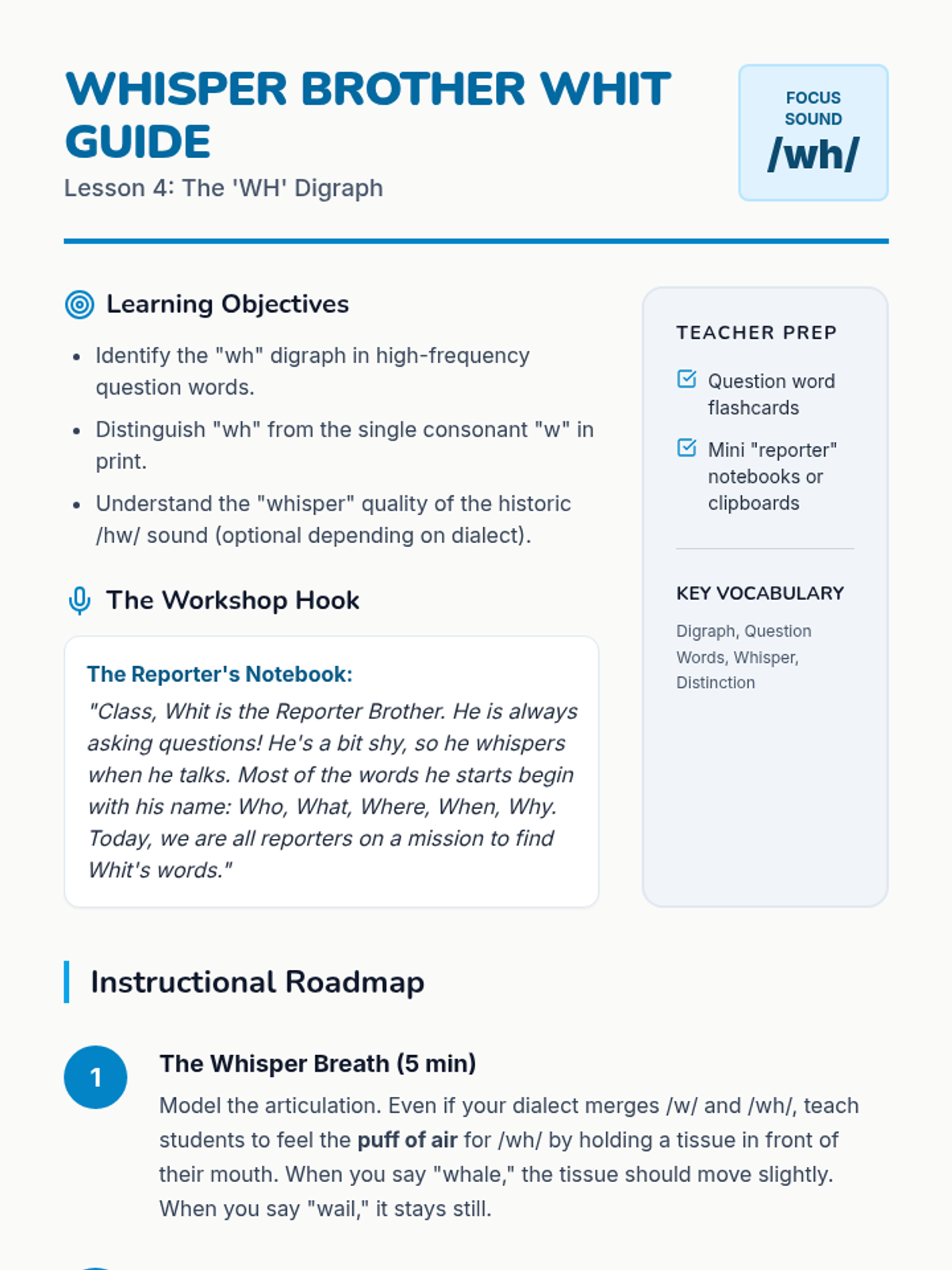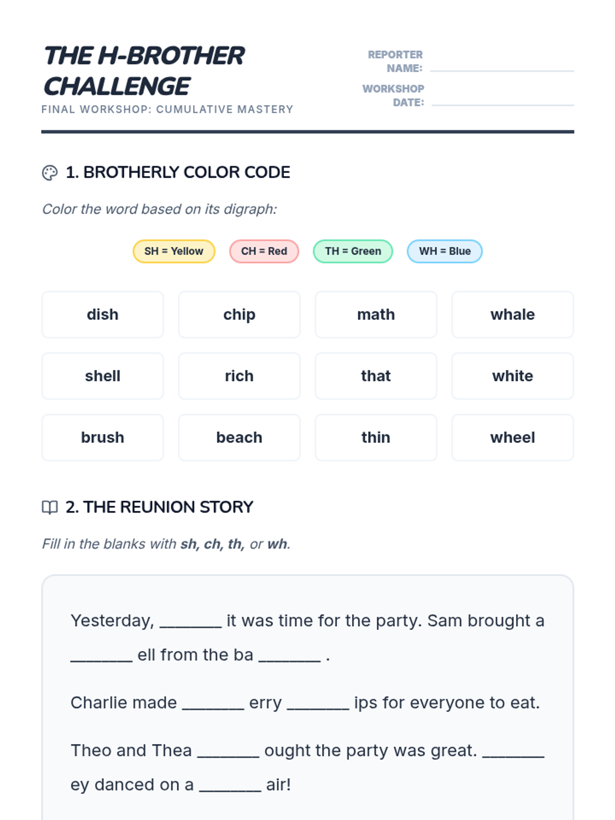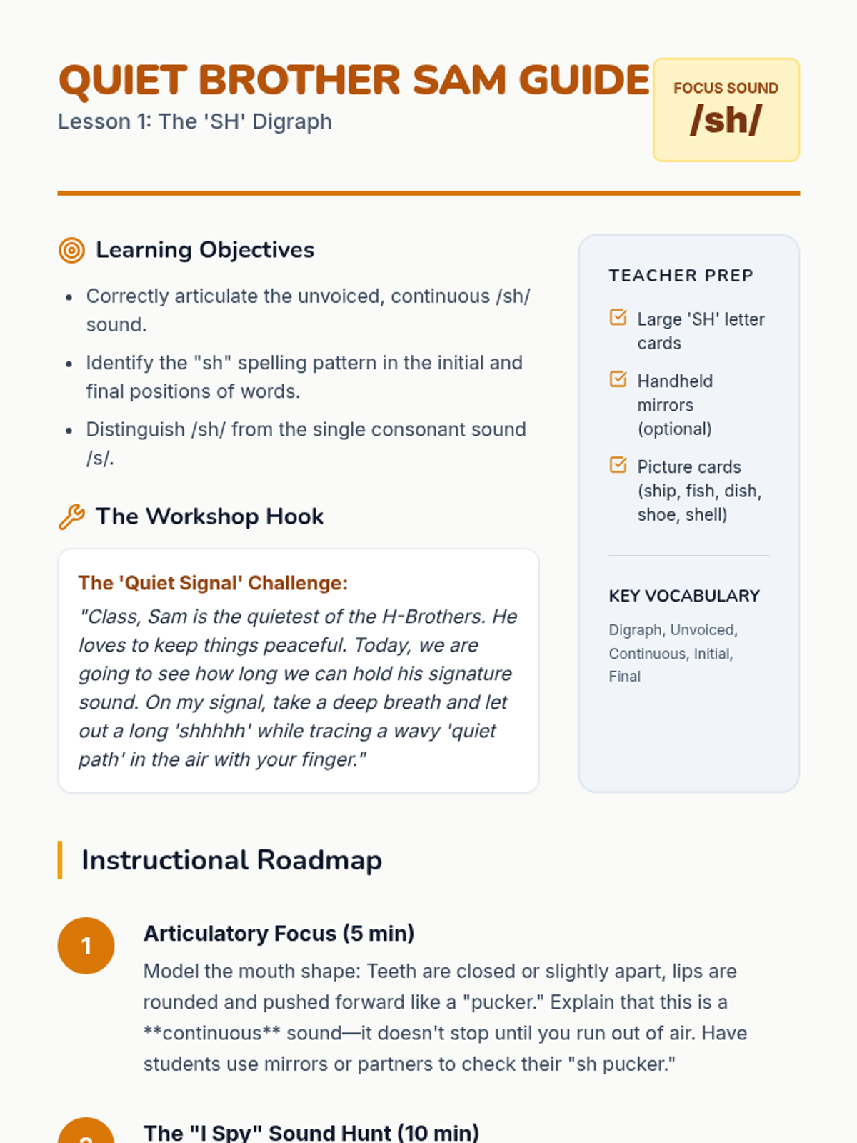 A comprehensive phonics sequence for 2nd Grade focused on identifying, articulating, and distinguishing the 'H-Brother' digraphs: sh, ch, th, and wh. Through tactile workshops and auditory discrimination tasks, students build decoding automaticity and phonemic awareness.