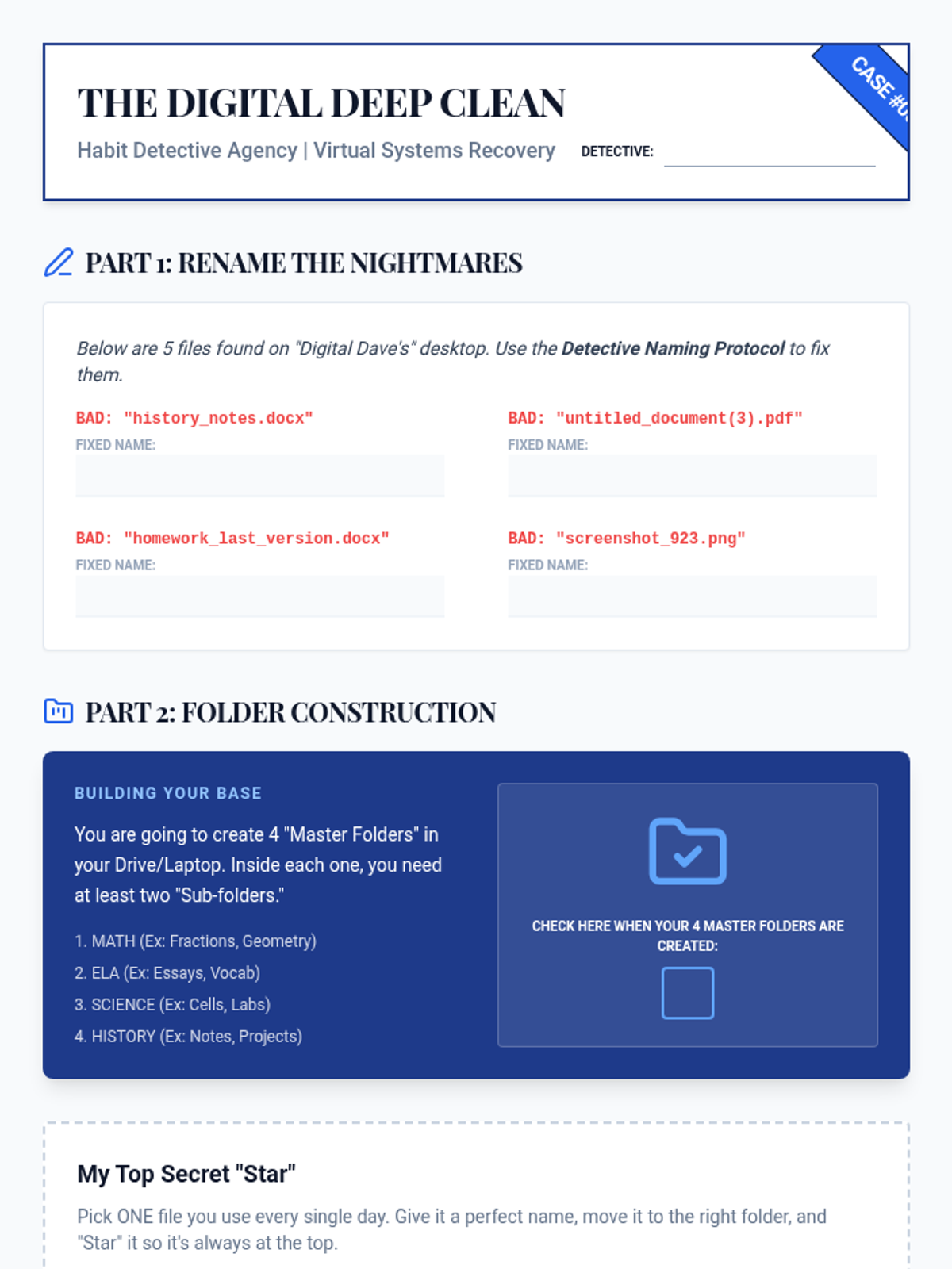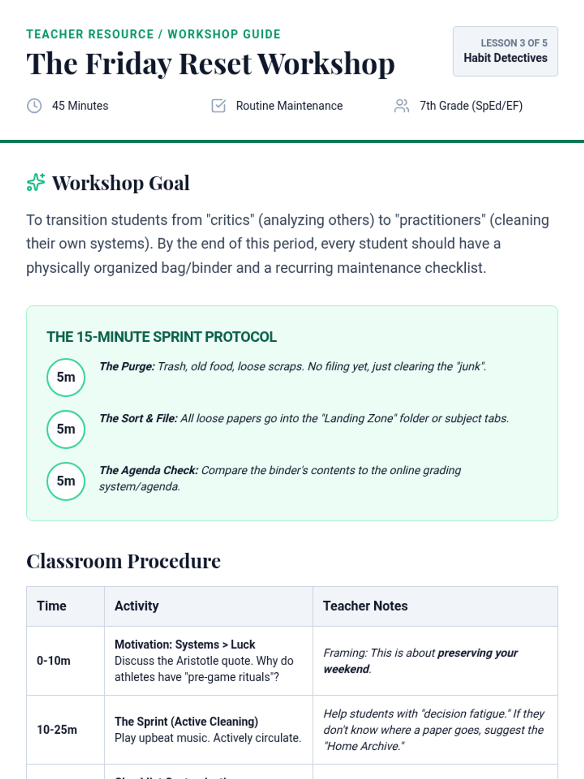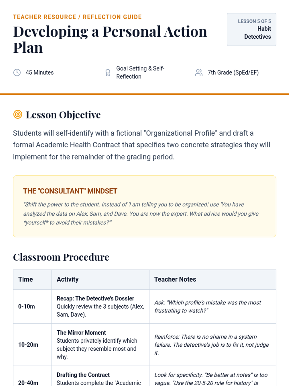 A case-study-driven sequence designed for 7th-grade students to analyze and troubleshoot executive function breakdowns. Students take on the role of 'Habit Detectives' to diagnose organizational issues in fictional profiles and develop personalized maintenance systems for themselves.