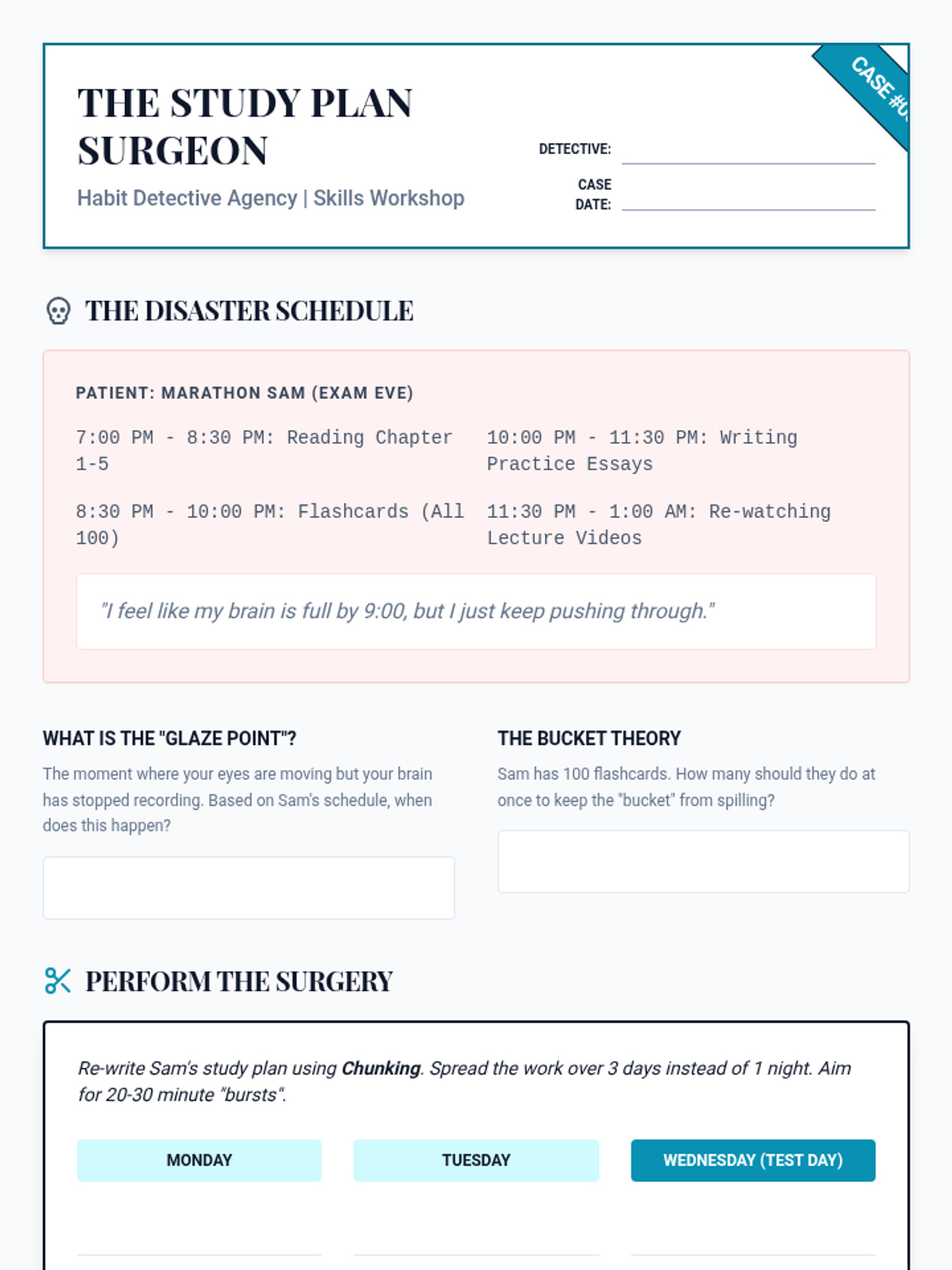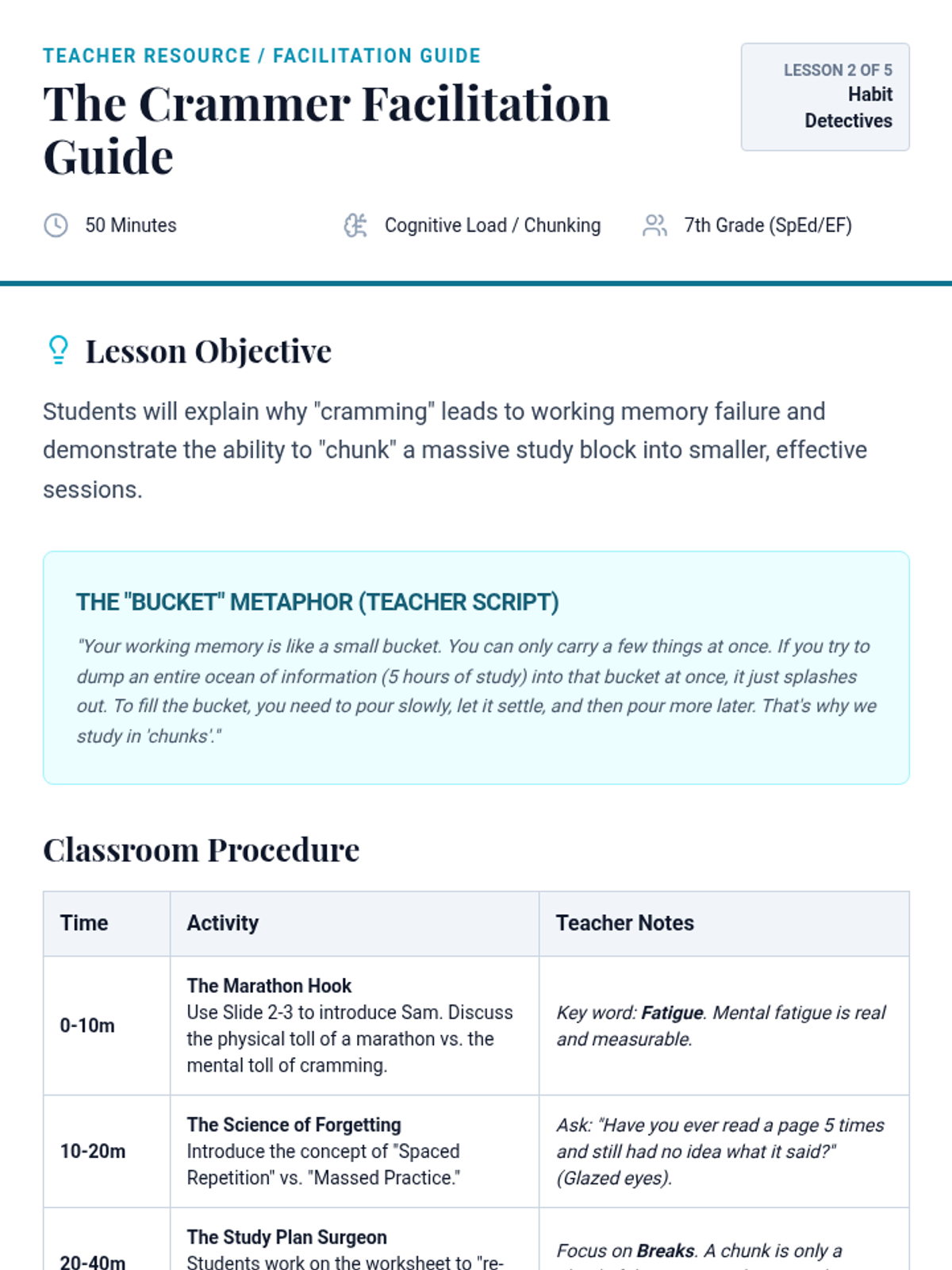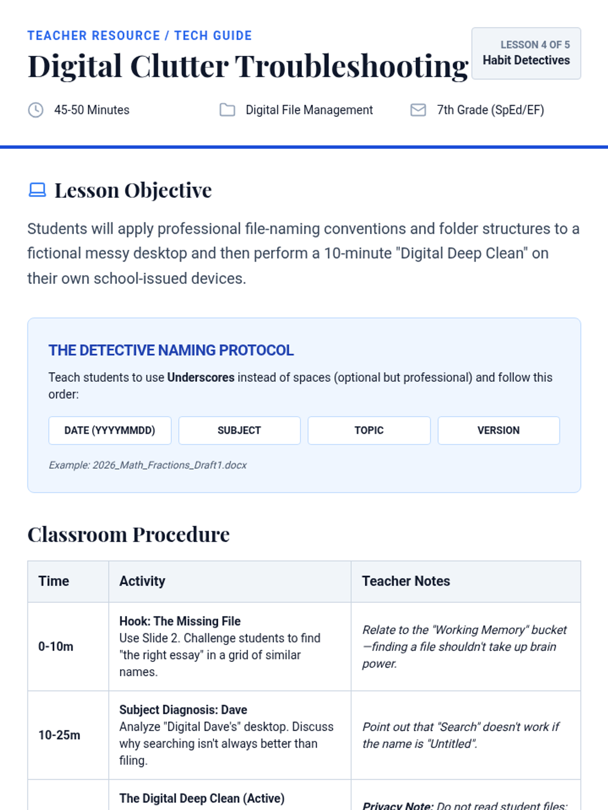 A case-study-driven sequence designed for 7th-grade students to analyze and troubleshoot executive function breakdowns. Students take on the role of 'Habit Detectives' to diagnose organizational issues in fictional profiles and develop personalized maintenance systems for themselves.