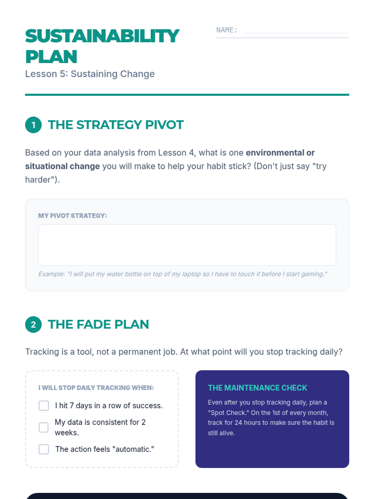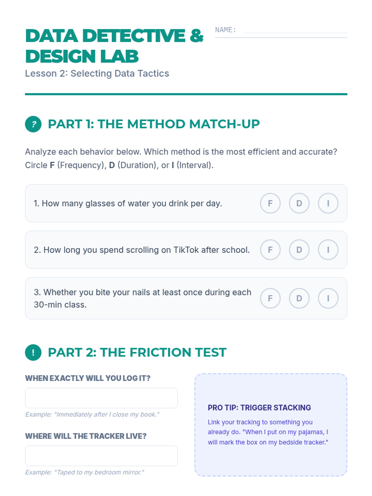 A sequence empowering students to apply the principles of behavior tracking to their own lives through the 'Quantified Self' movement. Students identify personal habits, explore data logging methods, create visual trackers, and analyze performance to understand how accountability impacts self-discipline.