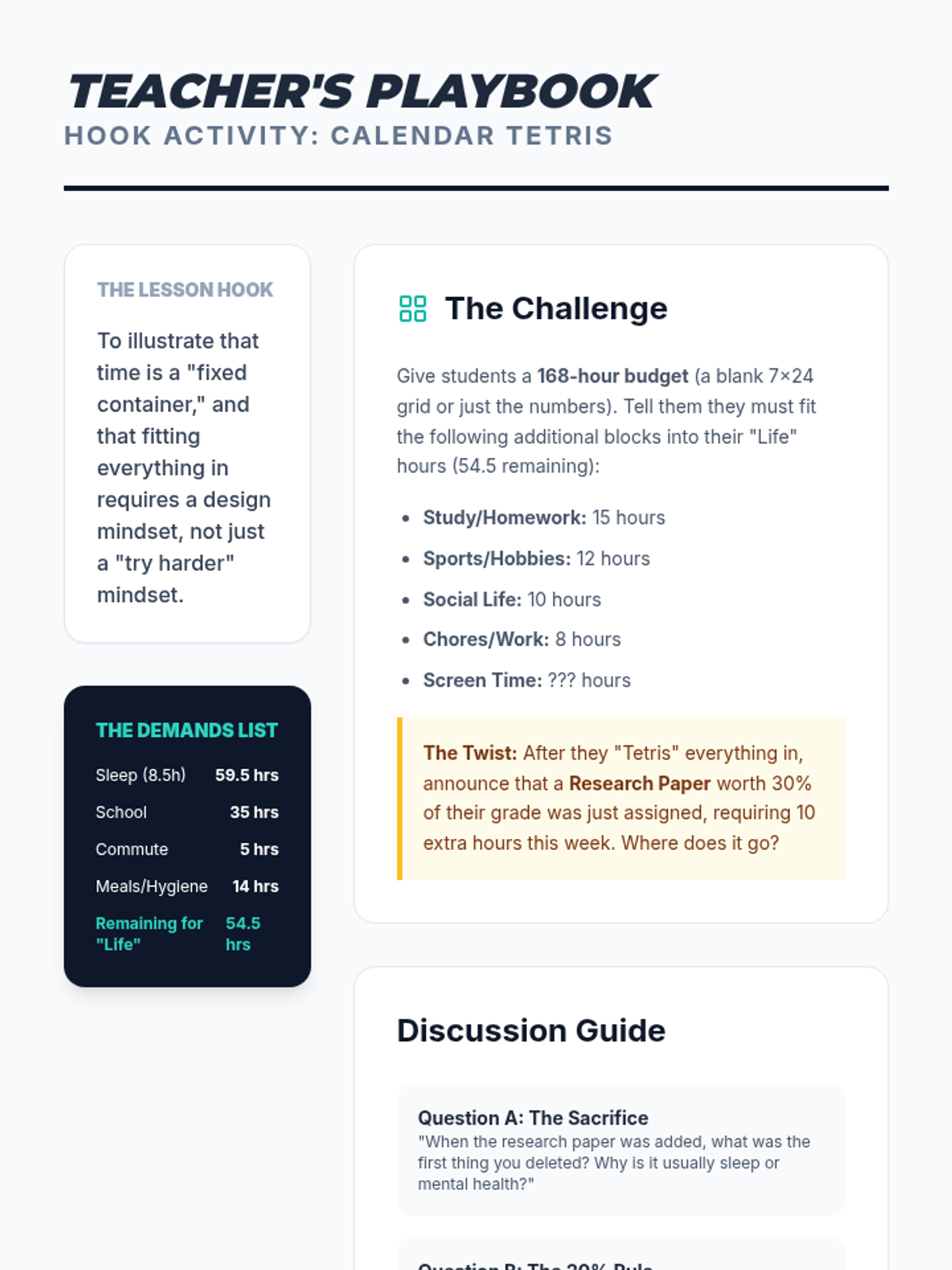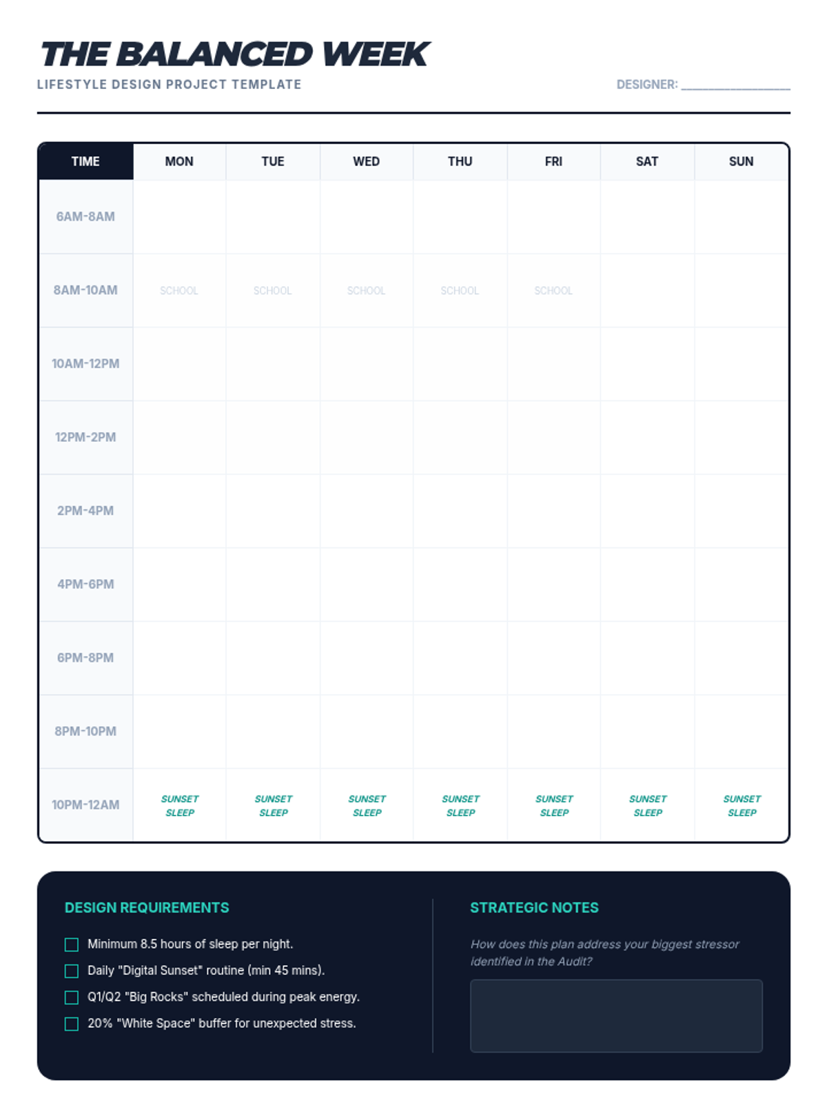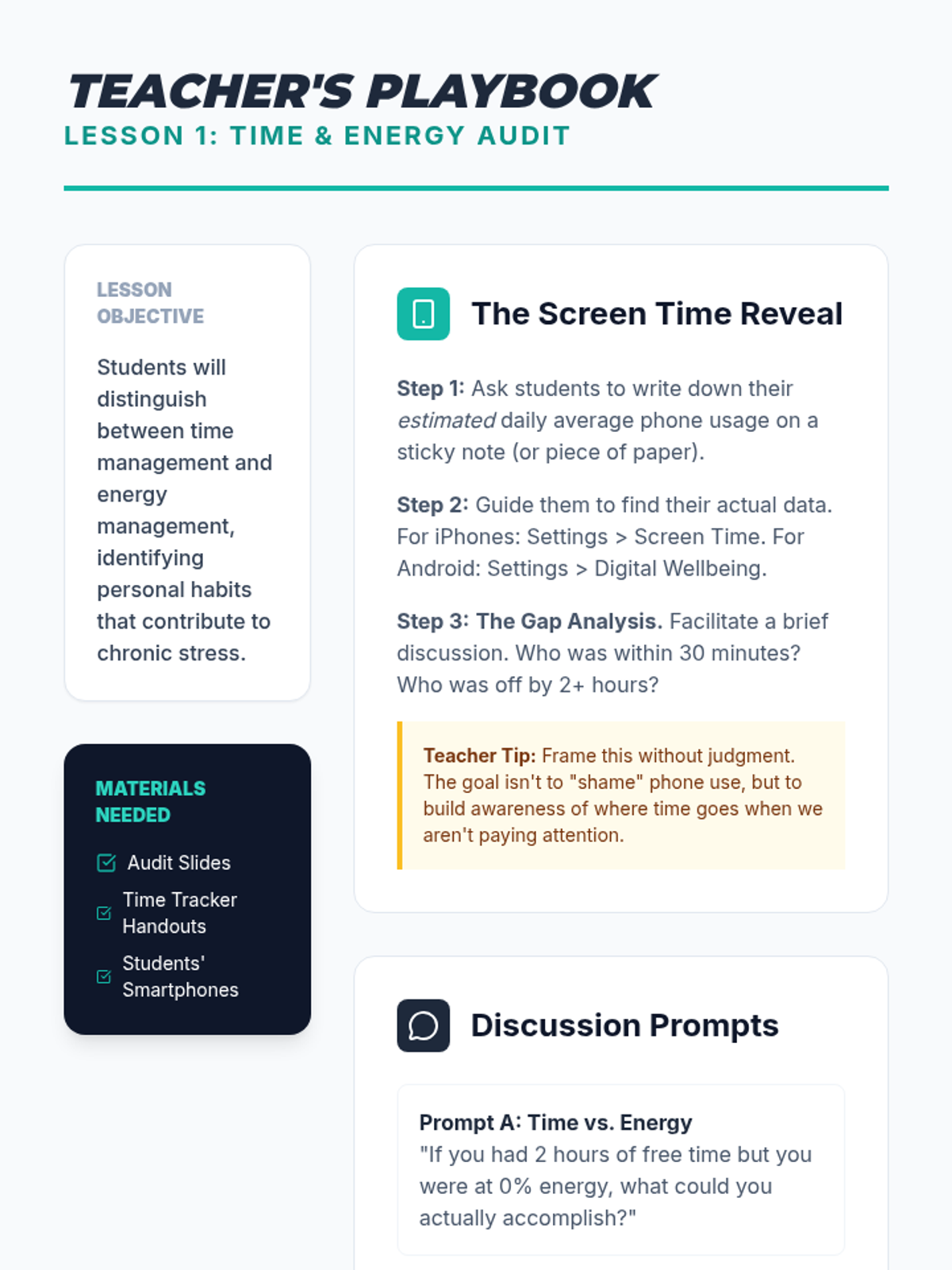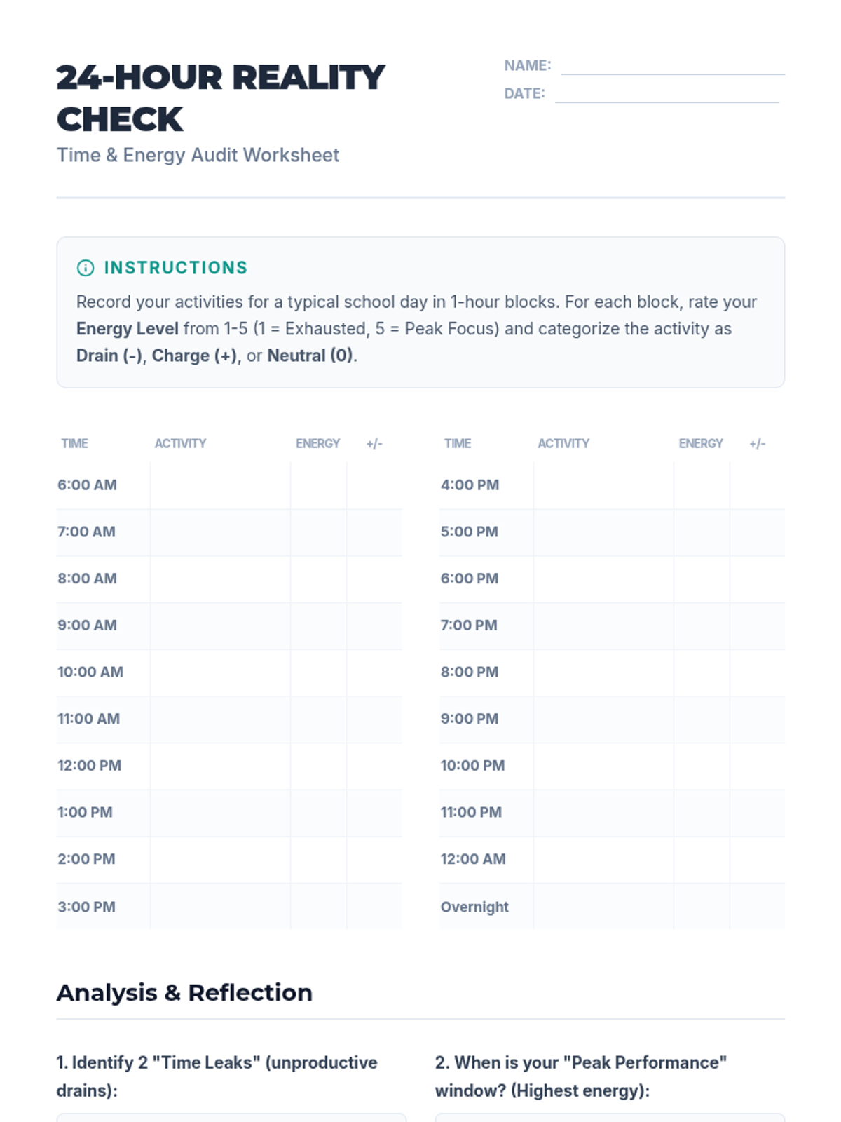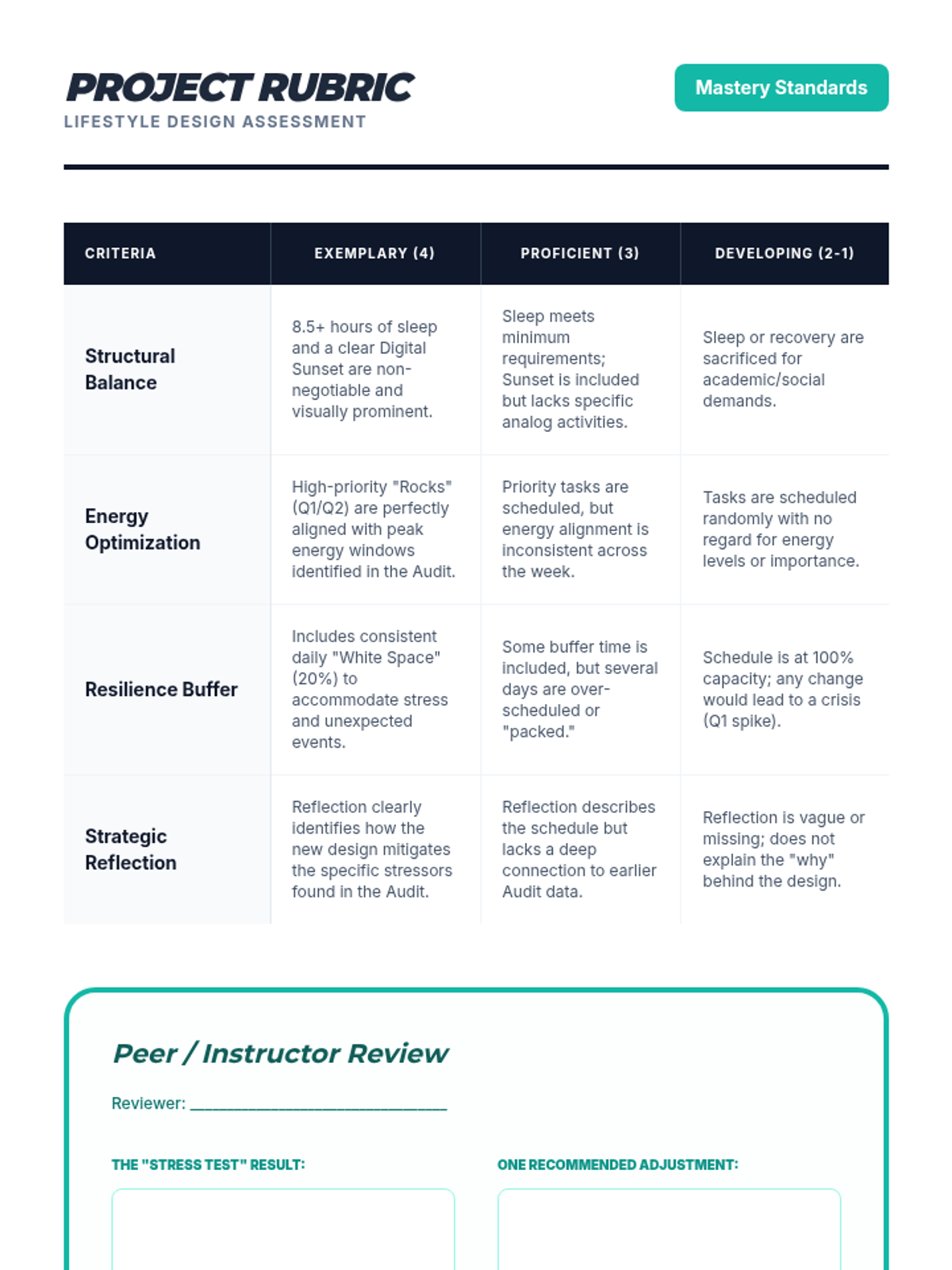 This sequence addresses student stress through preventative mental health strategies, focusing on time management, executive function, and healthy boundary setting. Students move from auditing their current habits to designing a sustainable lifestyle plan that balances productivity with recovery.