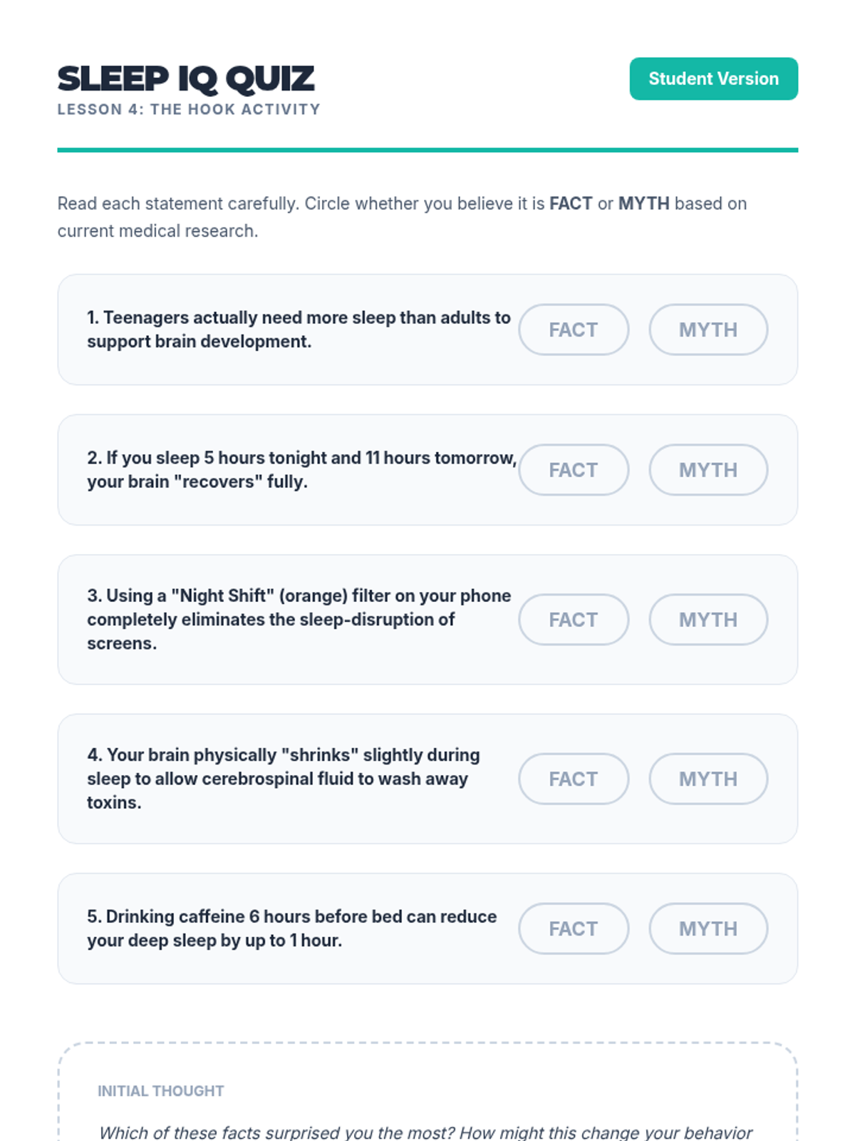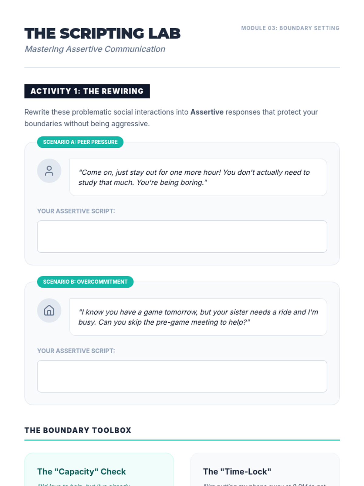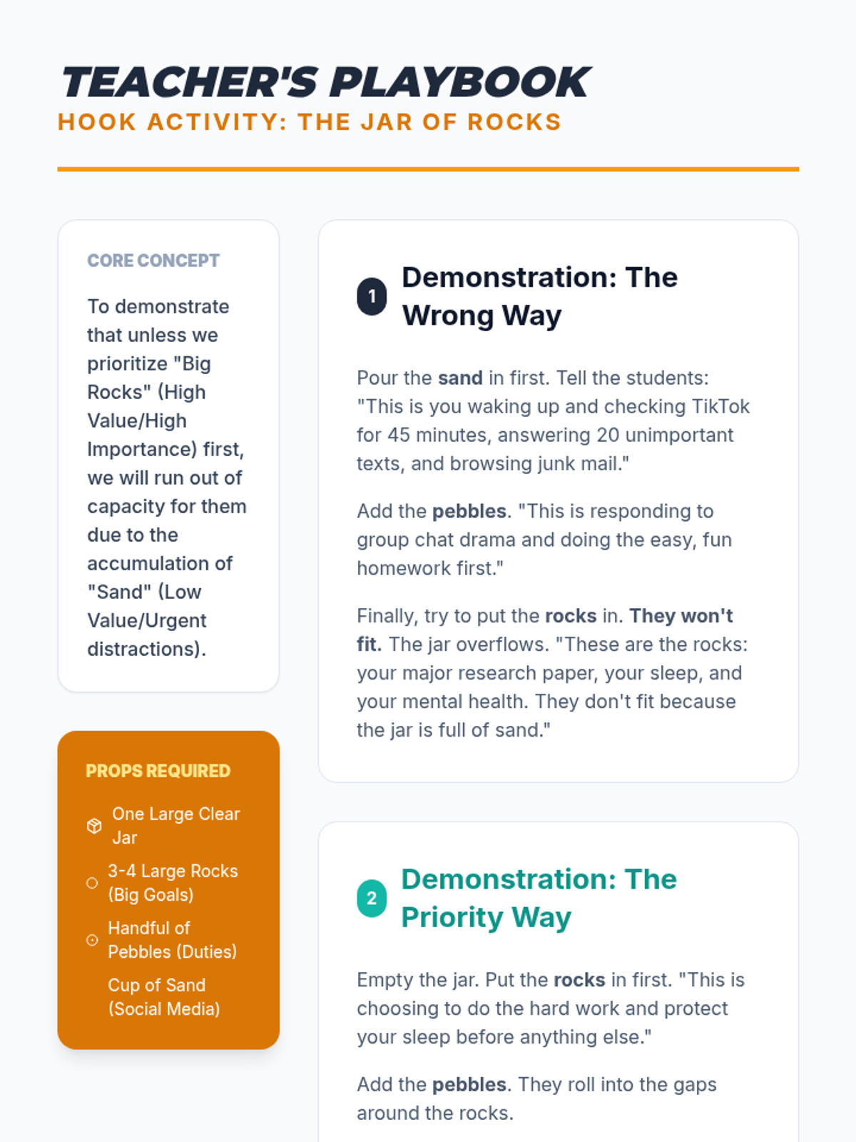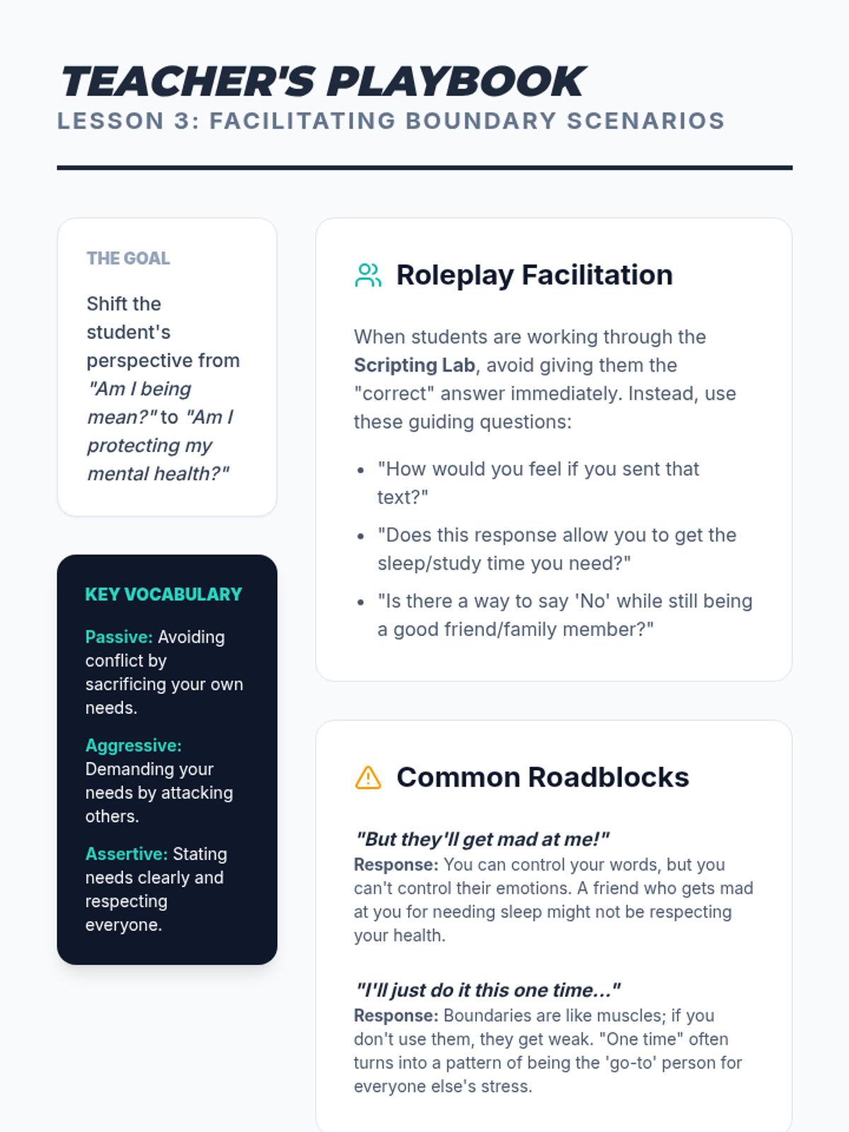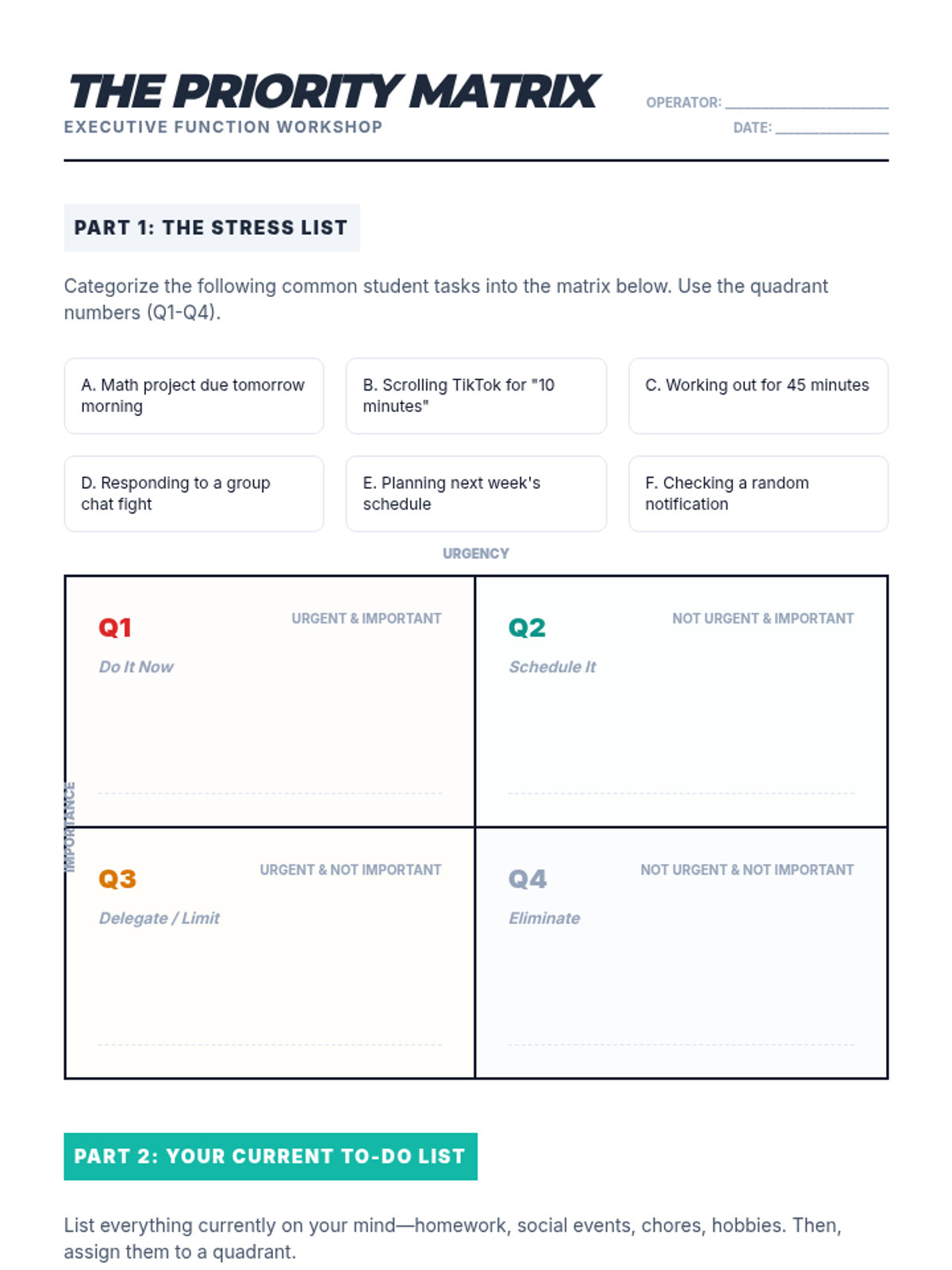 This sequence addresses student stress through preventative mental health strategies, focusing on time management, executive function, and healthy boundary setting. Students move from auditing their current habits to designing a sustainable lifestyle plan that balances productivity with recovery.