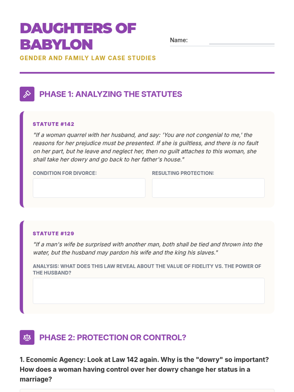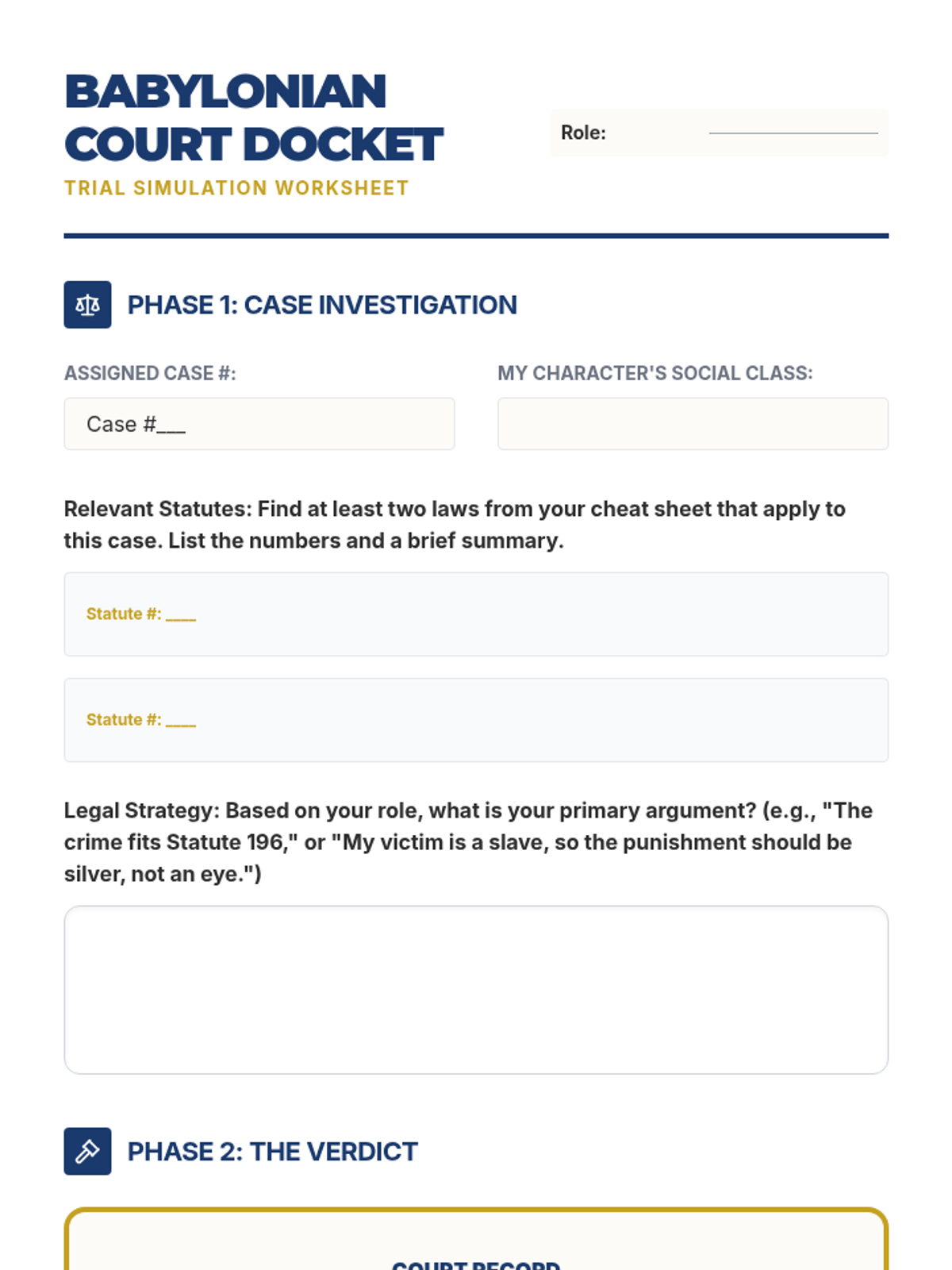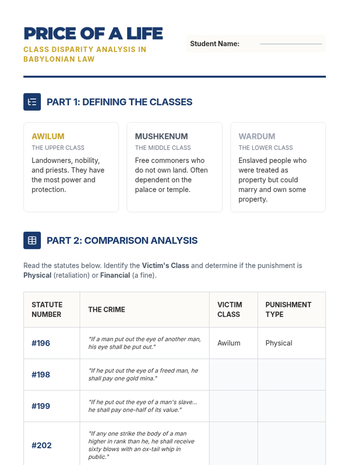 A comprehensive investigation into the Code of Hammurabi, examining how ancient Babylonian laws reflected social hierarchies, gender roles, and the concept of retributive justice. Students act as legal historians to analyze original statutes and simulate ancient court cases.