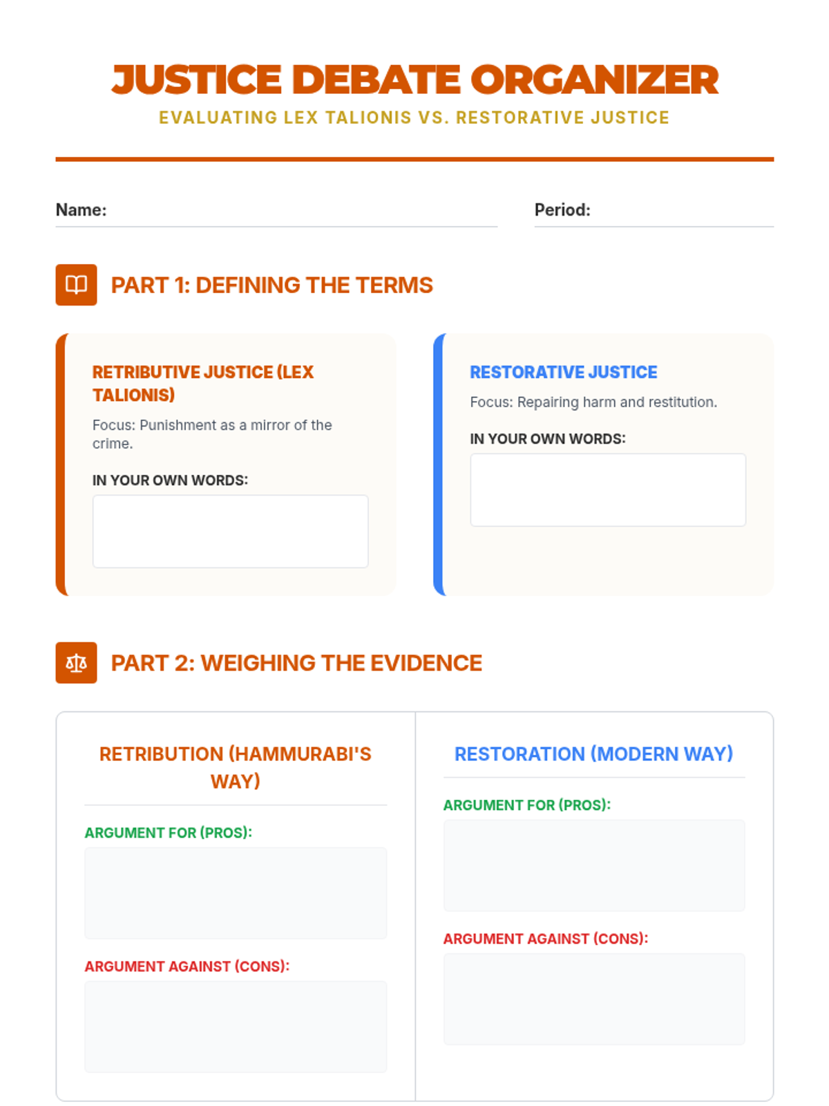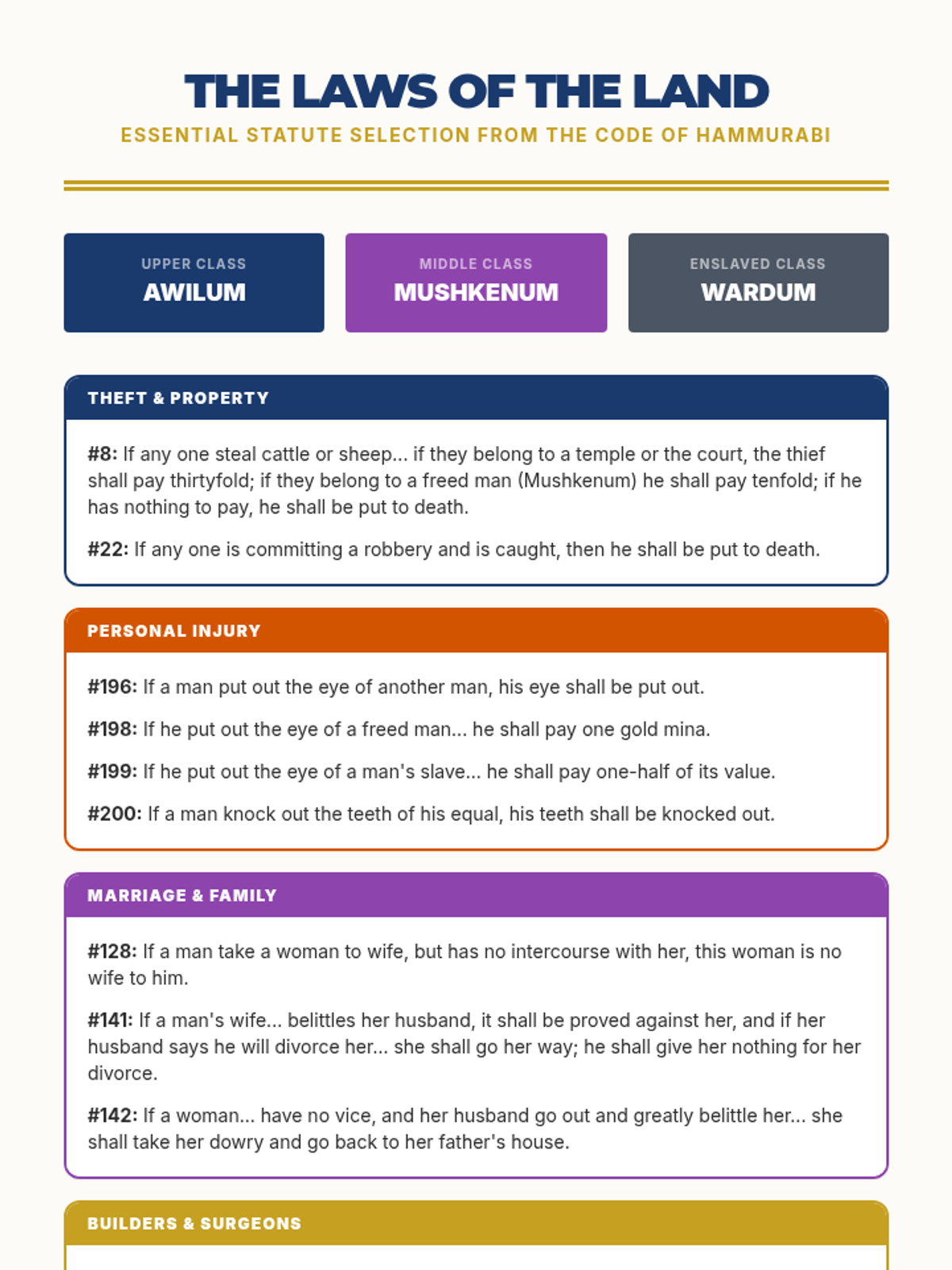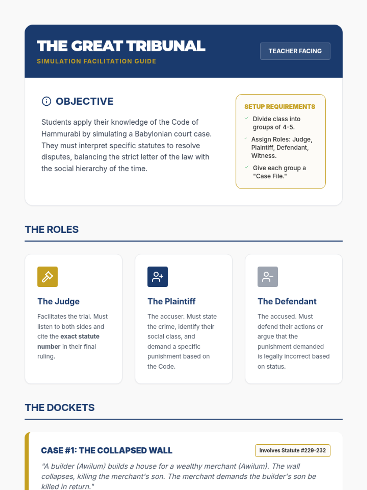 A comprehensive investigation into the Code of Hammurabi, examining how ancient Babylonian laws reflected social hierarchies, gender roles, and the concept of retributive justice. Students act as legal historians to analyze original statutes and simulate ancient court cases.