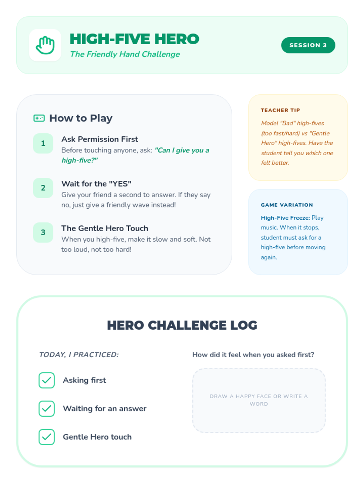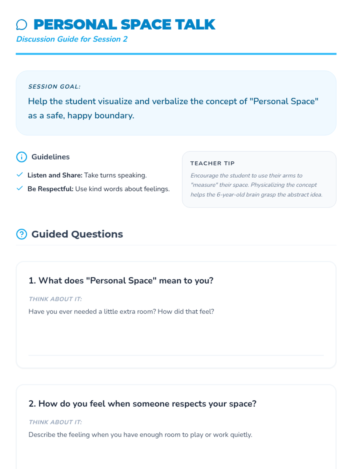 A 10-session Tier 3 intervention for a kindergarten student focused on developing self-regulation skills and maintaining personal space boundaries through storytelling, games, and creative activities.