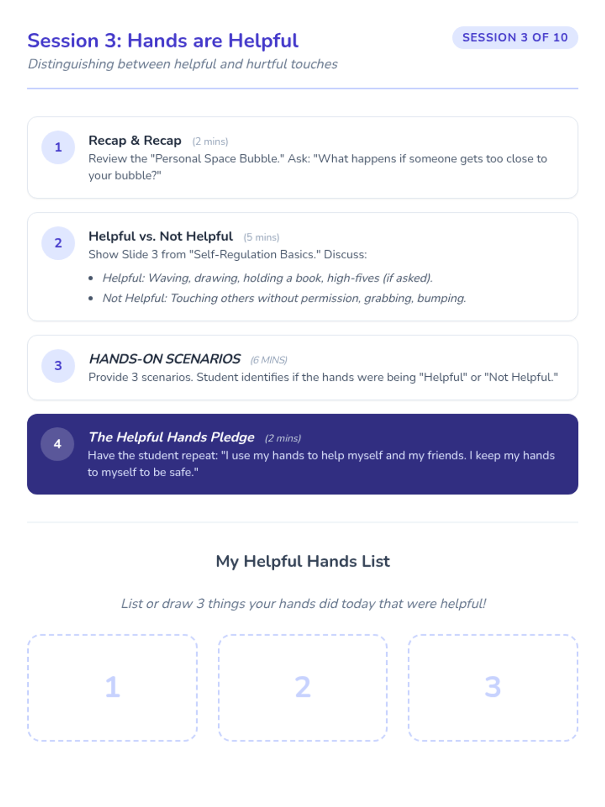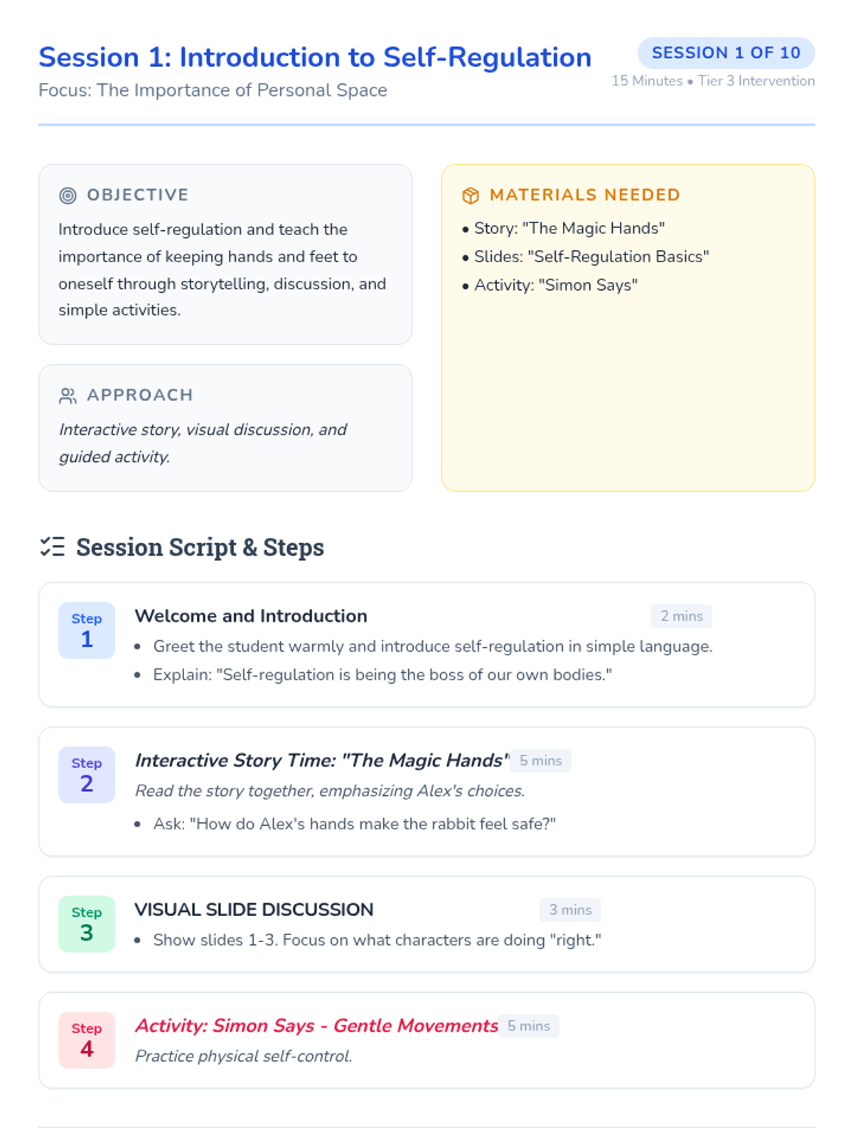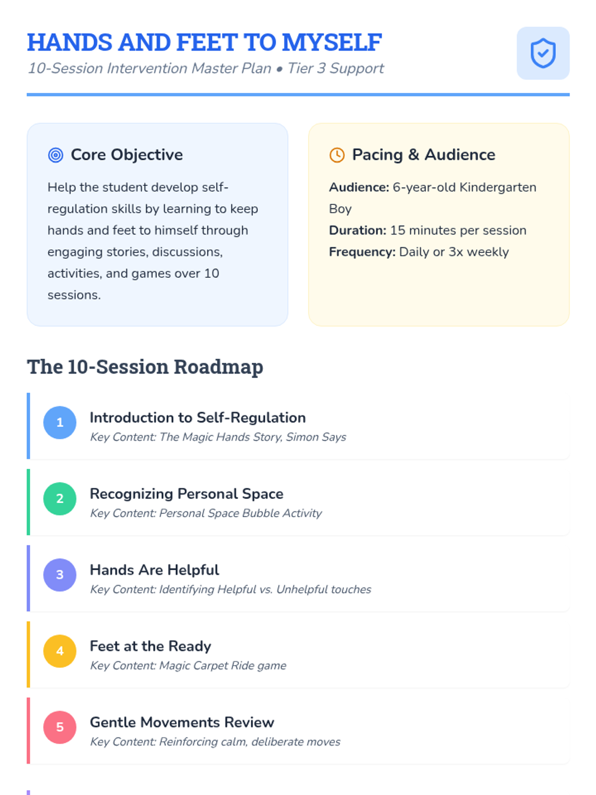 A 10-session Tier 3 intervention for a 6-year-old kindergarten student focused on developing self-regulation skills, specifically keeping hands and feet to himself through stories, games, and movement.