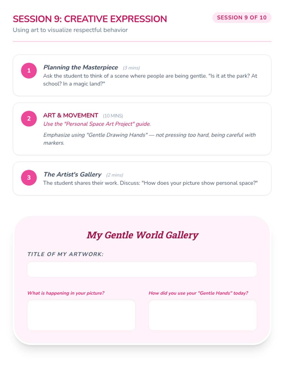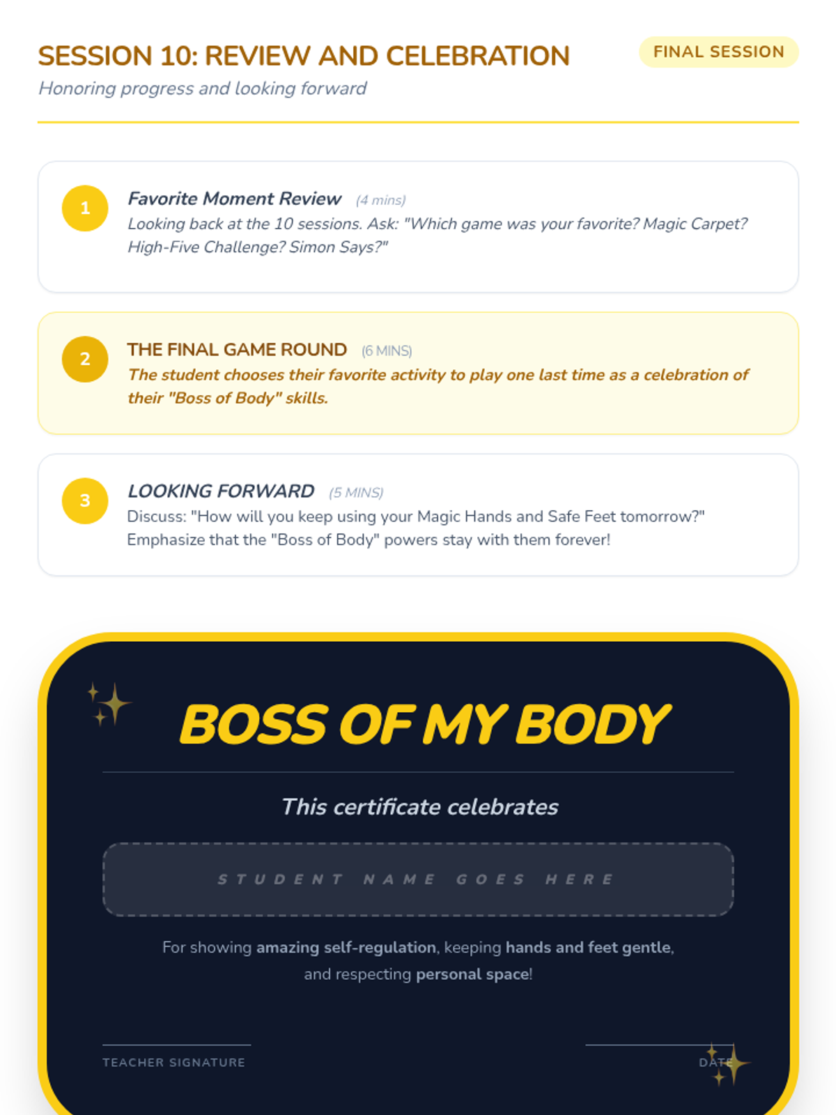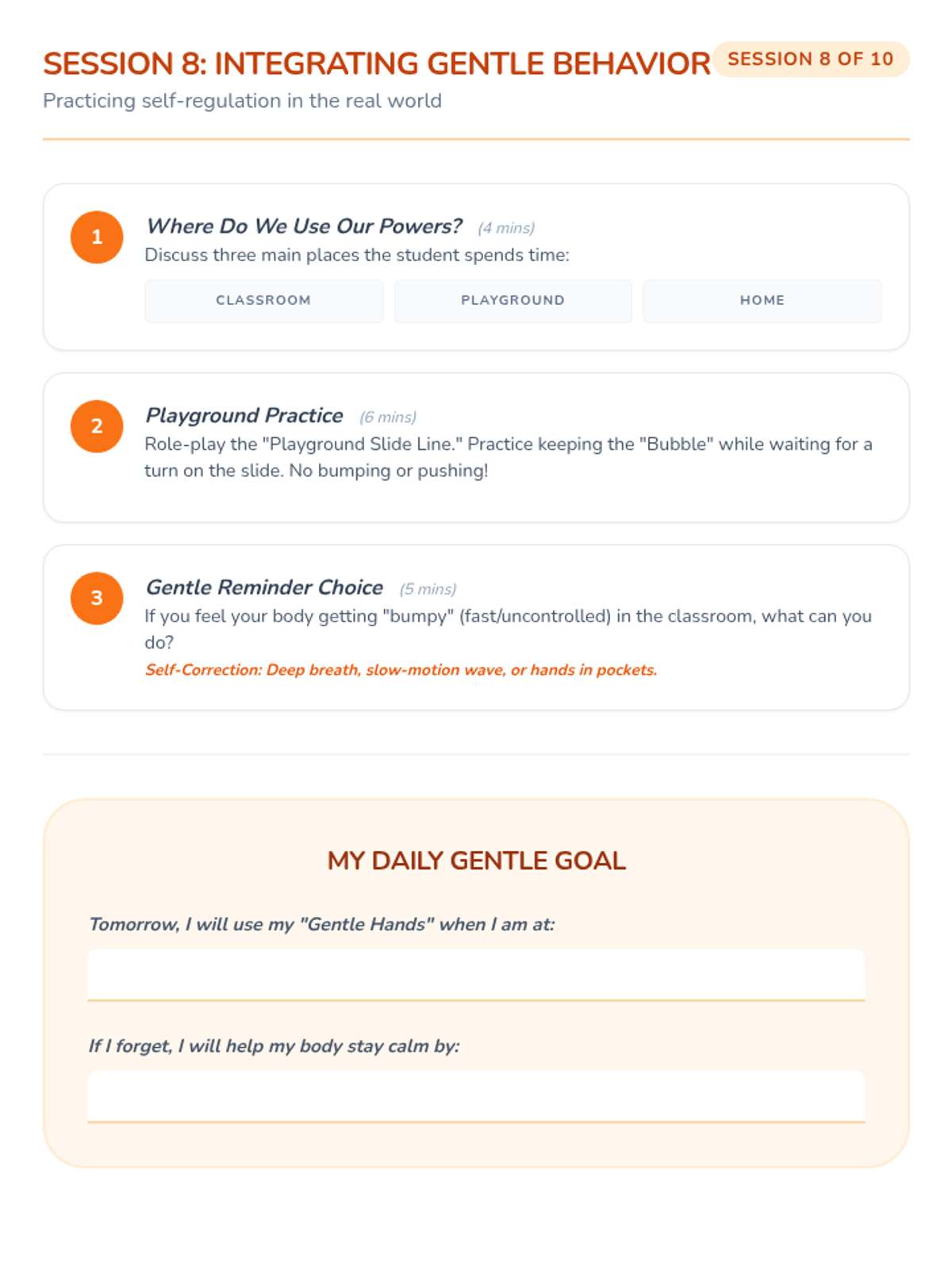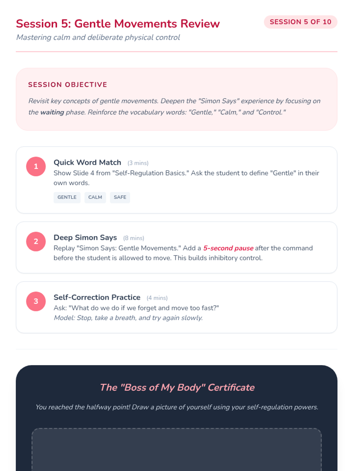 A 10-session Tier 3 intervention for a 6-year-old kindergarten student focused on developing self-regulation skills, specifically keeping hands and feet to himself through stories, games, and movement.