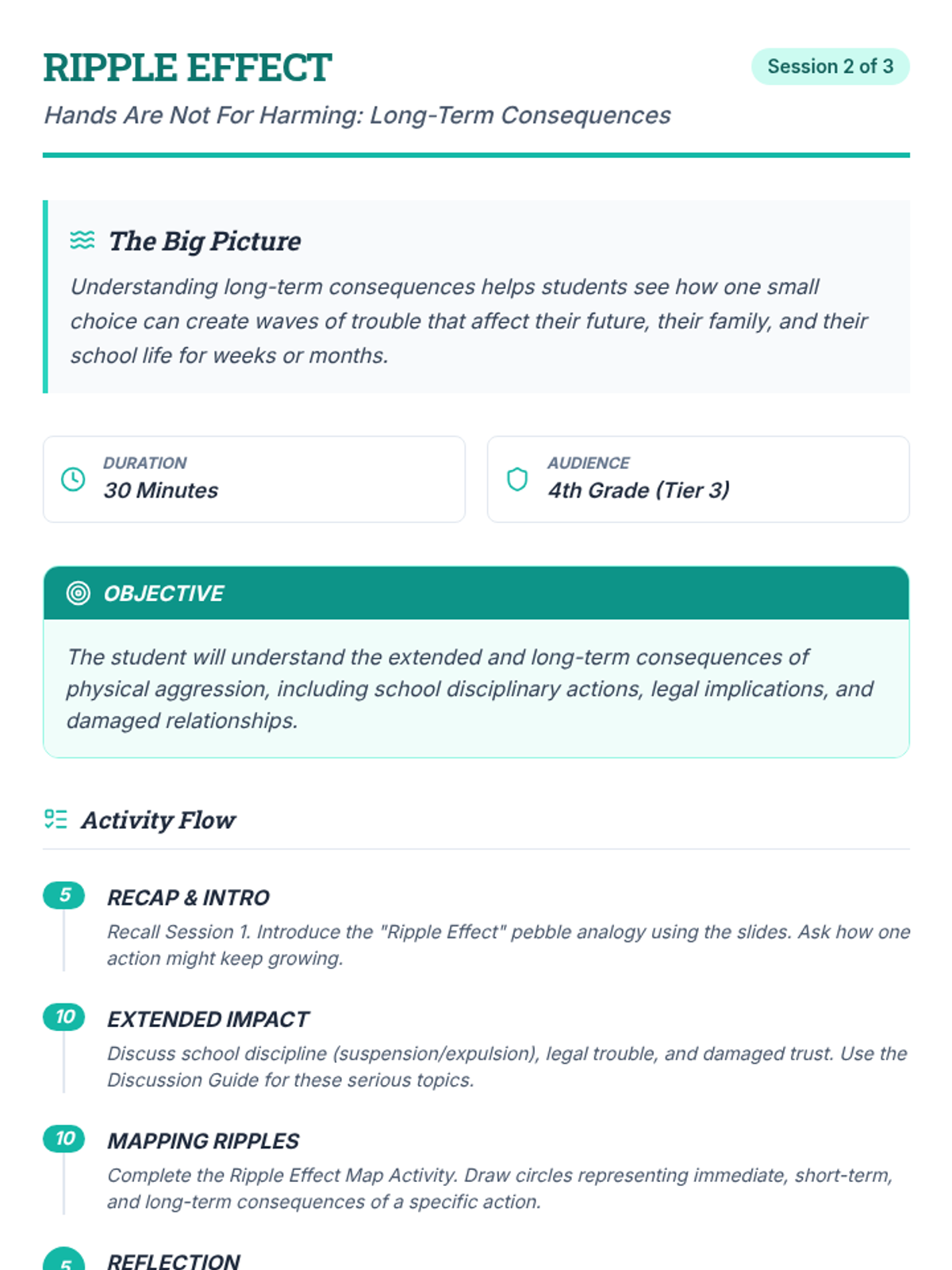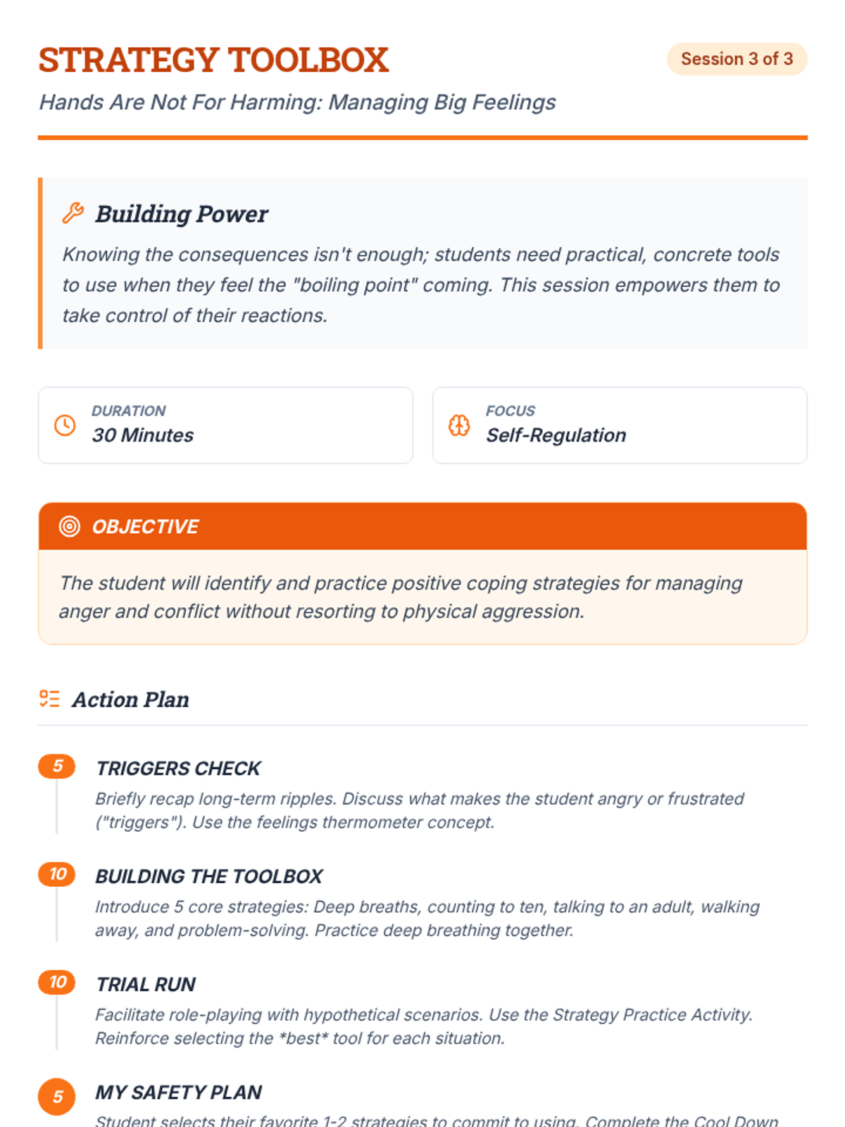 A three-part Tier 3 intervention for 4th graders to understand the consequences of physical aggression and develop self-regulation strategies.