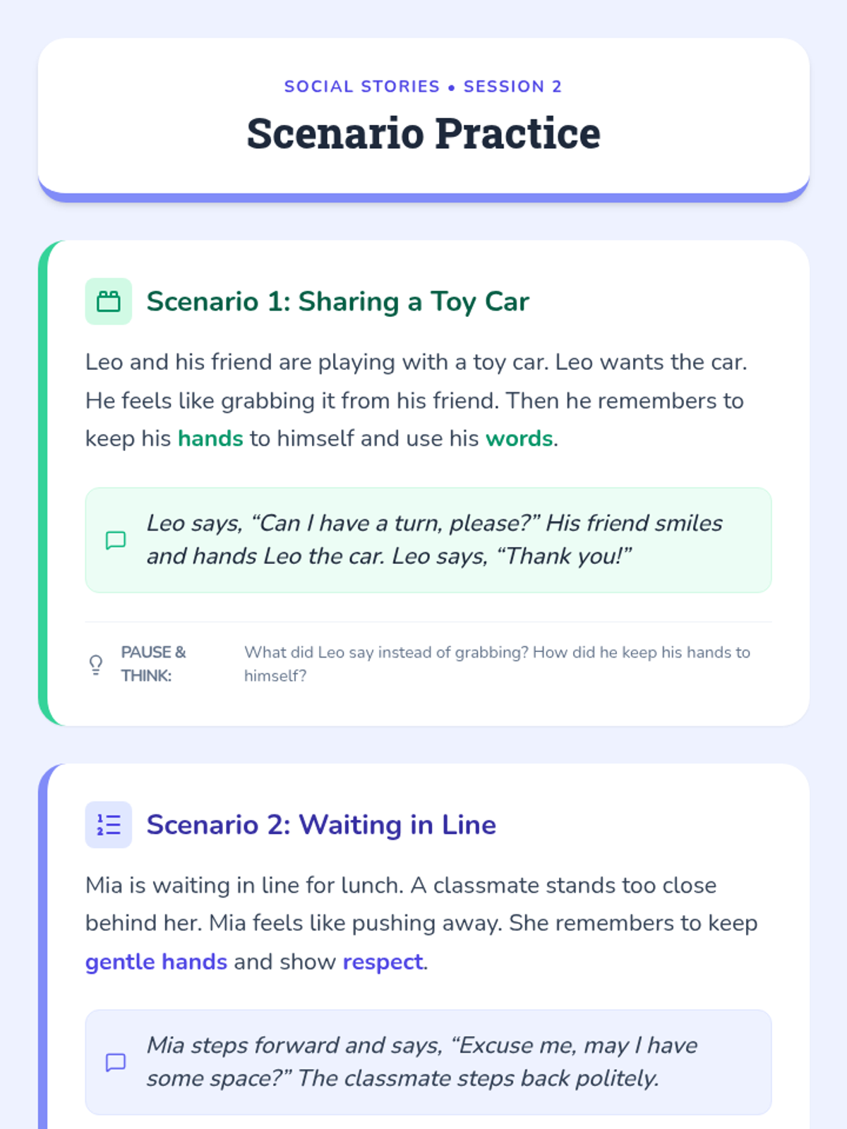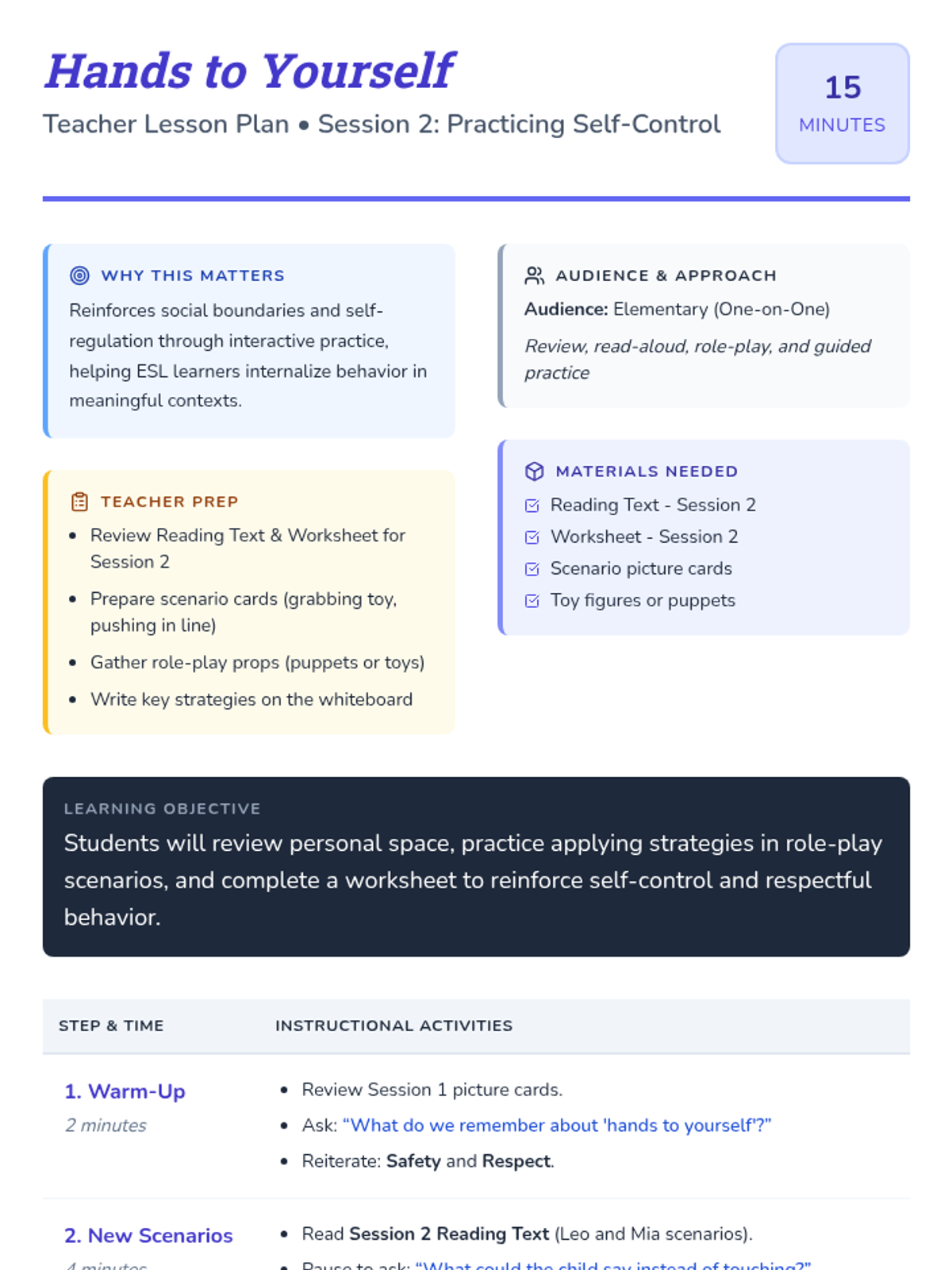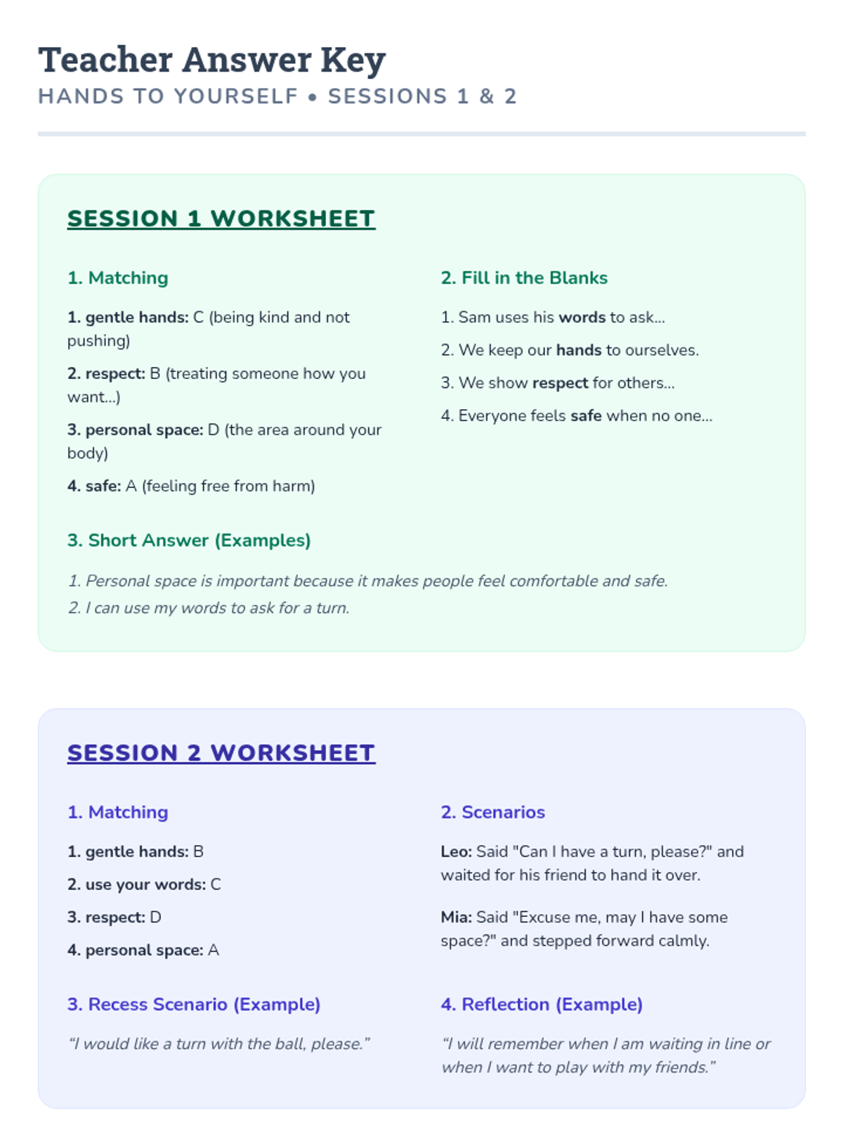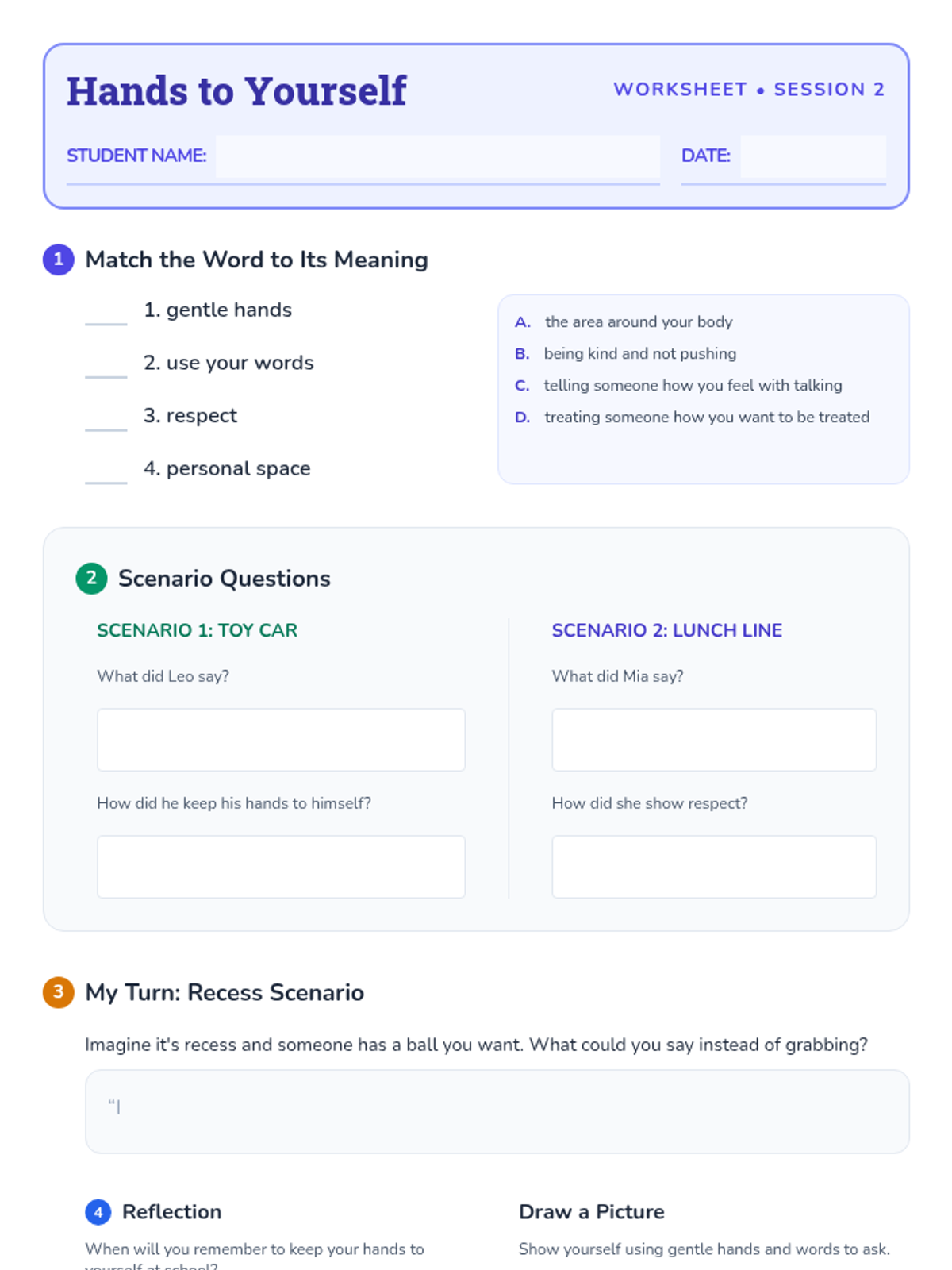A two-session Tier 3 intervention sequence designed to help elementary students understand personal space and develop self-control. This sequence uses simple reading passages and interactive worksheets with ESL-friendly support to teach the importance of keeping hands to oneself.