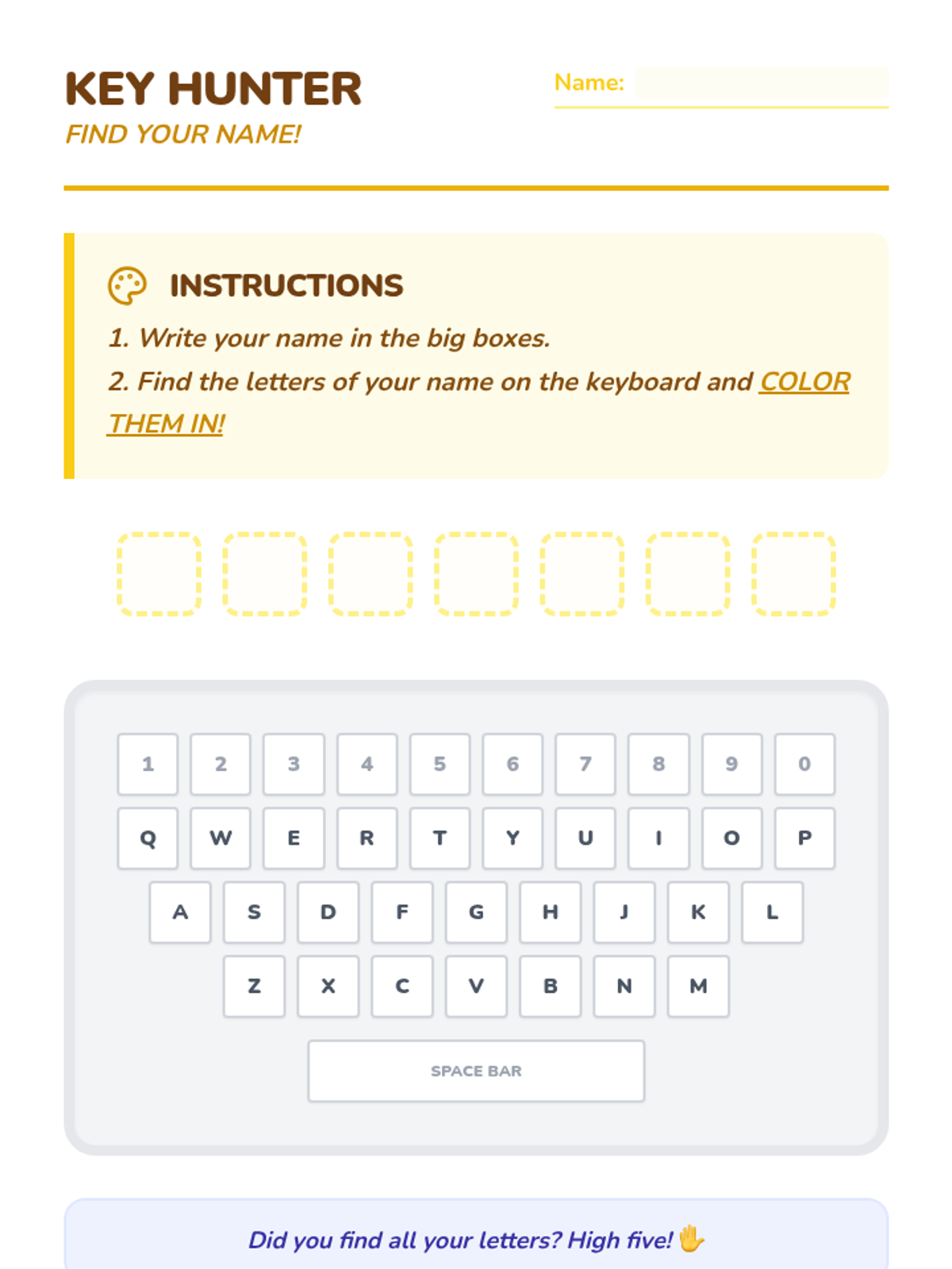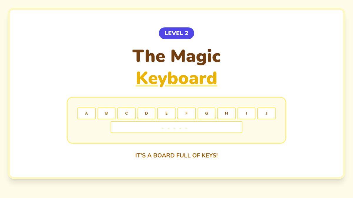 A Pre-K sequence introducing the keyboard as a tool for letters and numbers. Students learn the layout, locate their own initials, understand the space bar's function, identify numbers, and learn the 'action' of the Enter key through play and exploration.