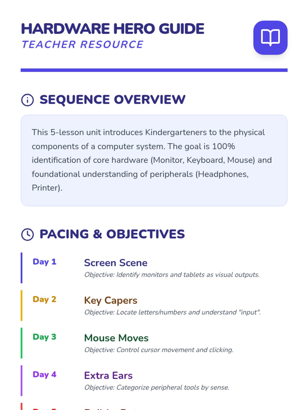 This sequence introduces Kindergarten students to the physical components of computers and tablets through tactile exploration and observation. Students learn to identify hardware parts and practice responsible equipment handling through the 'Tech Detectives' theme.