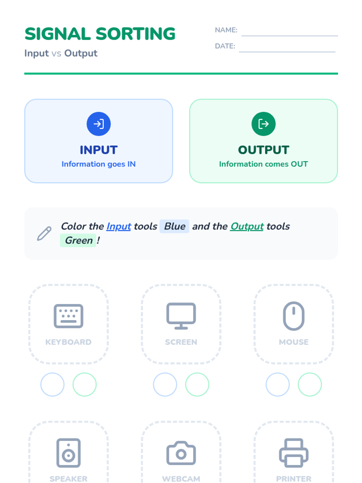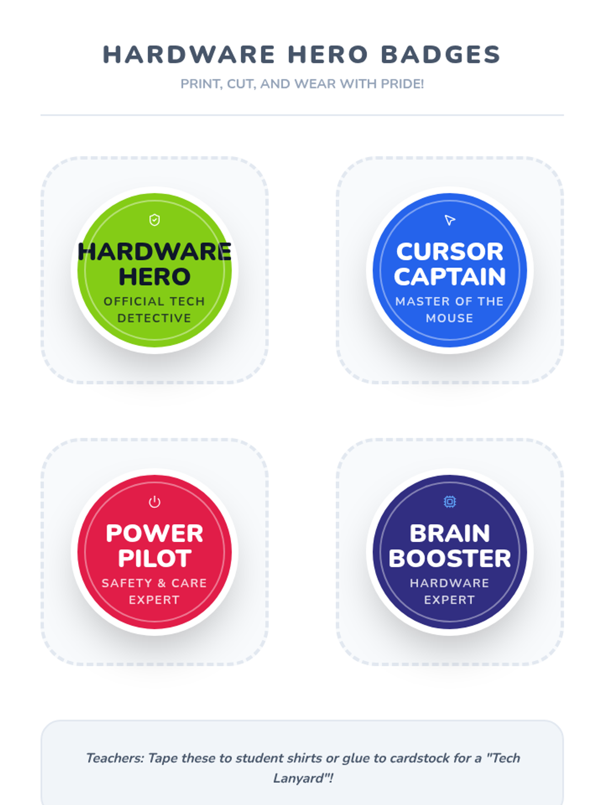 This sequence introduces 1st-grade students to physical computing hardware, teaching them to identify parts, understand input and output, master mouse/touch controls, and manage device power safely.