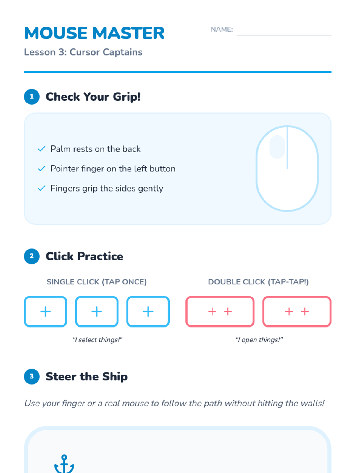 A comprehensive 1st-grade sequence focused on developing mouse and trackpad proficiency through the theme of 'Pixel Pilots.' Students learn cursor control, clicking mechanics, drag-and-drop operations, and window management.