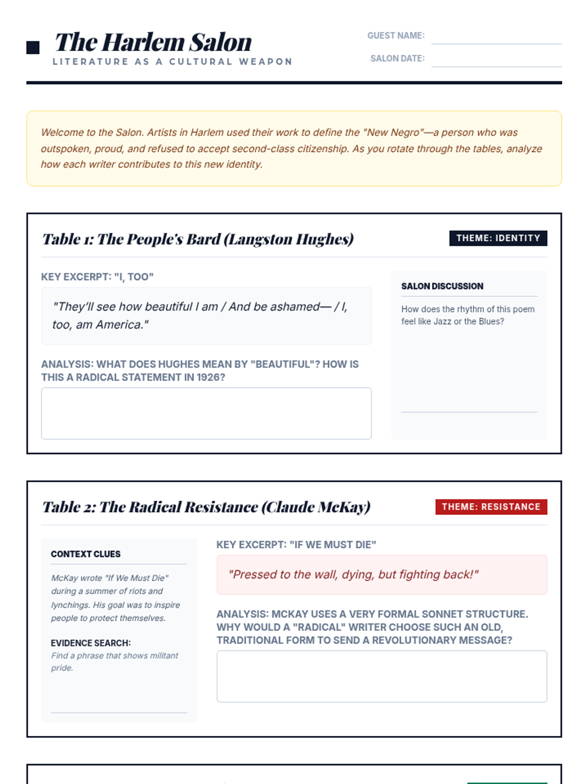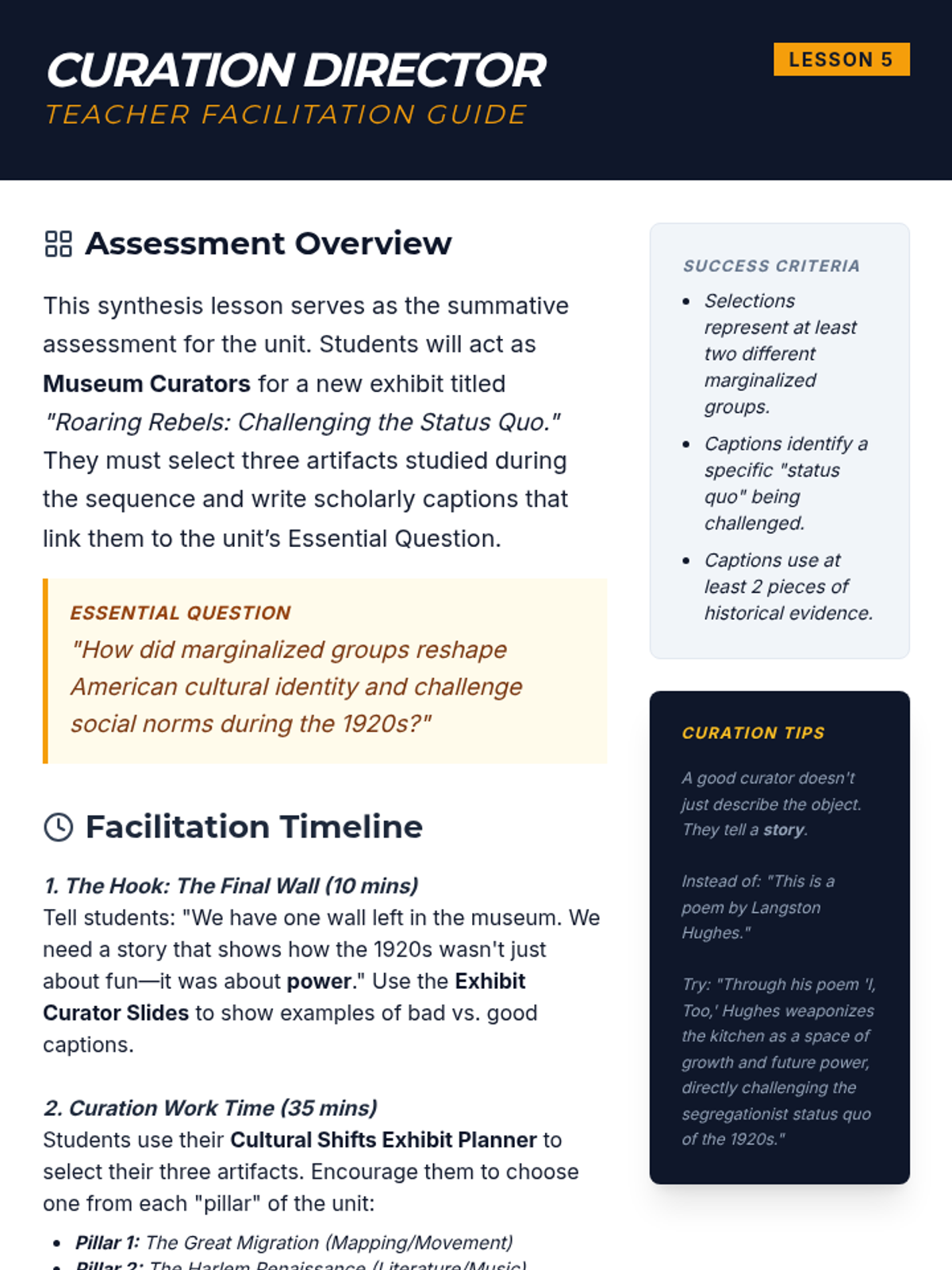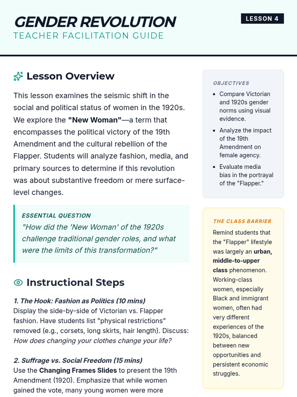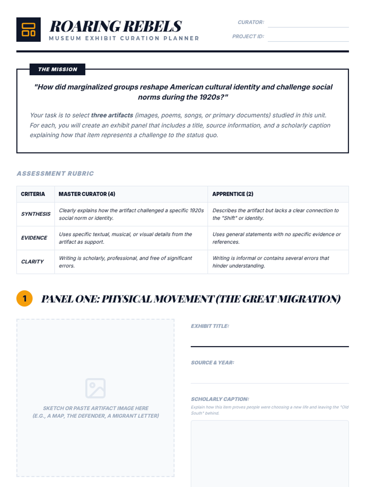 This unit explores the transformative cultural movements of the 1920s, focusing on the Harlem Renaissance and the evolving social roles of women. Students analyze how the Great Migration, jazz, literature, and the suffrage movement collectively redefined American identity.