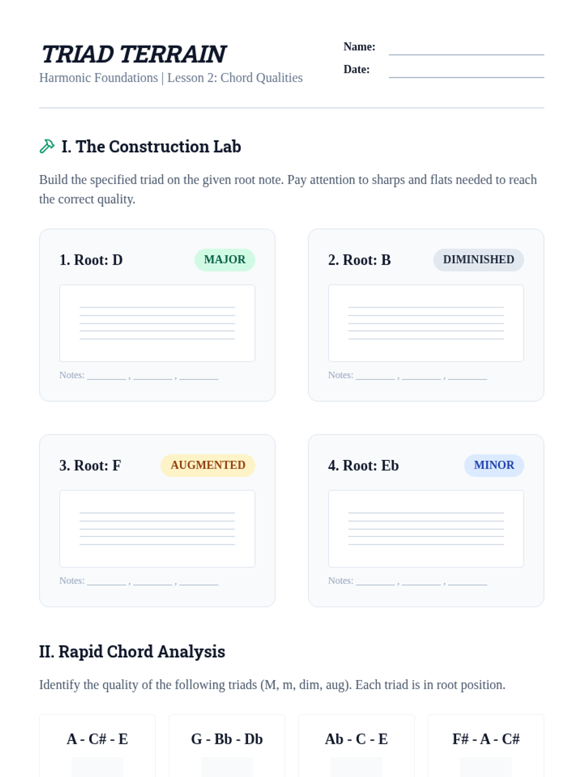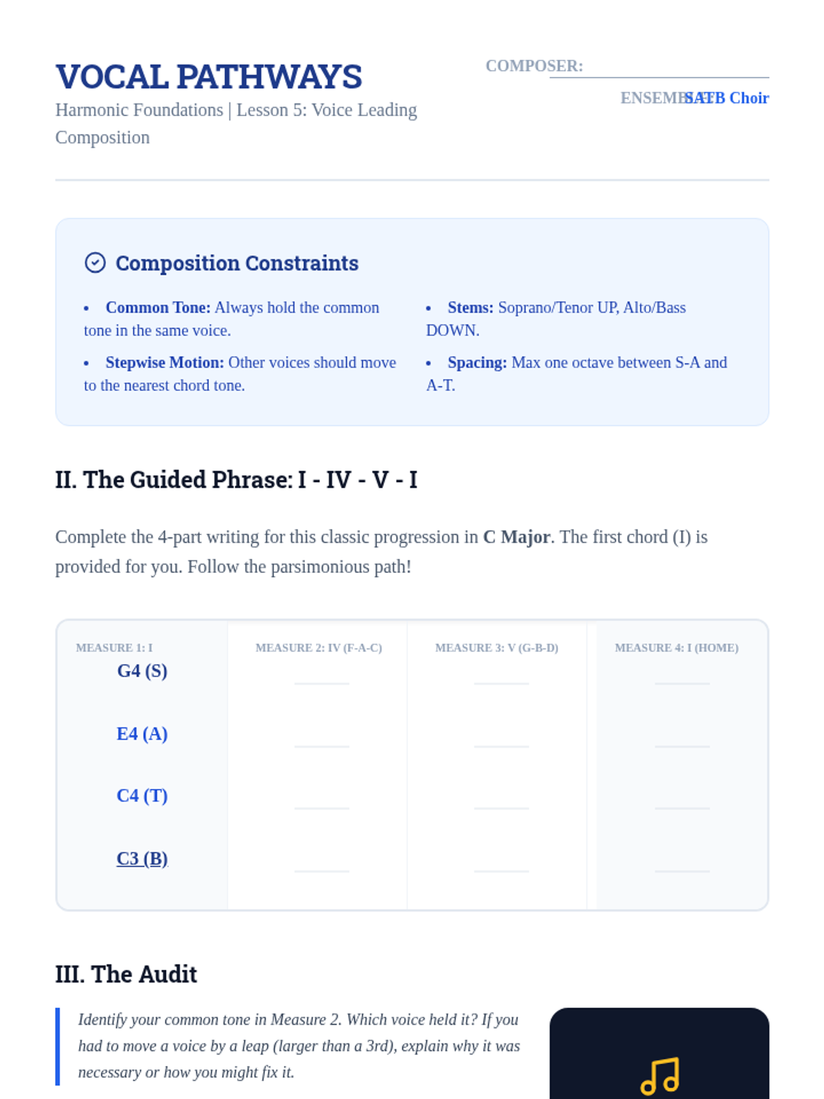A rigorous sequence on music theory, covering intervals, triads, seventh chords, Roman numeral analysis, and four-part voice leading for 12th-grade students.
