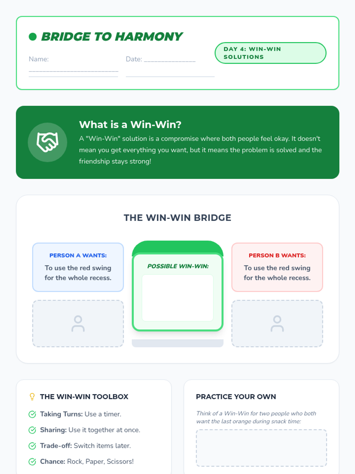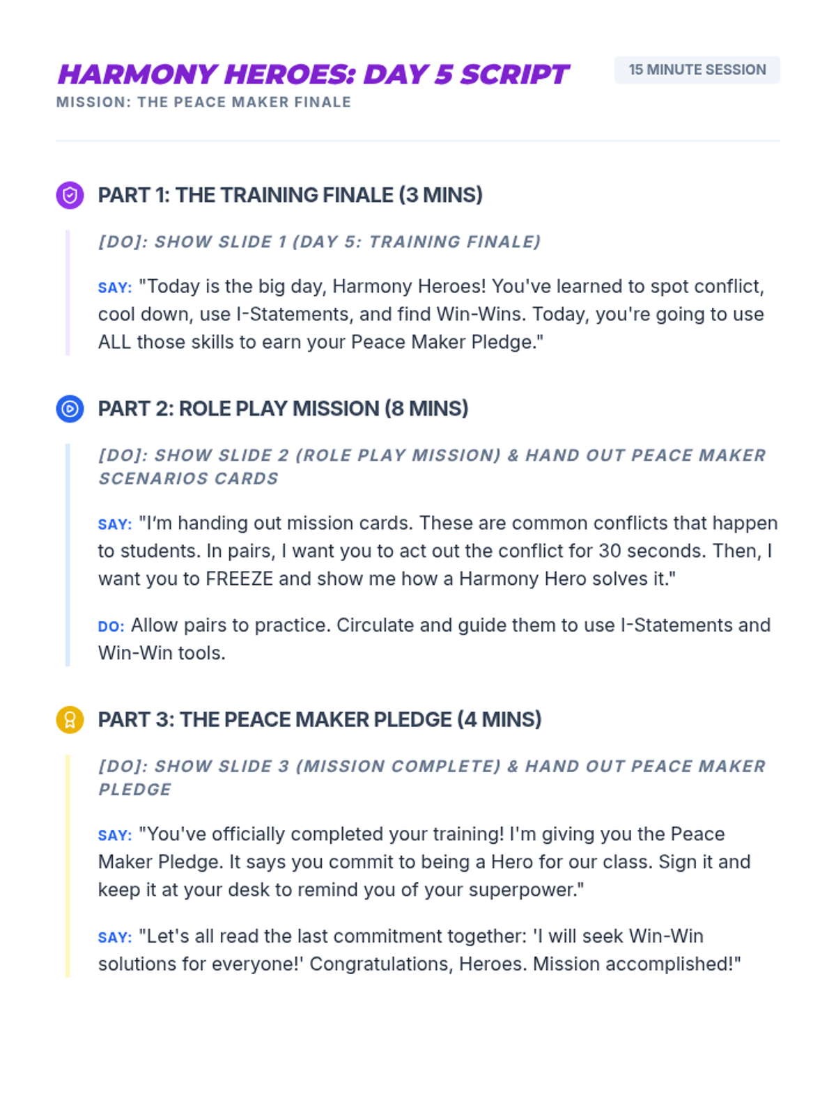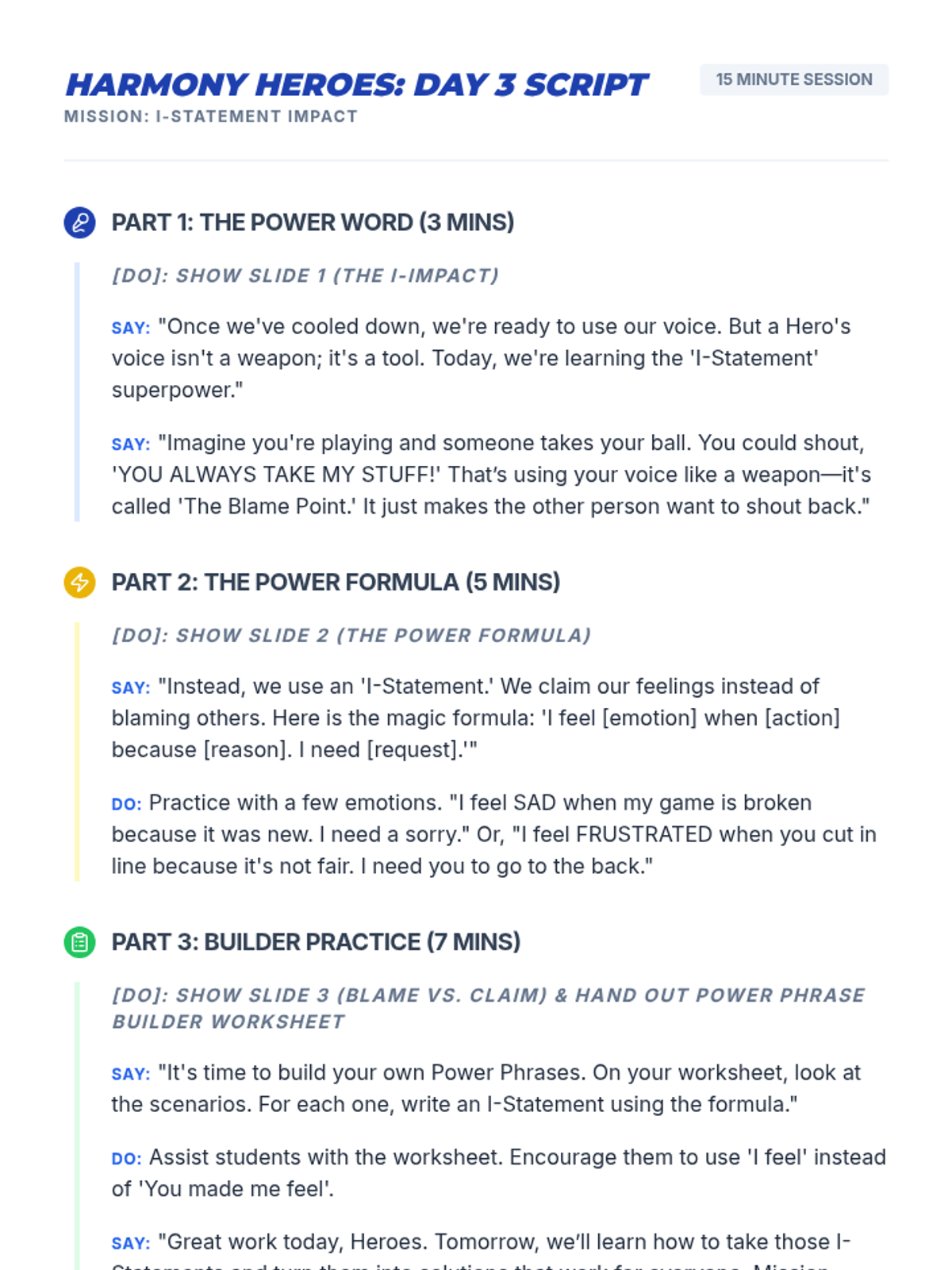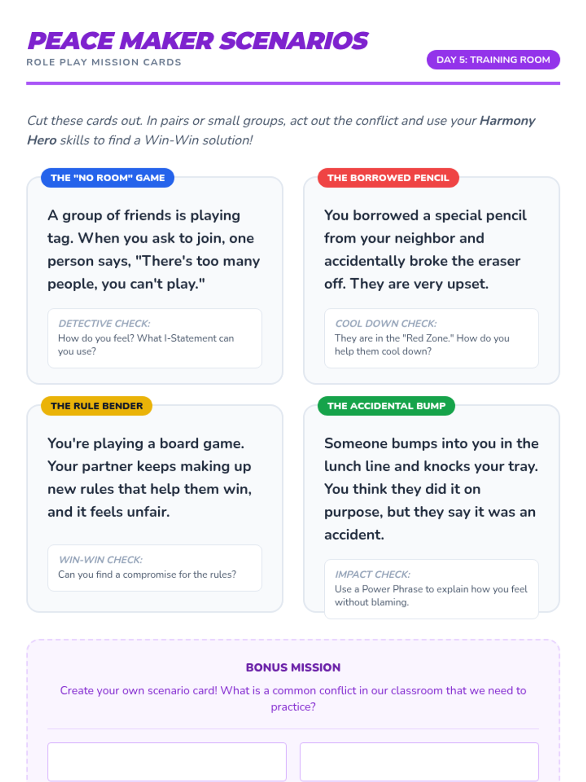 A 5-day series of 15-minute 'power sessions' teaching 3rd-4th graders how to identify, de-escalate, and resolve conflicts using 'I' statements and win-win solutions.
