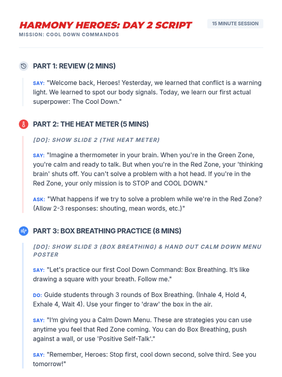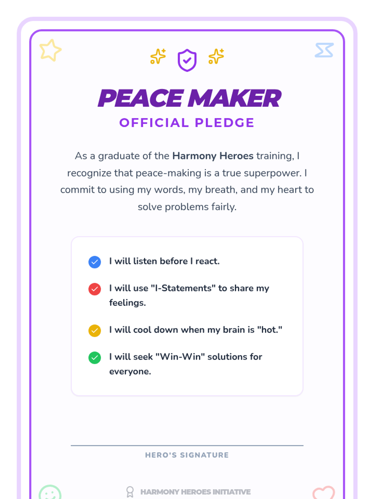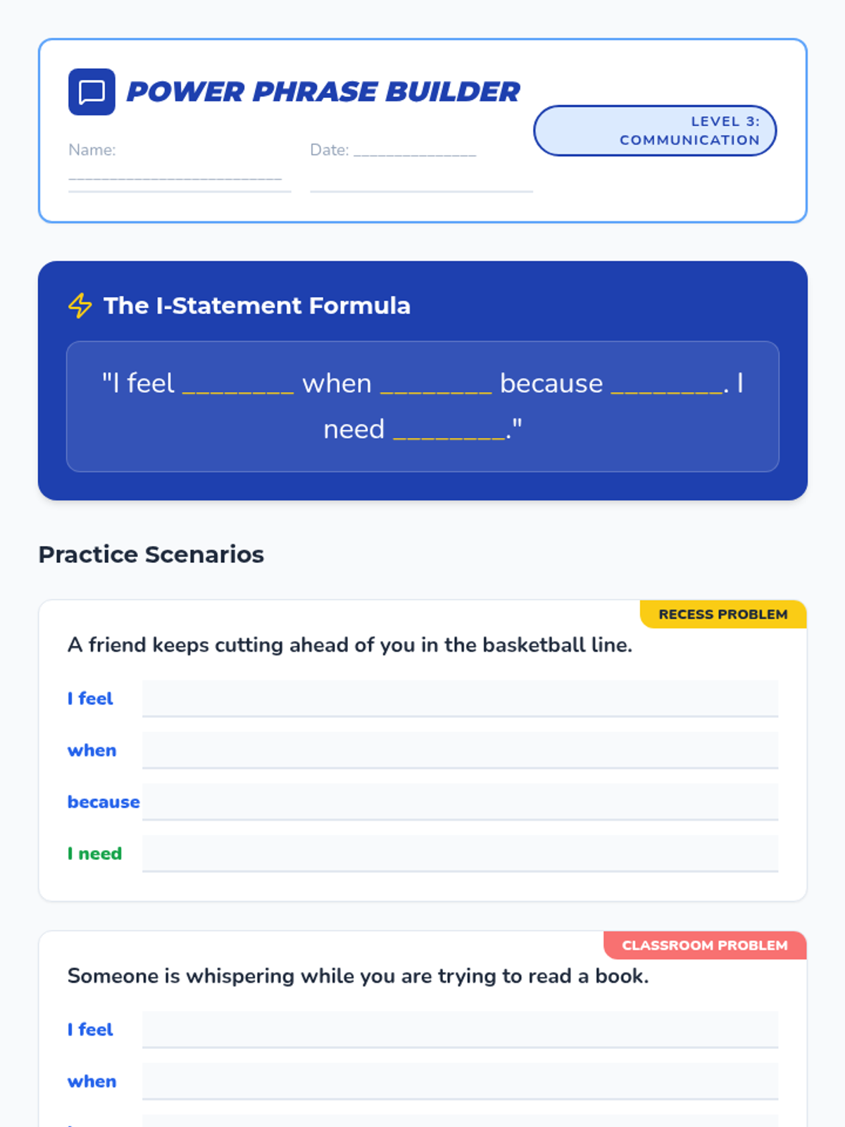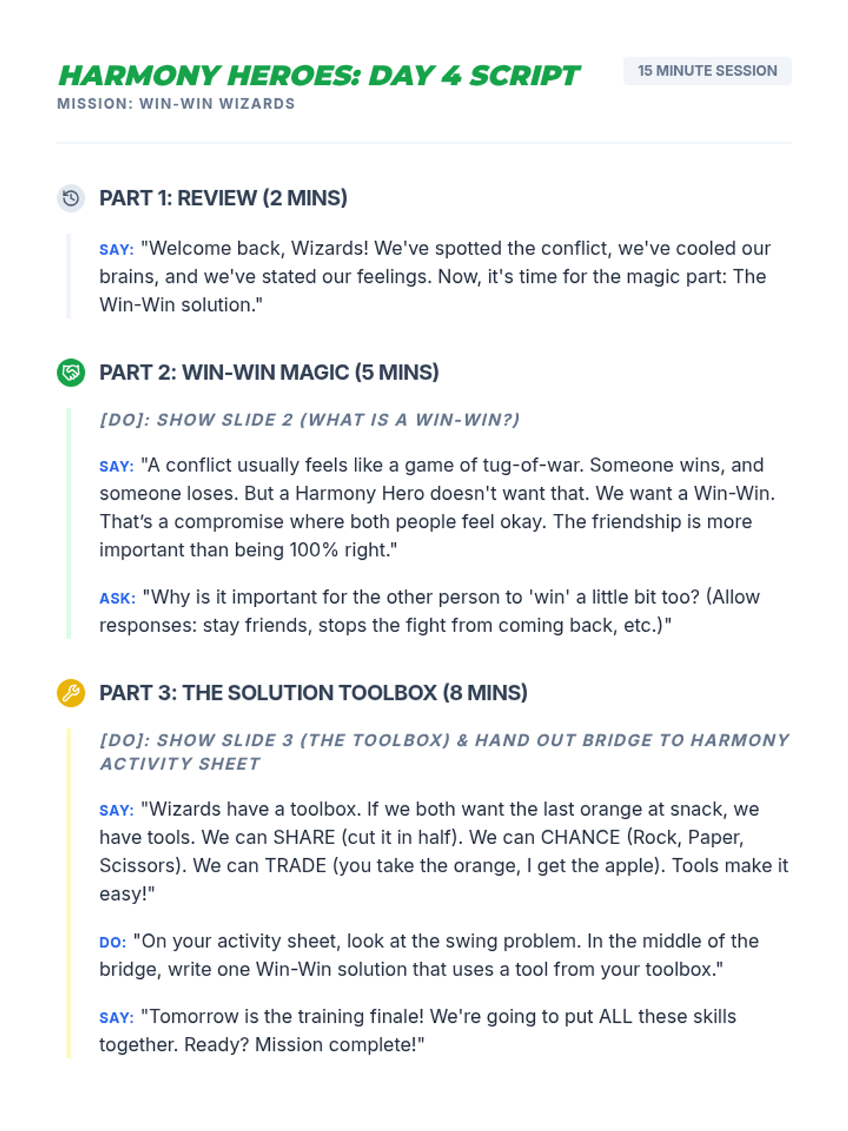 A 5-day series of 15-minute 'power sessions' teaching 3rd-4th graders how to identify, de-escalate, and resolve conflicts using 'I' statements and win-win solutions.
