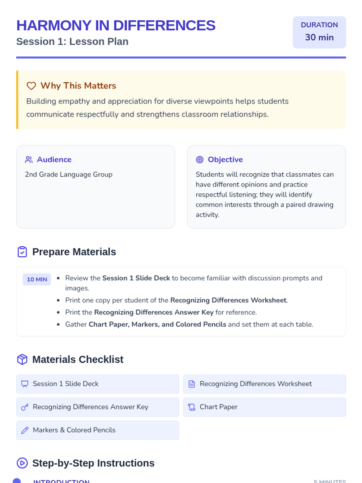 A 2-session interactive sequence for second graders to learn empathy, respect diverse opinions (specifically music), and resolve conflicts through active listening and collaboration.