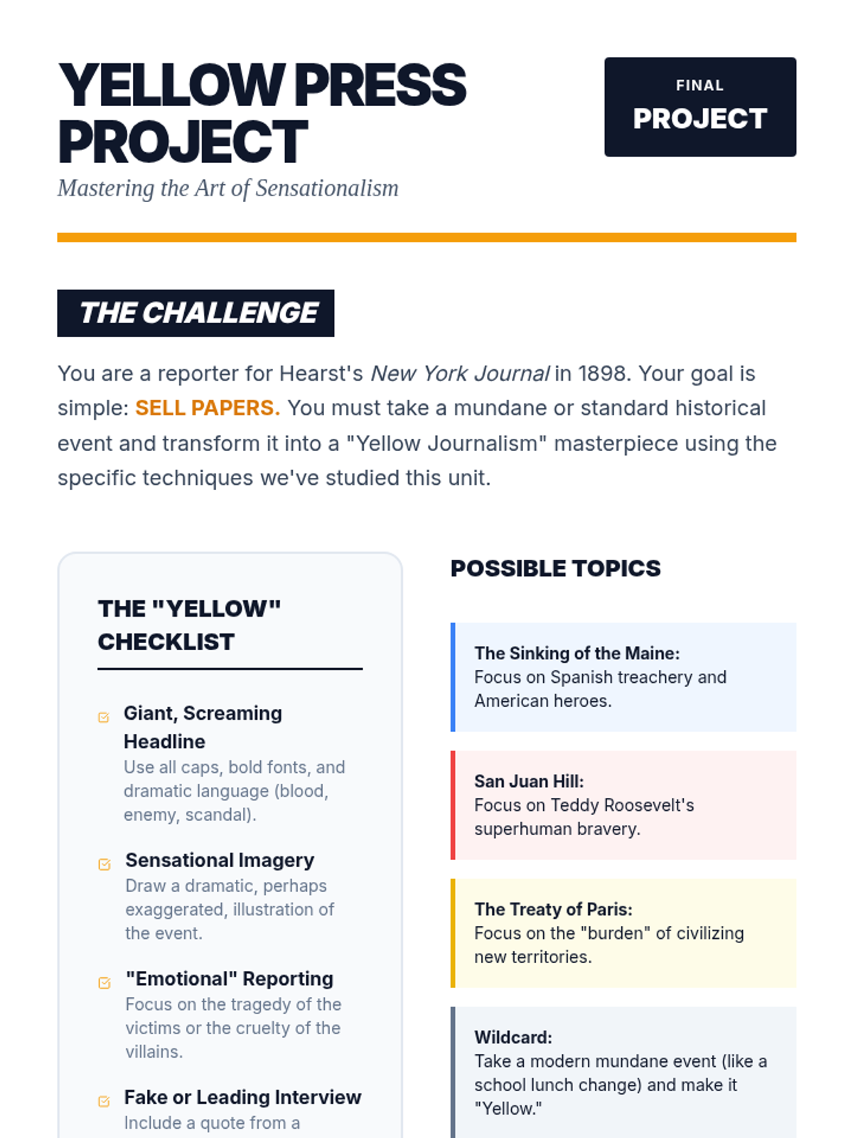 A 9th-grade history unit exploring the role of sensationalist media and the Spanish-American War in shaping American foreign policy. Students analyze Yellow Journalism, the sinking of the USS Maine, and the geopolitical consequences of the Treaty of Paris.