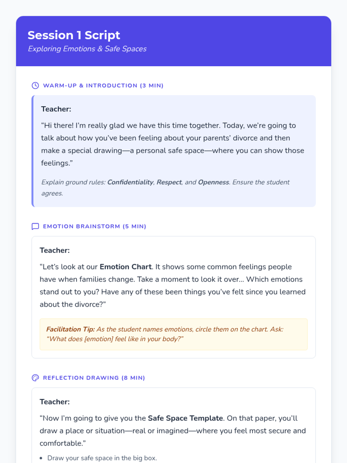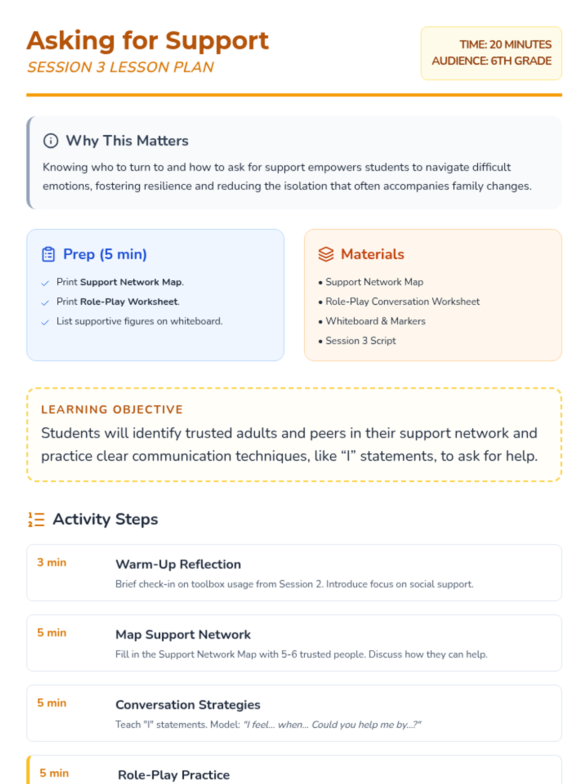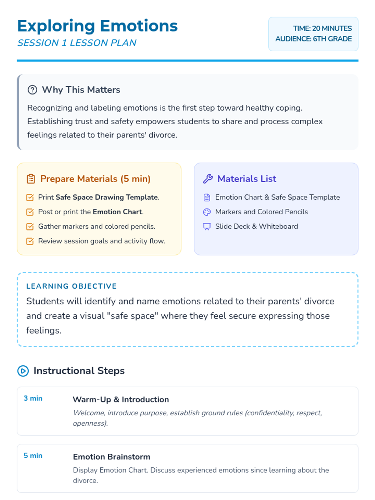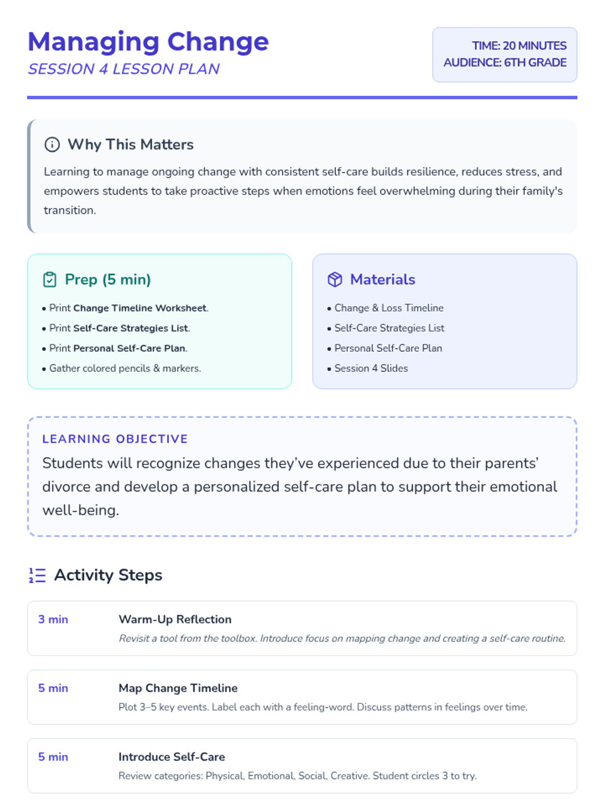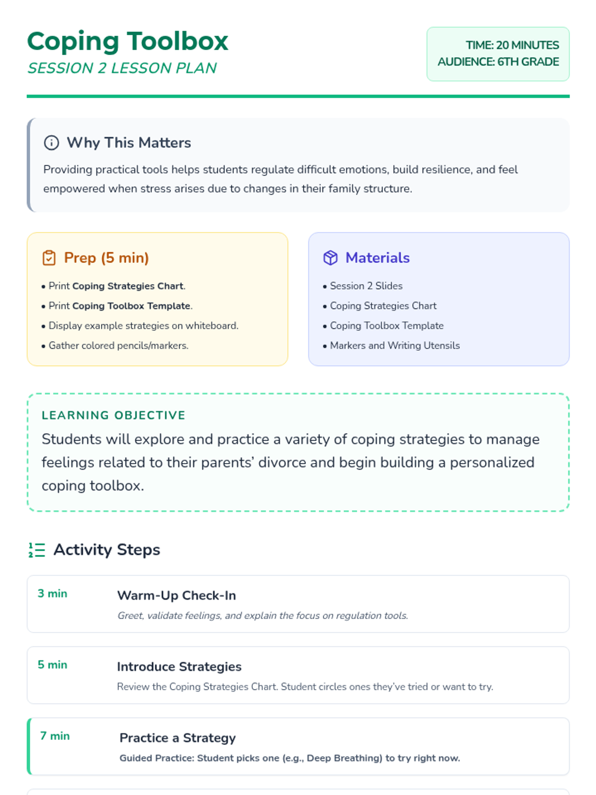 This 5-session Tier 3 series helps individual 6th grade students develop coping skills for navigating life with divorced parents. Each session builds emotional awareness, resilience, and practical strategies in a supportive one-on-one setting.