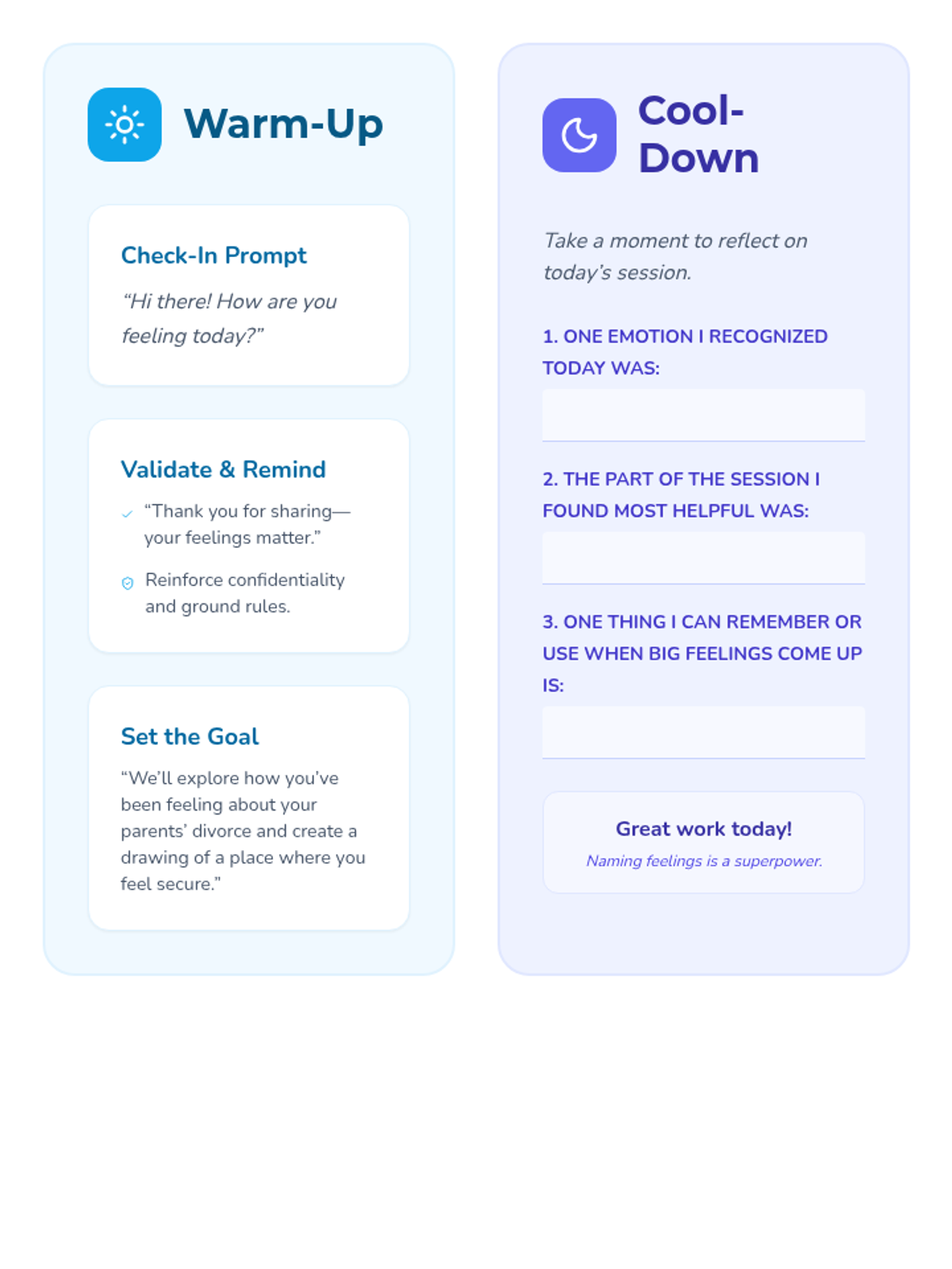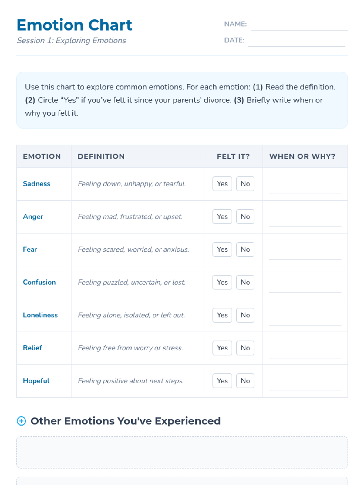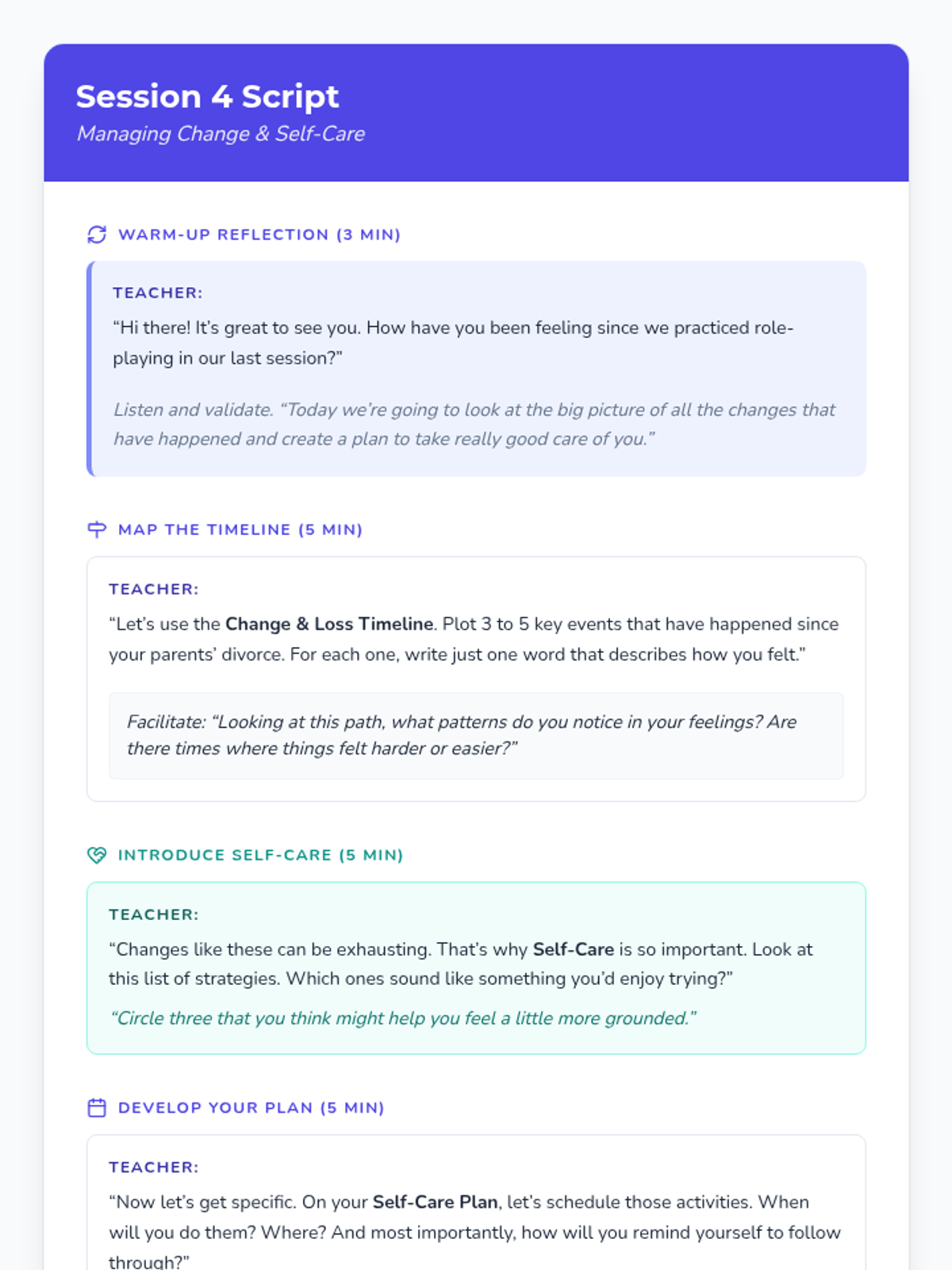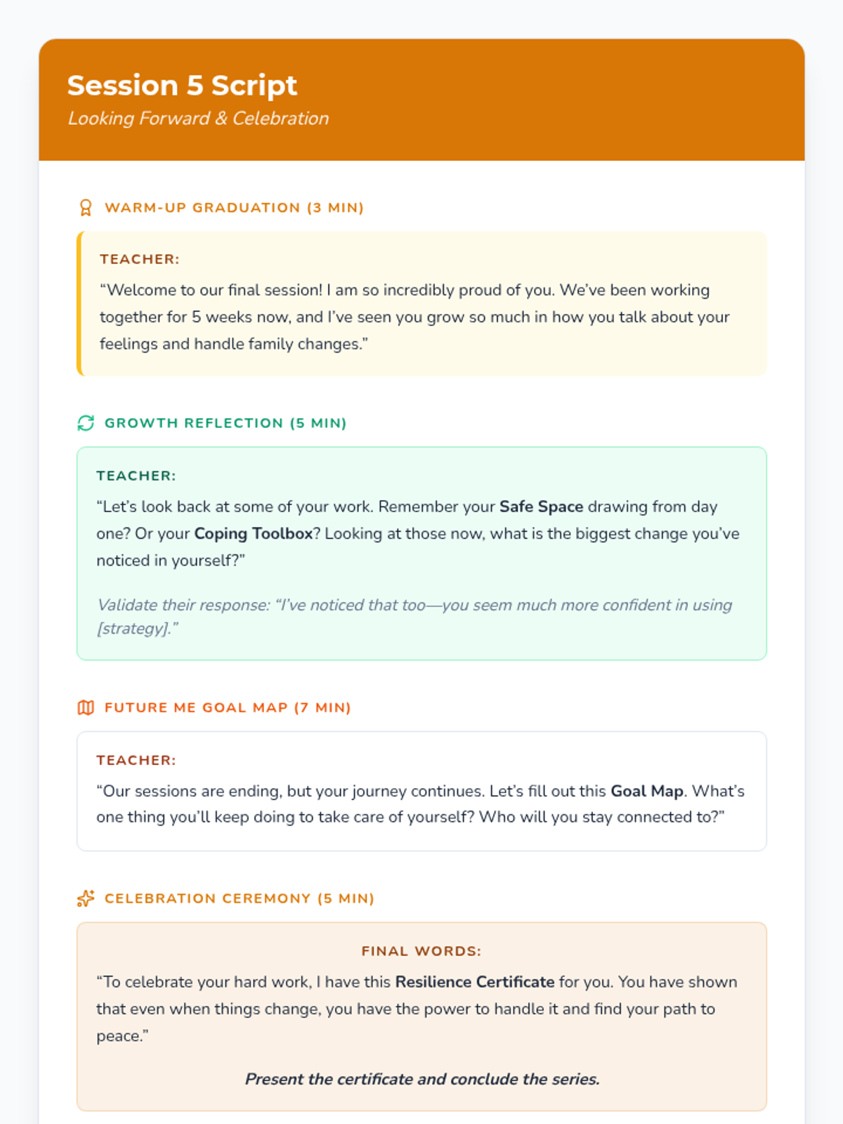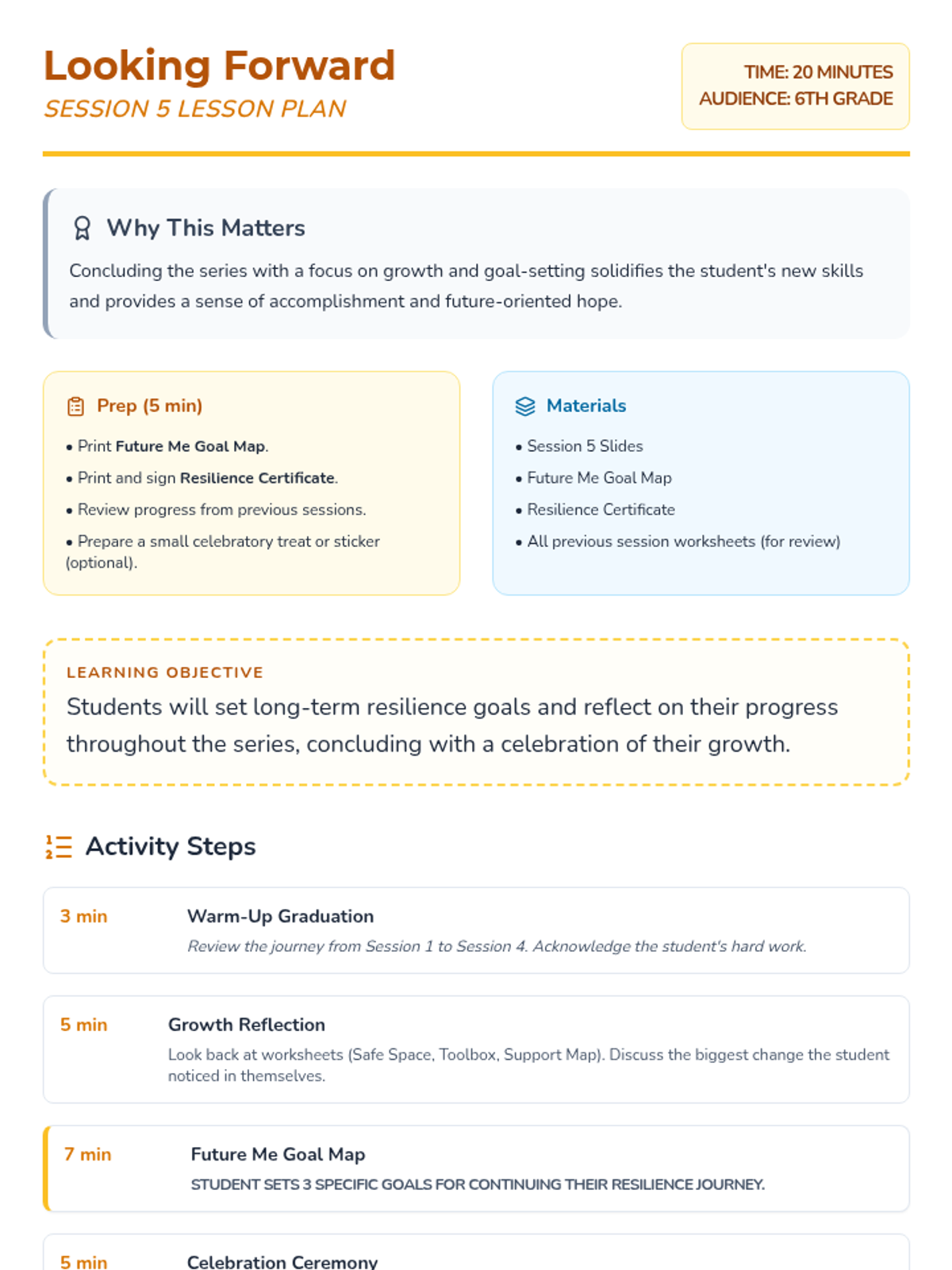 This 5-session Tier 3 series helps individual 6th grade students develop coping skills for navigating life with divorced parents. Each session builds emotional awareness, resilience, and practical strategies in a supportive one-on-one setting.