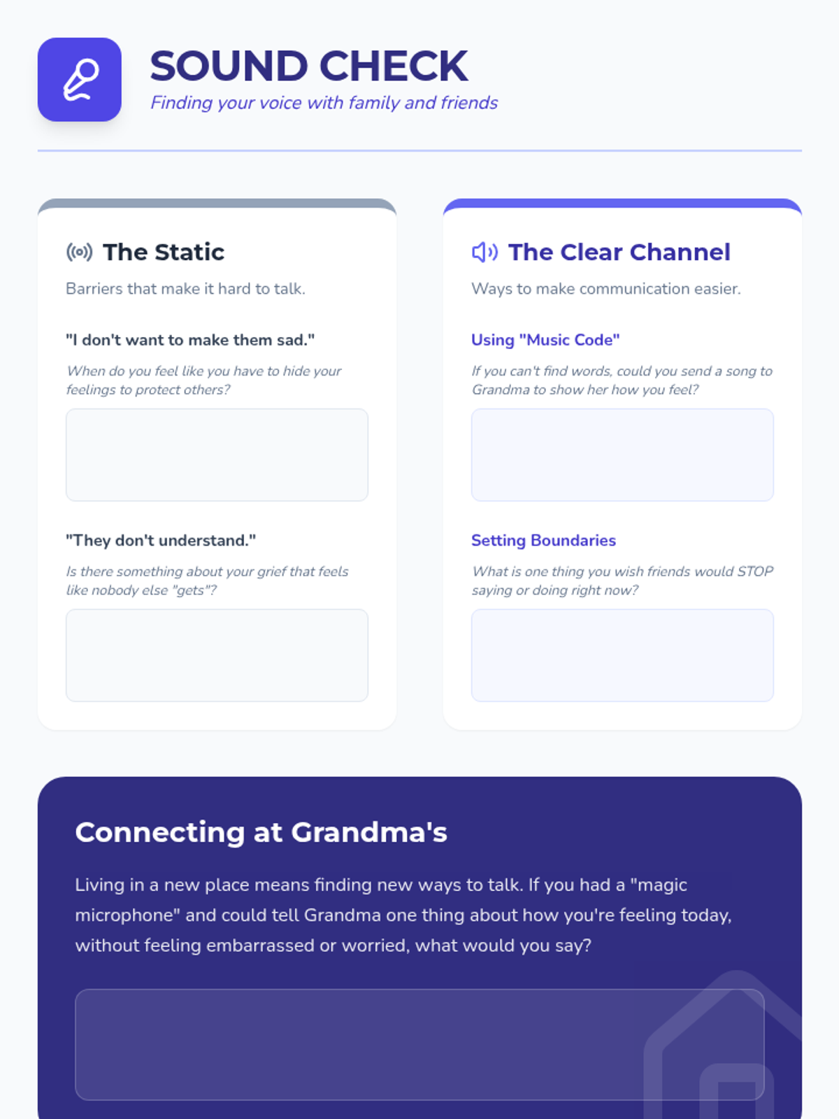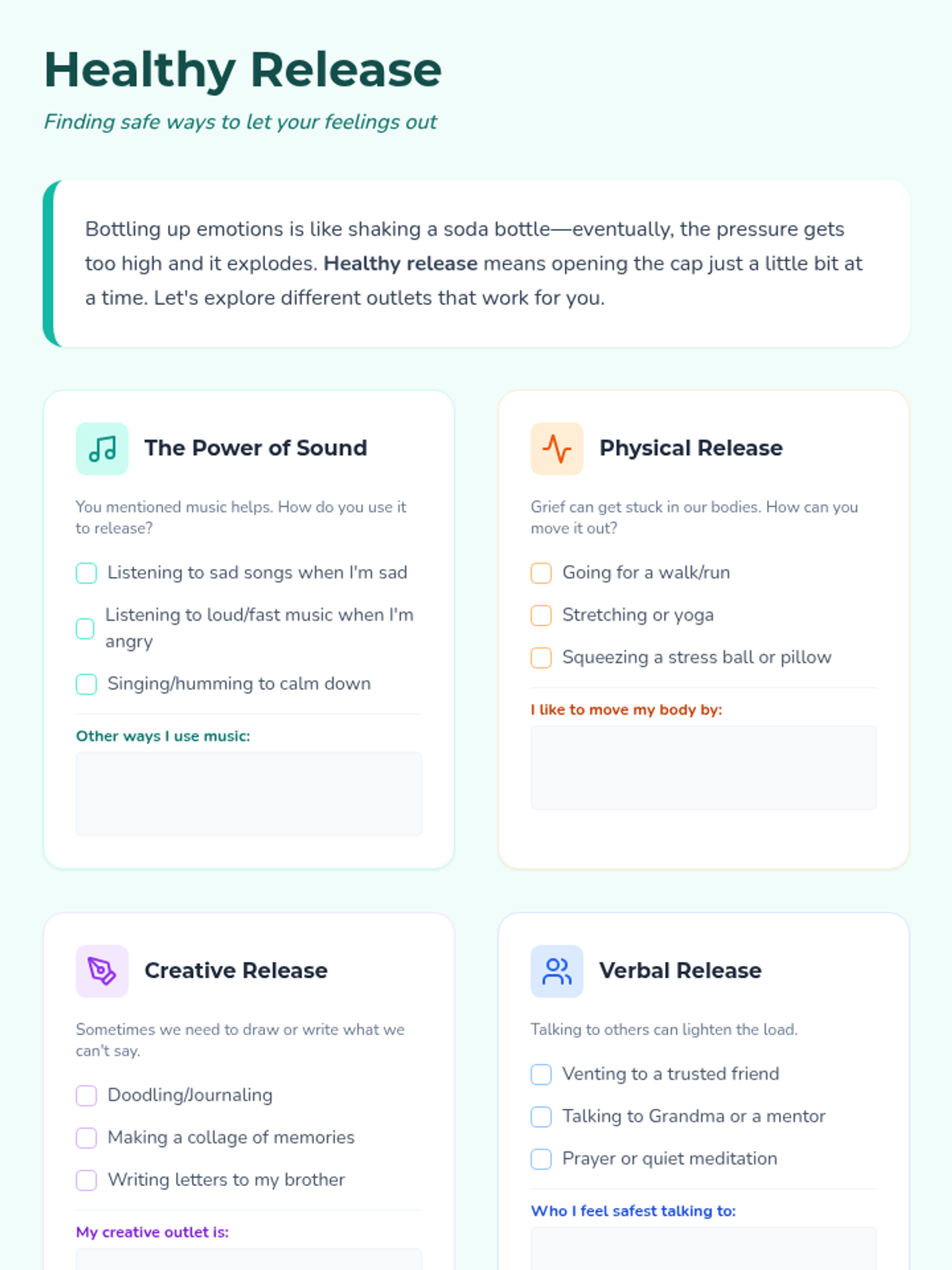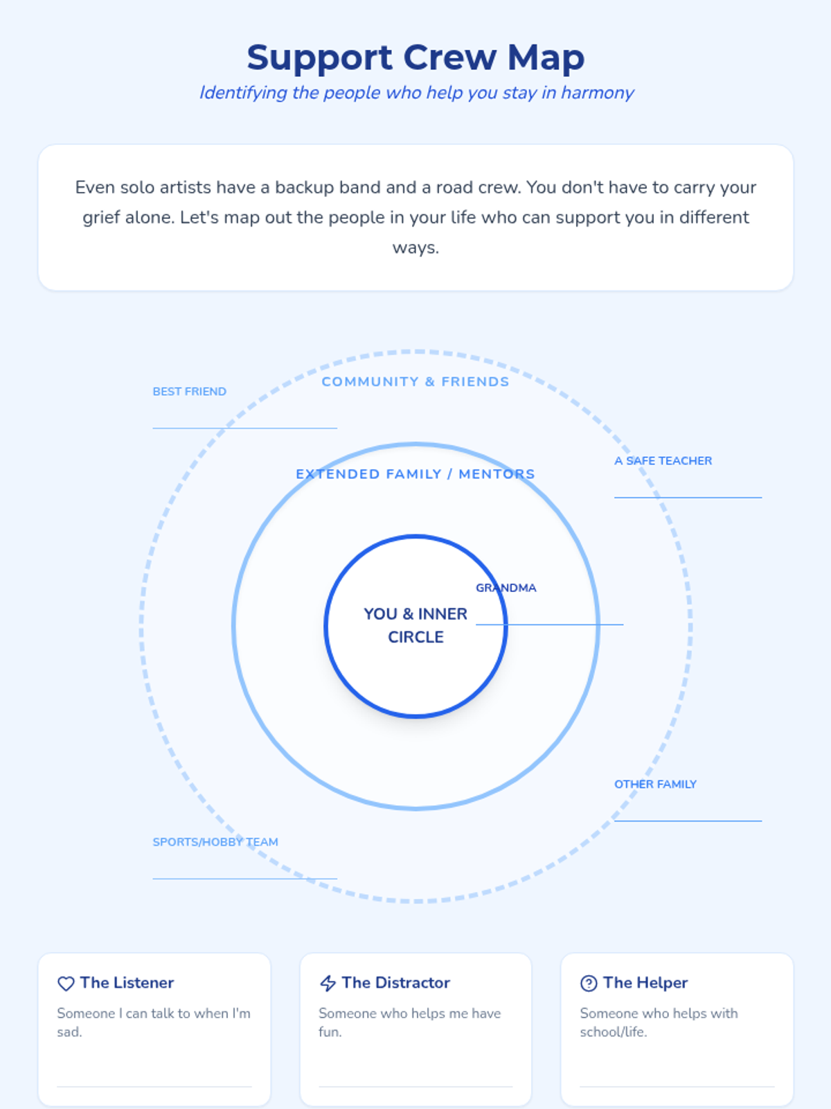 A four-part therapeutic series designed for a 7th-grade student navigating the complex grief of losing a sibling. The sequence uses a music-inspired 'Healing Harmony' theme to explore the non-linear nature of loss, manage intense emotions, improve communication with caregivers, and find meaningful ways to remember and heal.