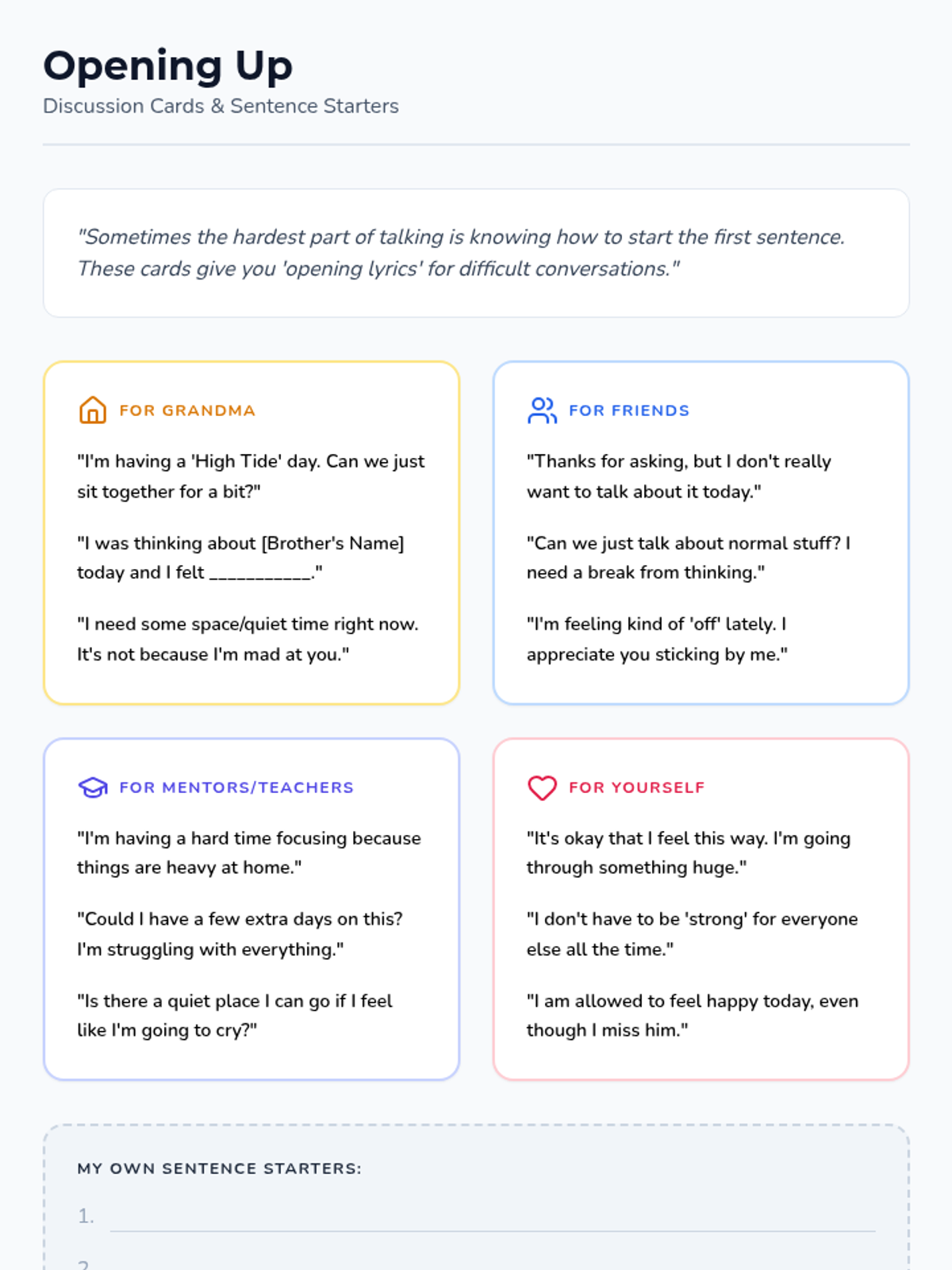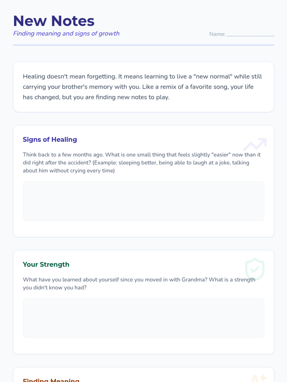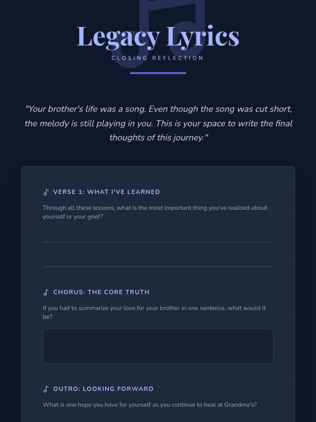 A four-part therapeutic series designed for a 7th-grade student navigating the complex grief of losing a sibling. The sequence uses a music-inspired 'Healing Harmony' theme to explore the non-linear nature of loss, manage intense emotions, improve communication with caregivers, and find meaningful ways to remember and heal.