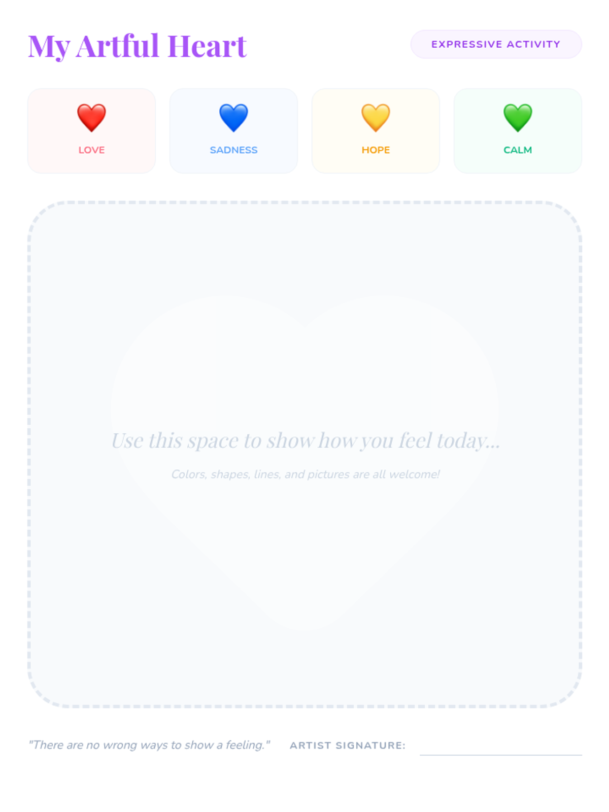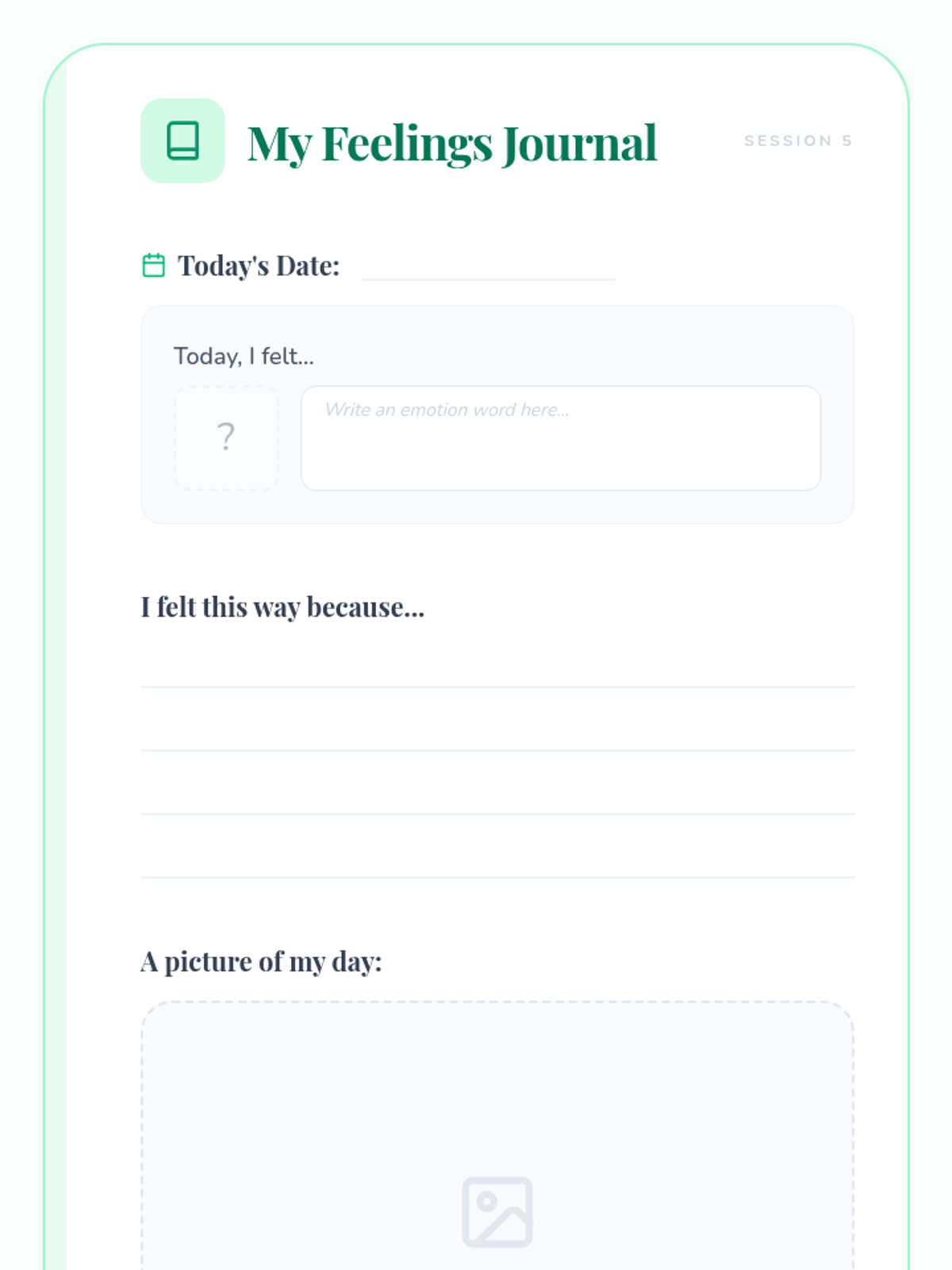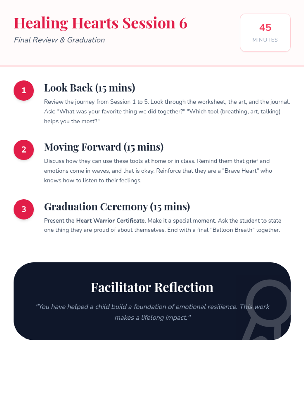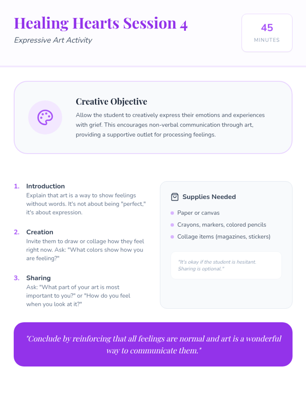 A 6-session therapeutic sequence for 2nd graders to process grief, navigate complex emotions, and develop self-regulation skills through creative play, art, and mindfulness.