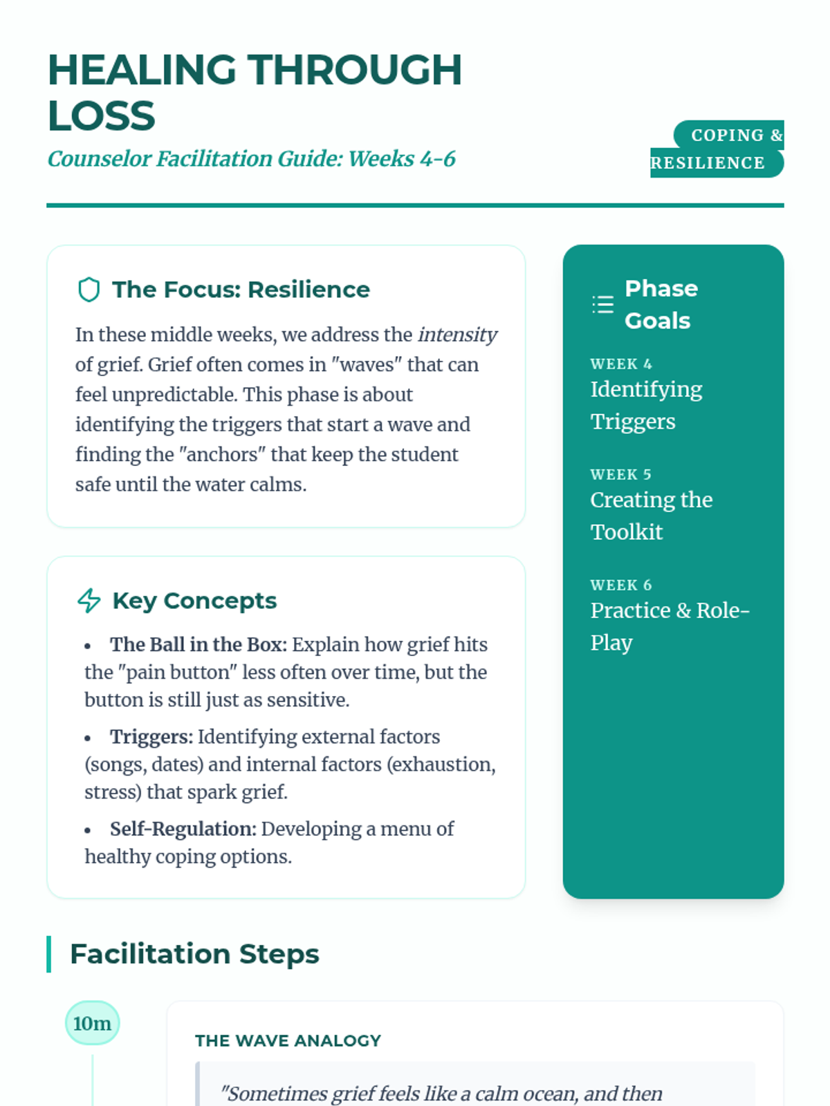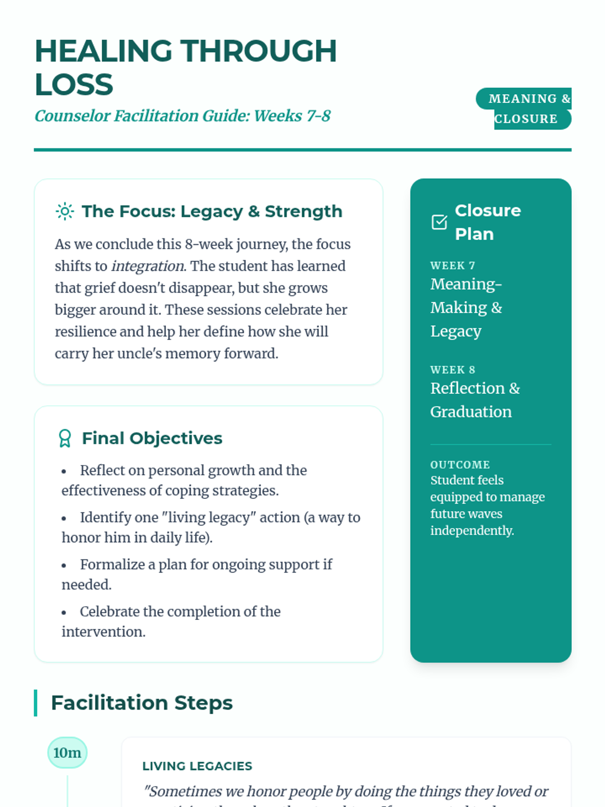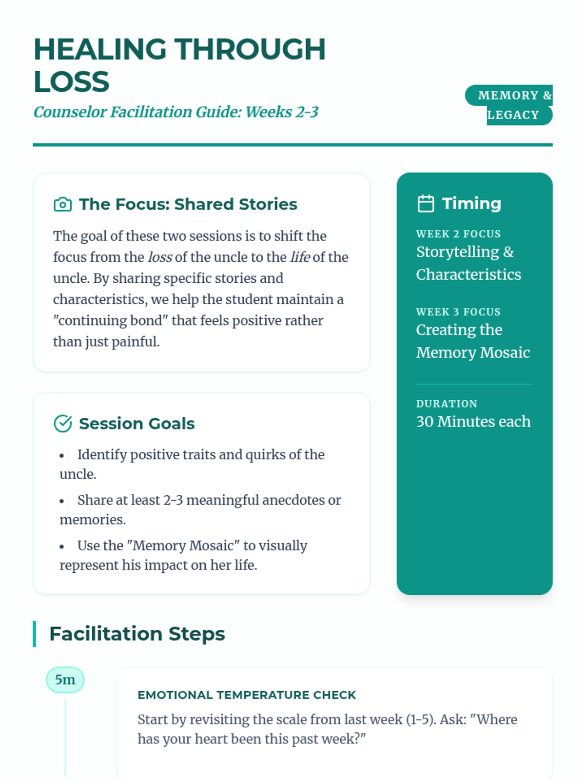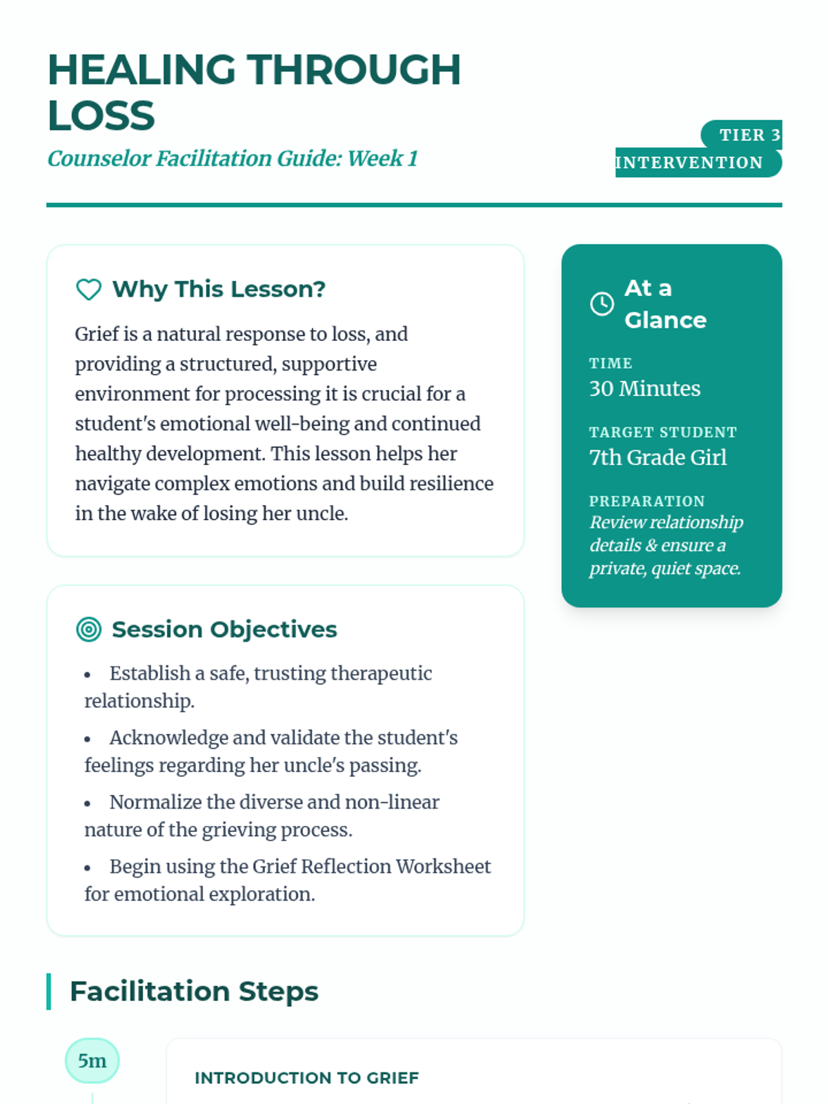 A 6-8 week Tier 3 intervention for a 7th-grade girl processing the loss of her uncle. This sequence provides a structured, supportive journey through understanding grief, honoring memories, and developing resilient coping strategies.