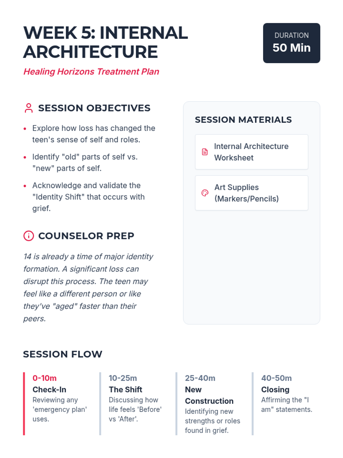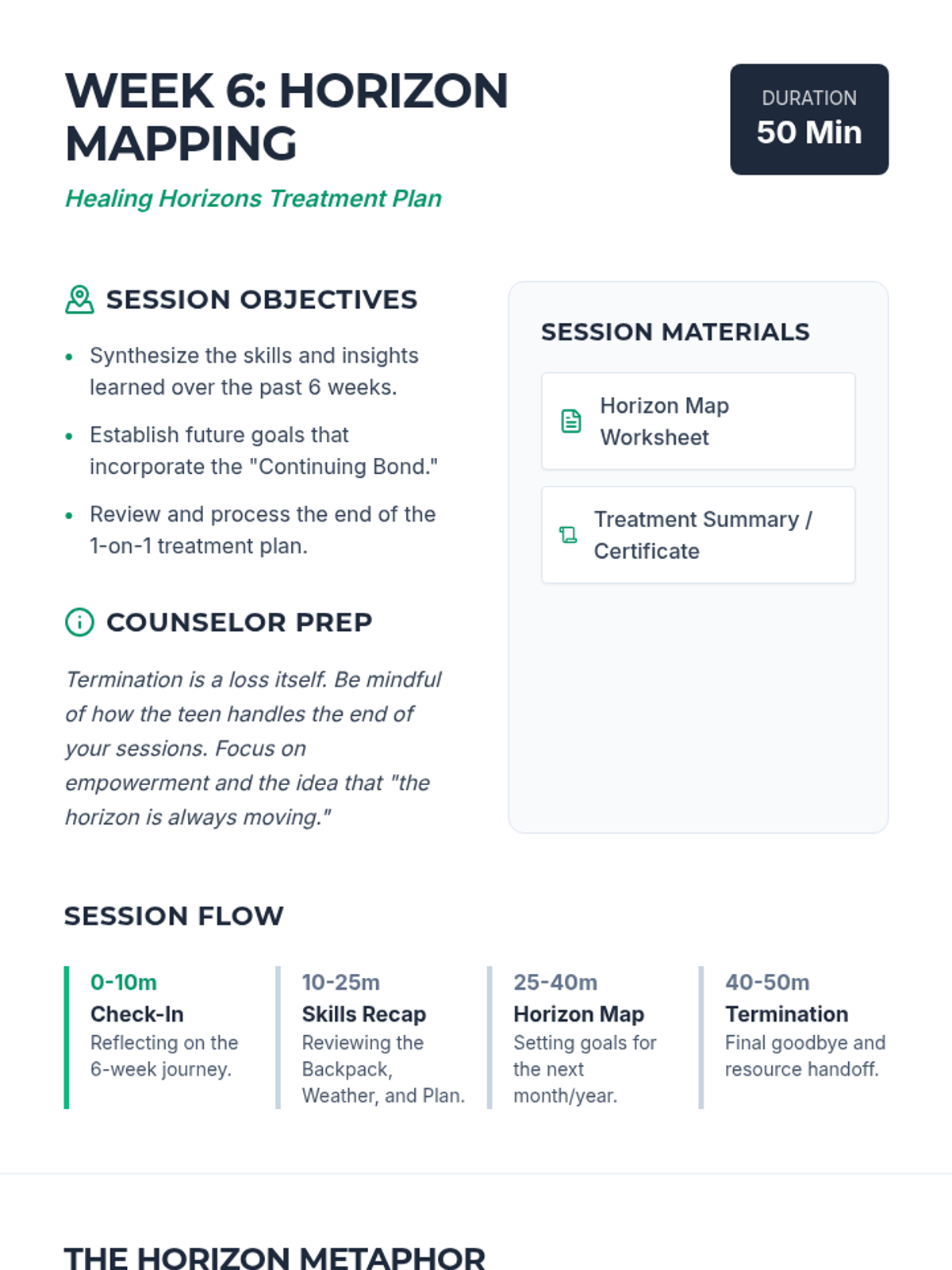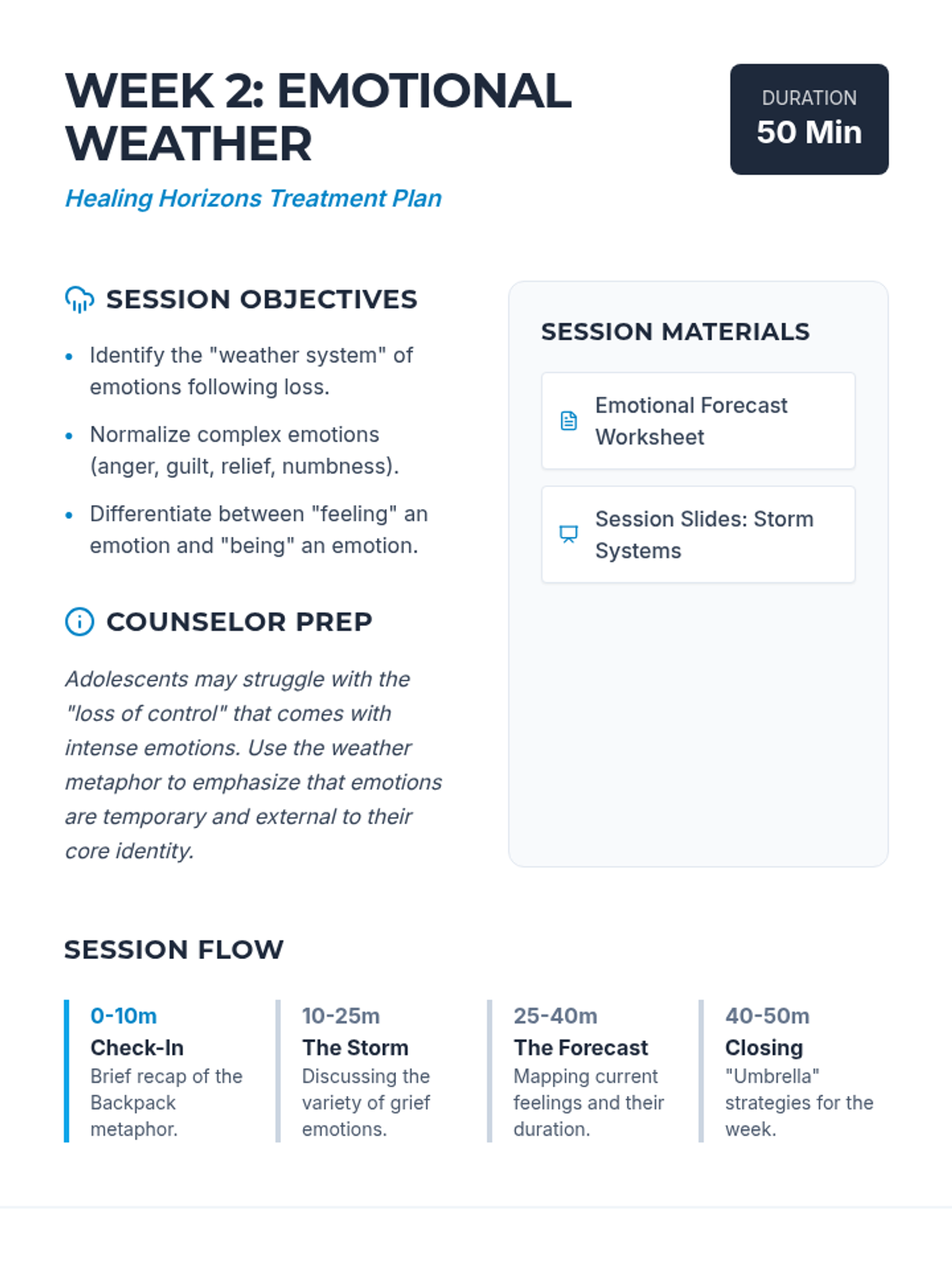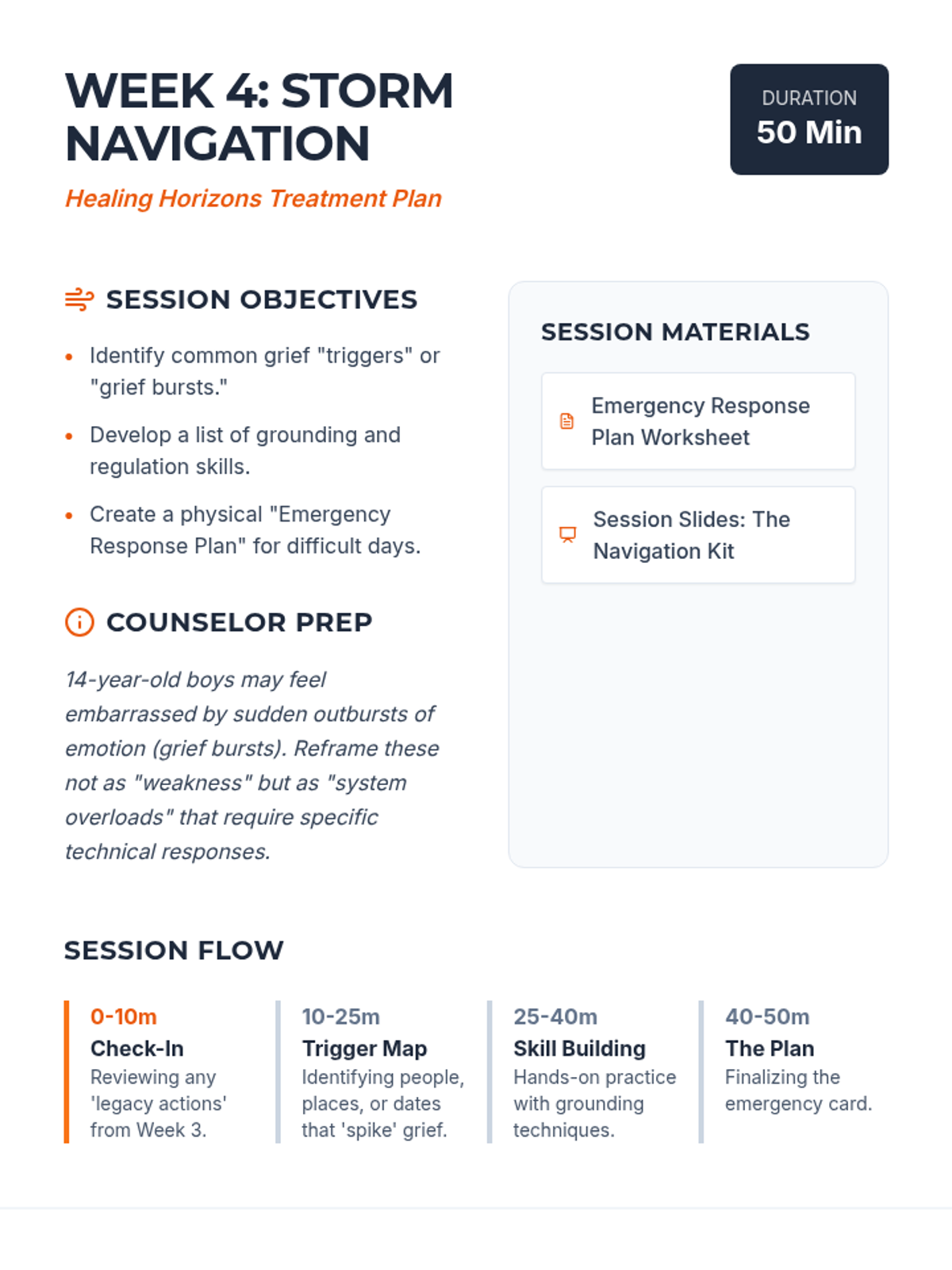 A comprehensive 6-week grief and loss treatment plan designed specifically for adolescent boys. The program, titled 'Healing Horizons,' uses a navigation and exploration metaphor to help teens process their loss, build coping skills, and find a path forward.