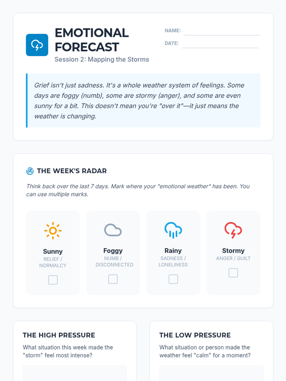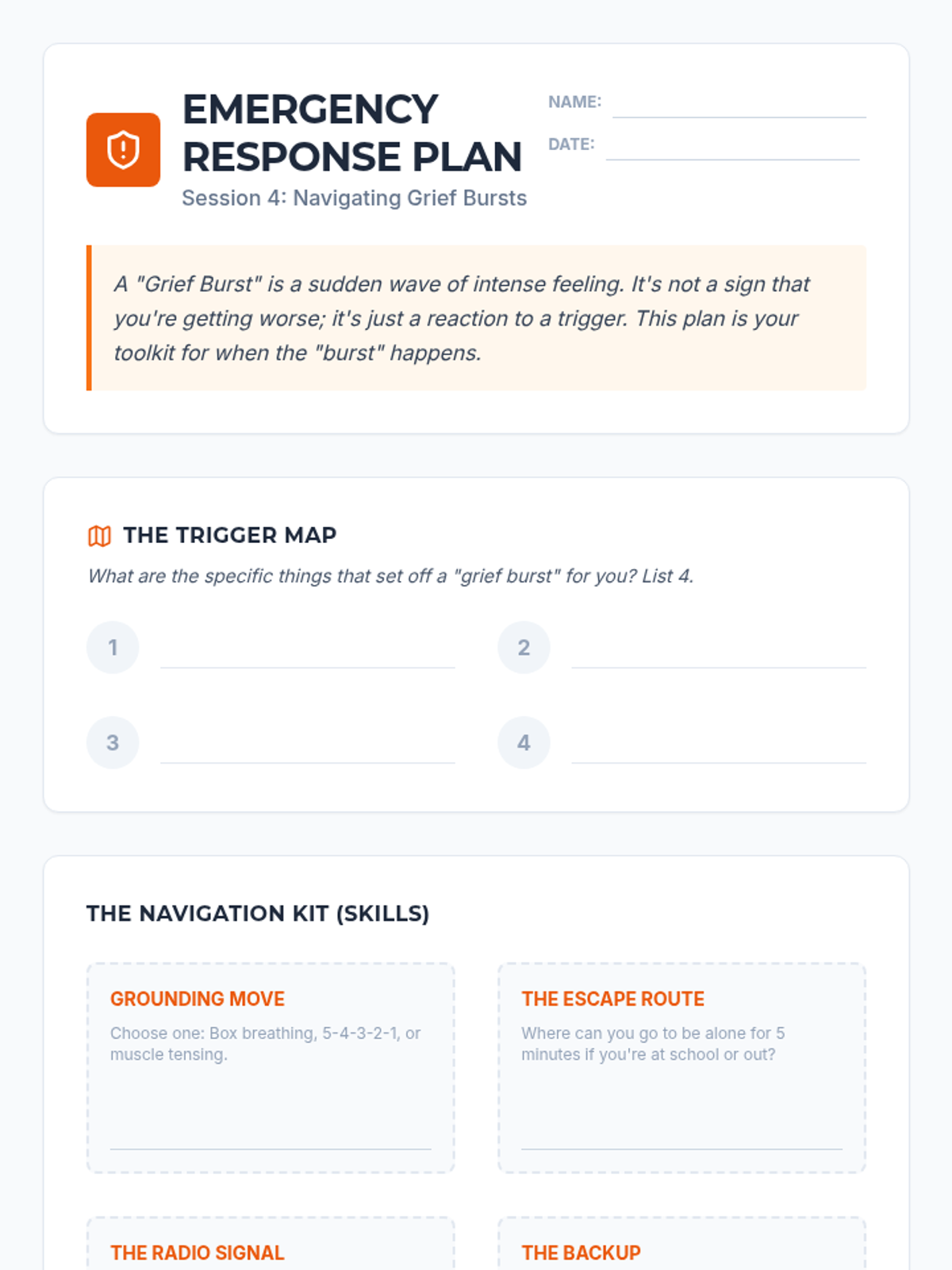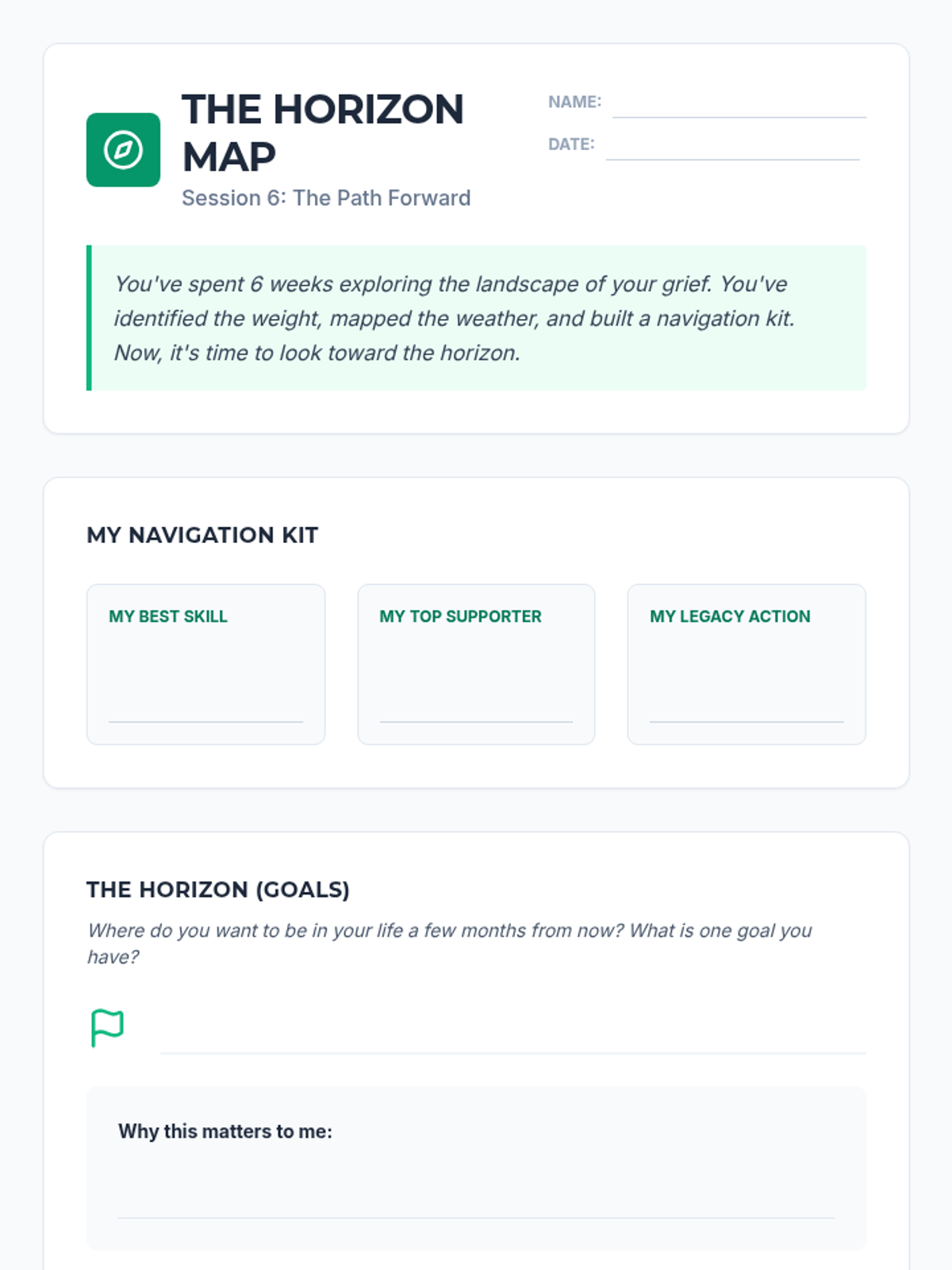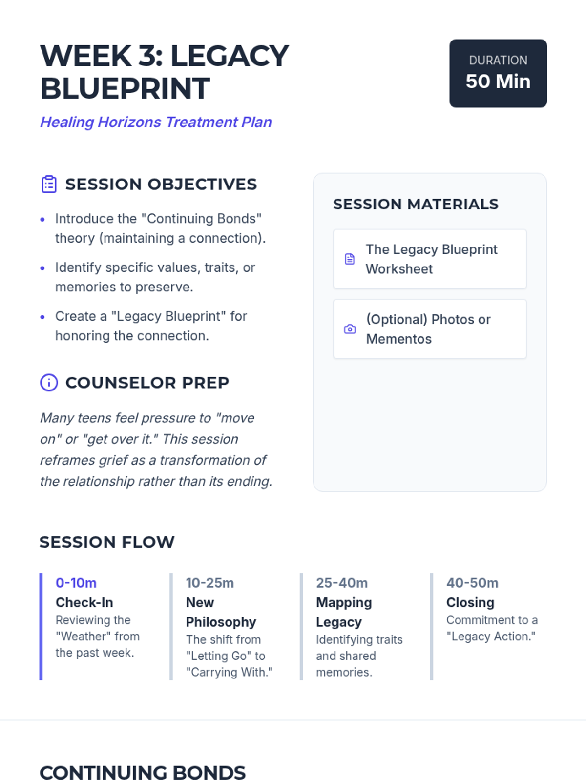A comprehensive 6-week grief and loss treatment plan designed specifically for adolescent boys. The program, titled 'Healing Horizons,' uses a navigation and exploration metaphor to help teens process their loss, build coping skills, and find a path forward.