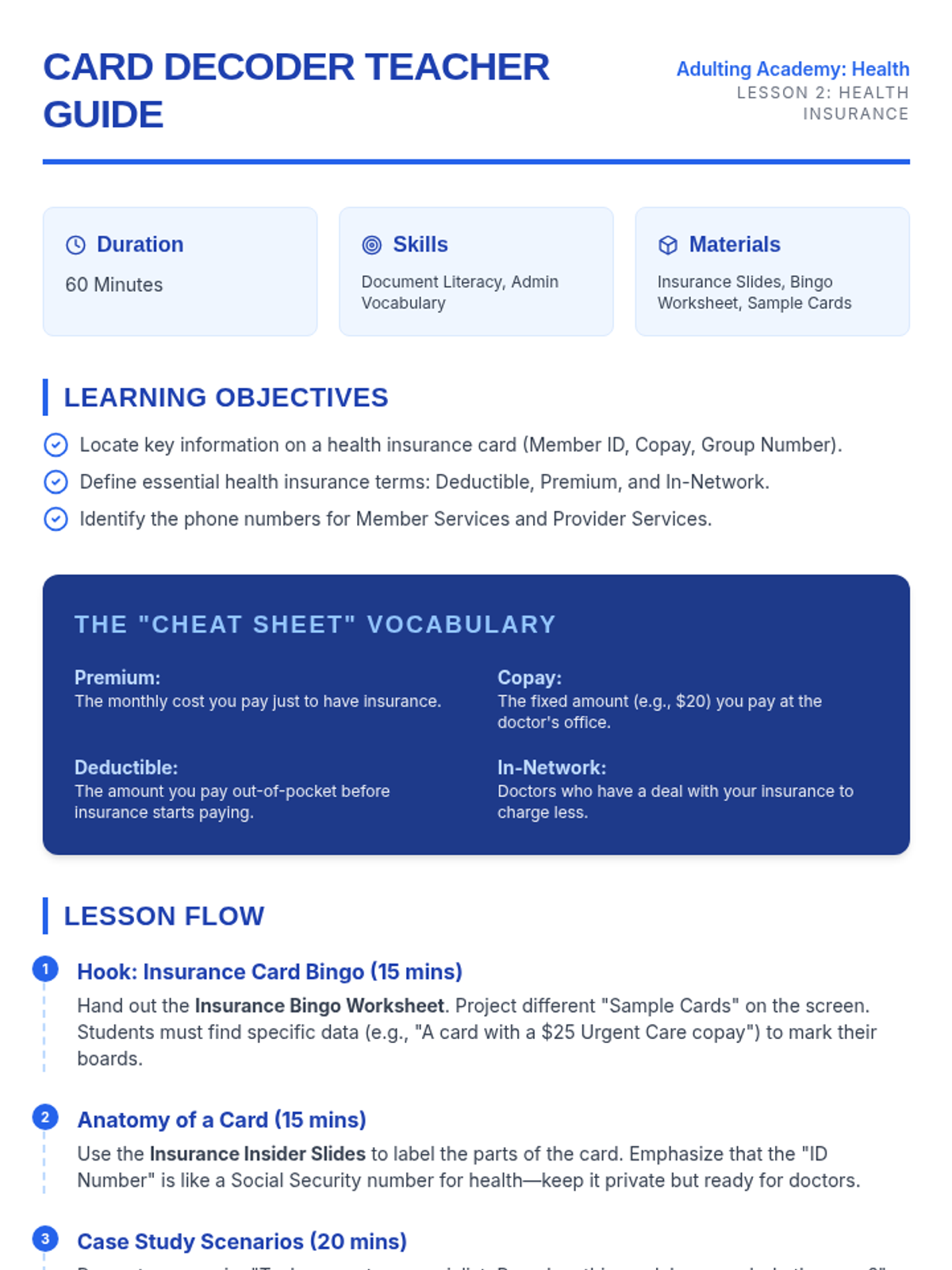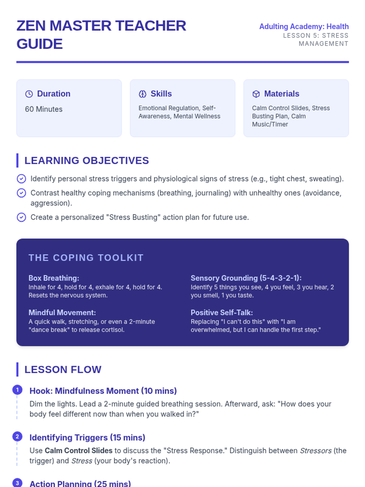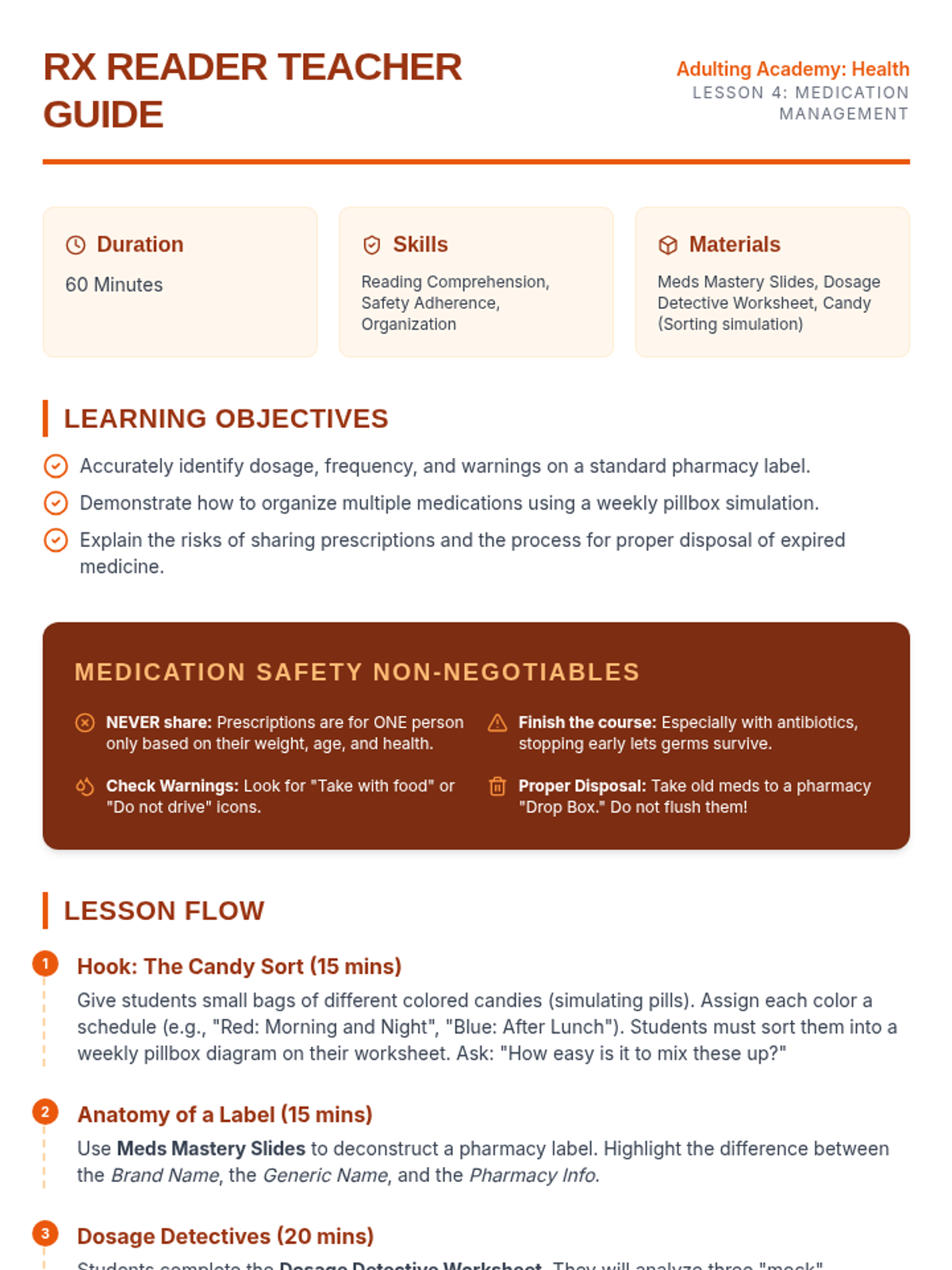A 5-lesson sequence designed to empower 9th-grade students with independent living skills focused on personal hygiene, health insurance literacy, medical advocacy, medication safety, and mental wellness.