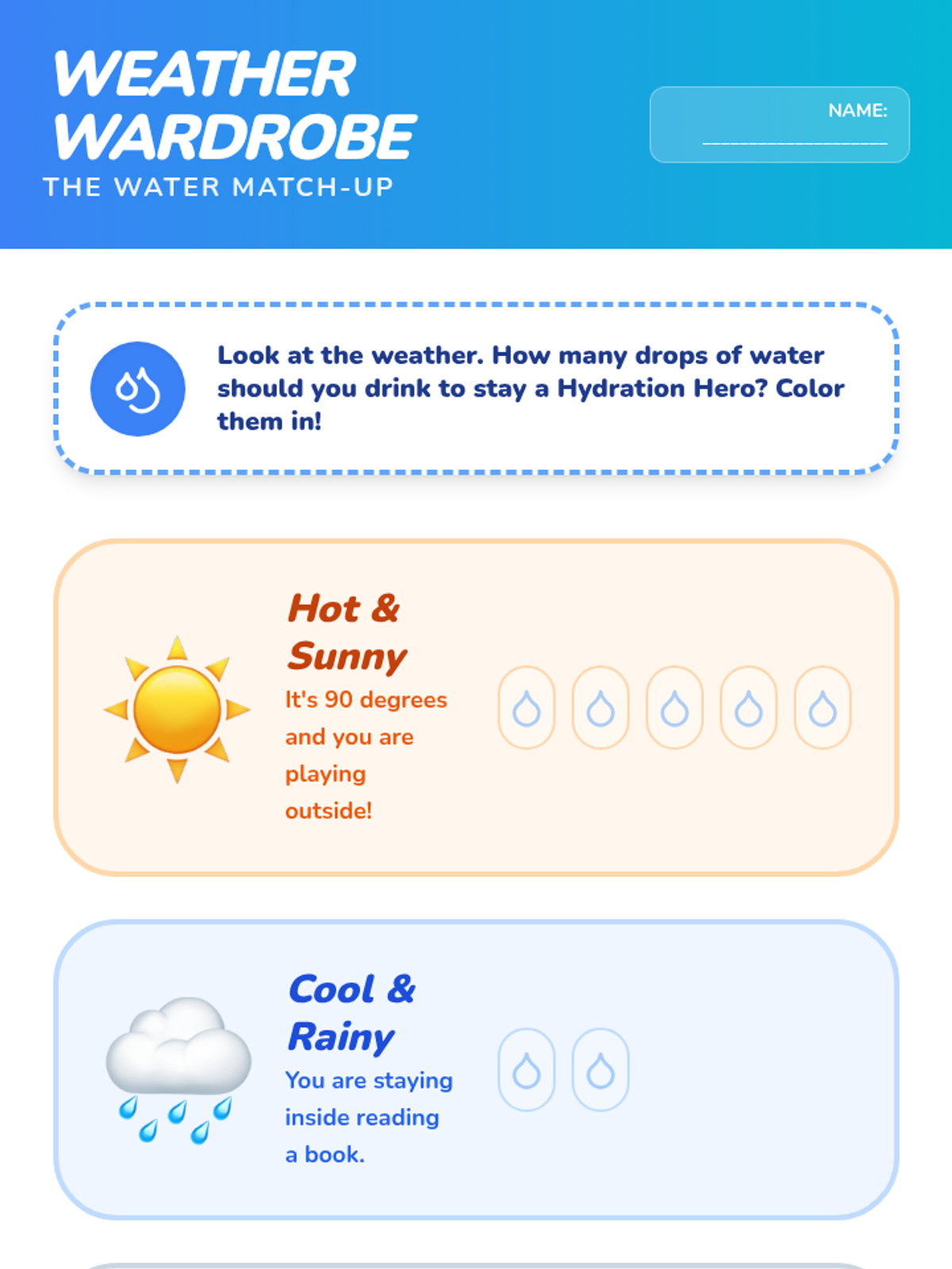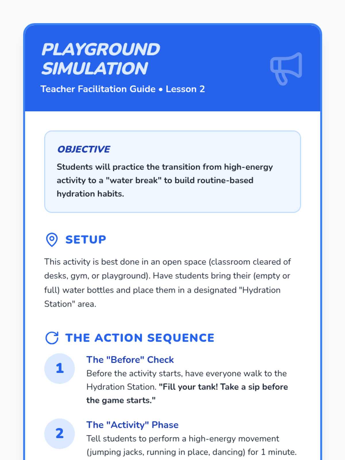 A comprehensive 1st-grade health sequence focused on building healthy hydration habits. Students learn to choose water over sugary drinks, identify optimal times for hydration during activity, adjust intake based on environment, and track their own daily habits.