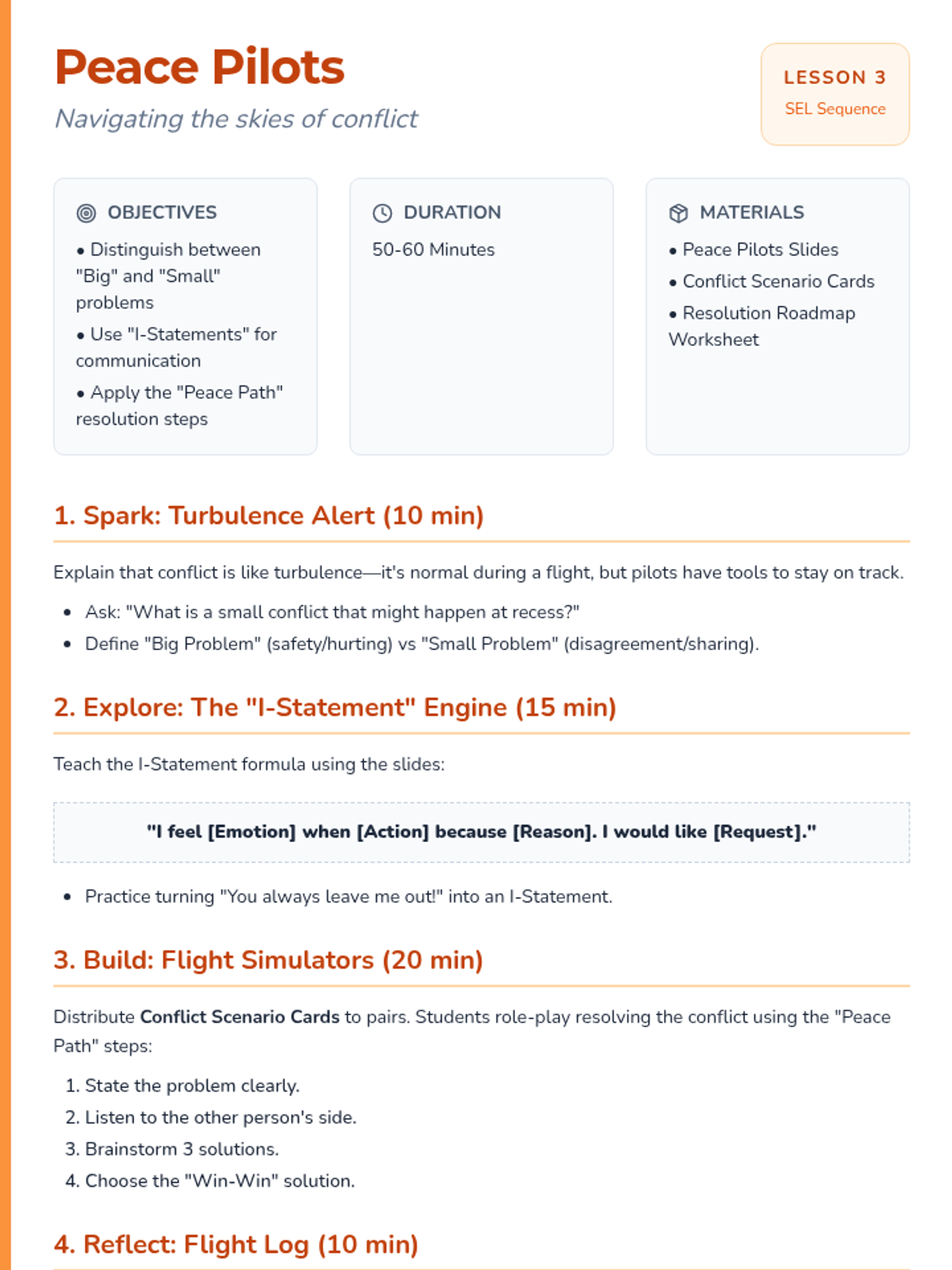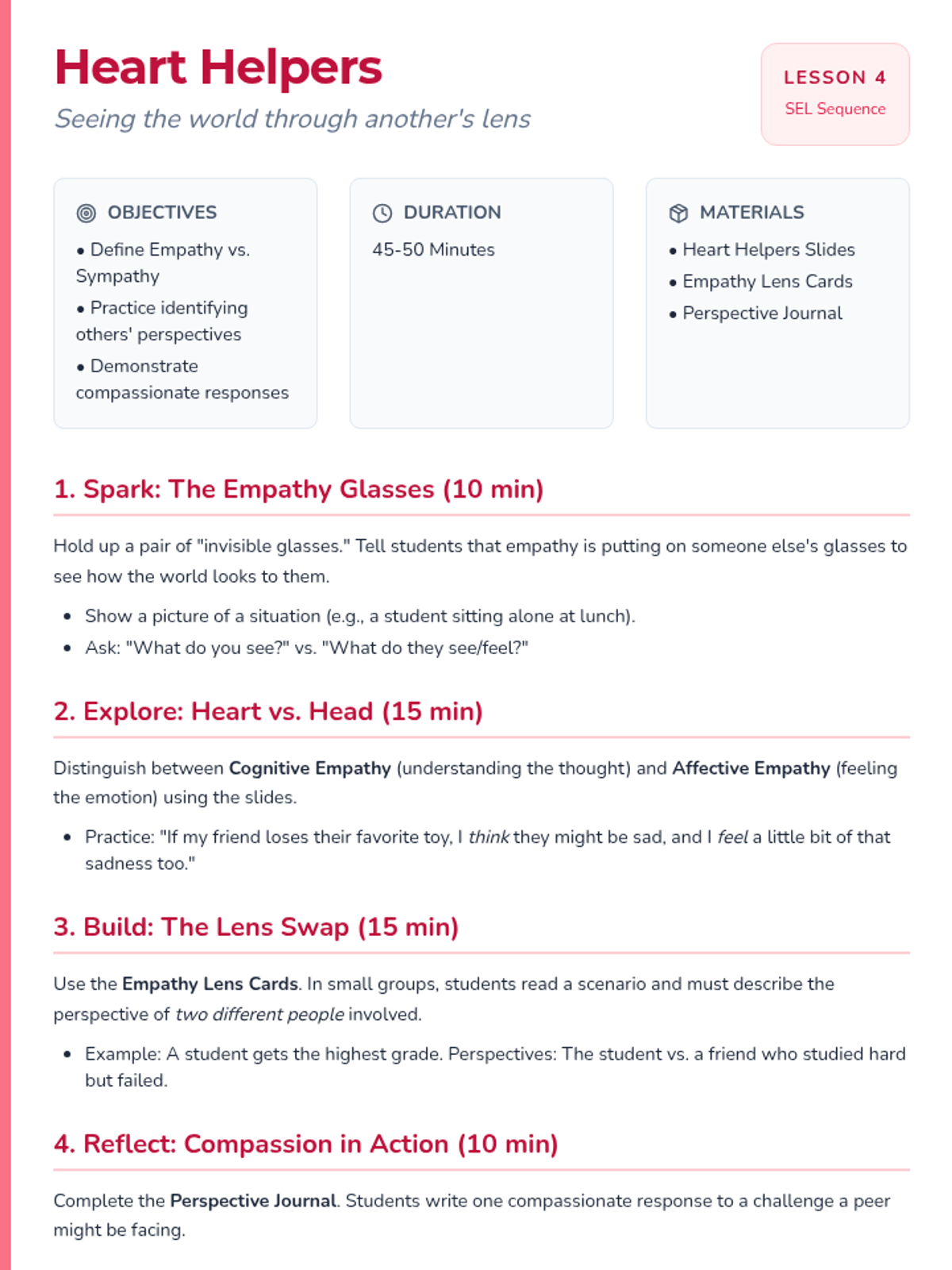 A comprehensive SEL curriculum focusing on building healthy friendships, managing stress, resolving conflicts, and developing empathy through interactive activities and reflective practices.