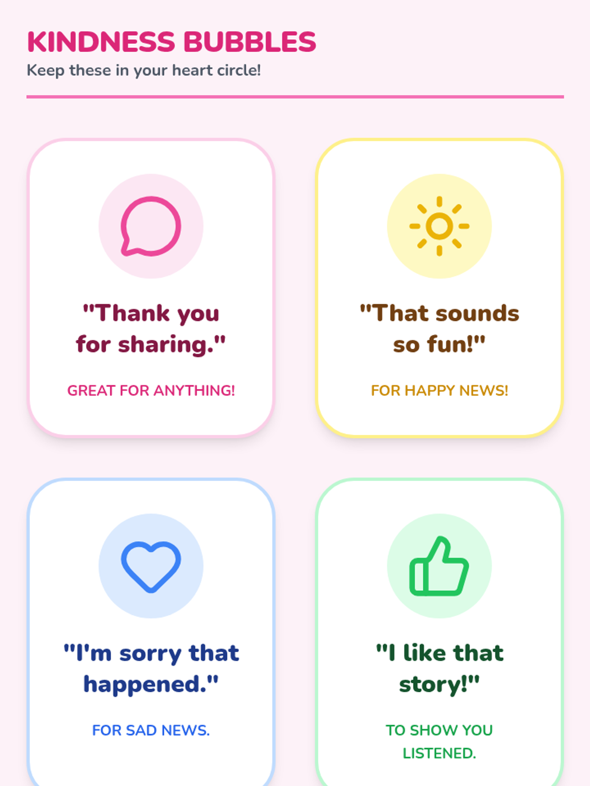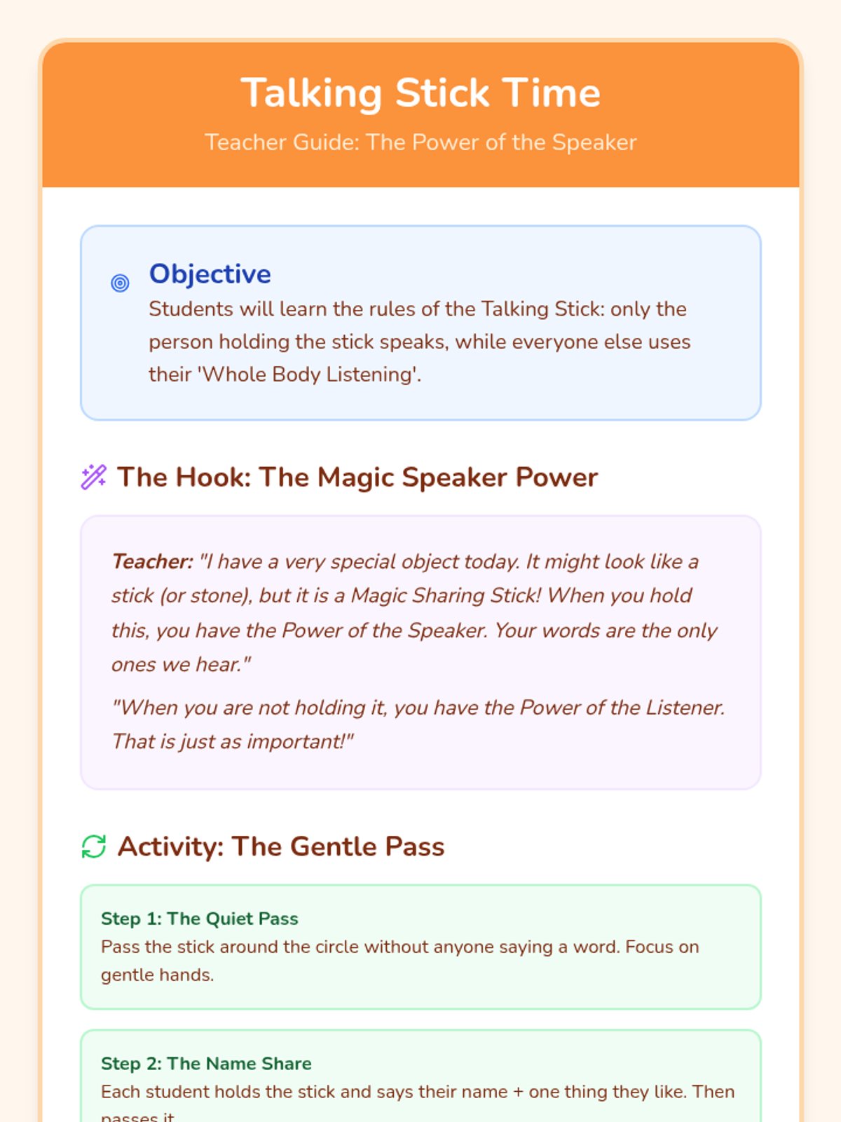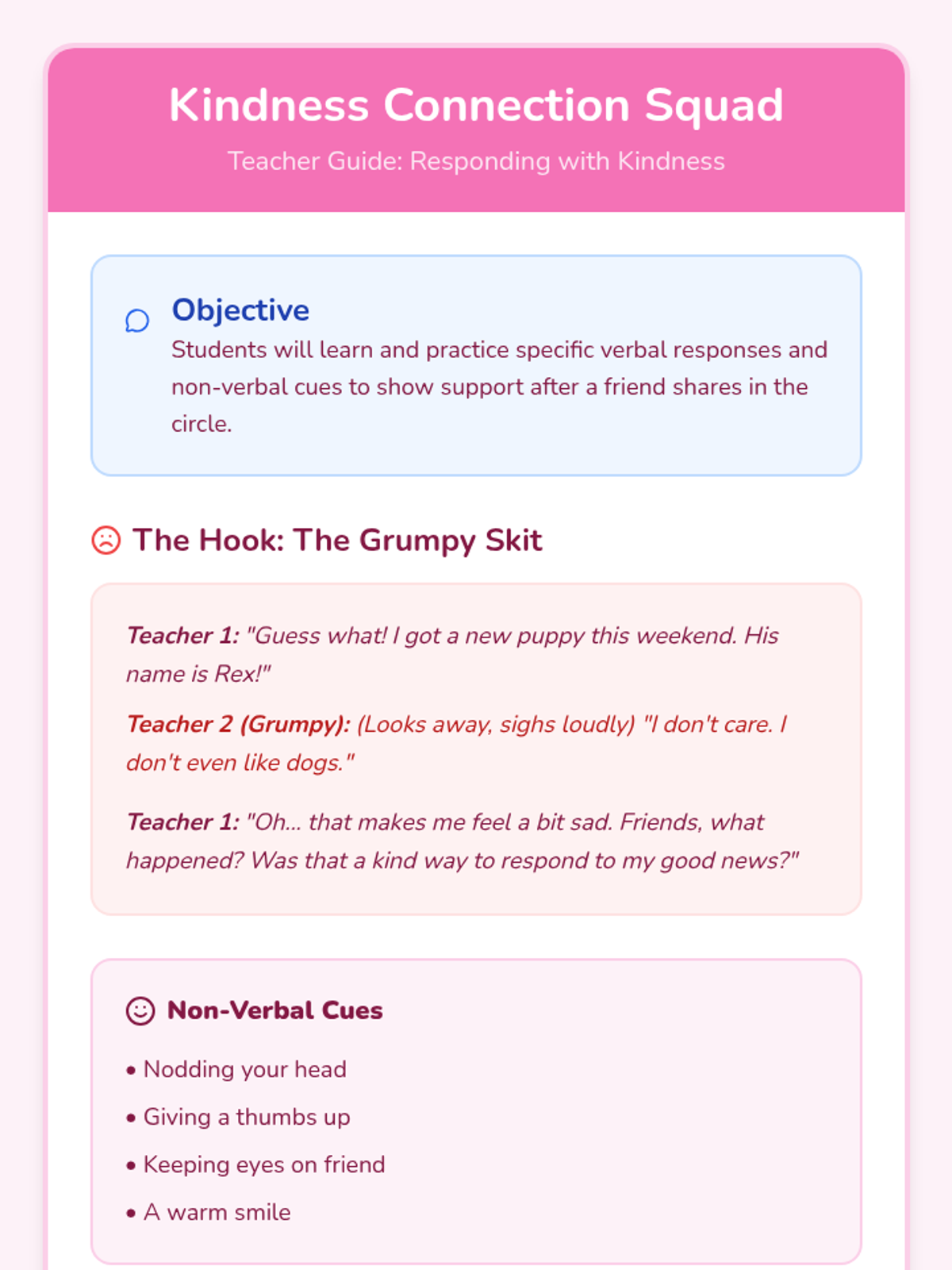 A Kindergarten sequence focused on building the social and emotional foundations for participating in a supportive group environment. Students learn whole-body listening, turn-taking, empathy, kind responses, and personal boundaries.