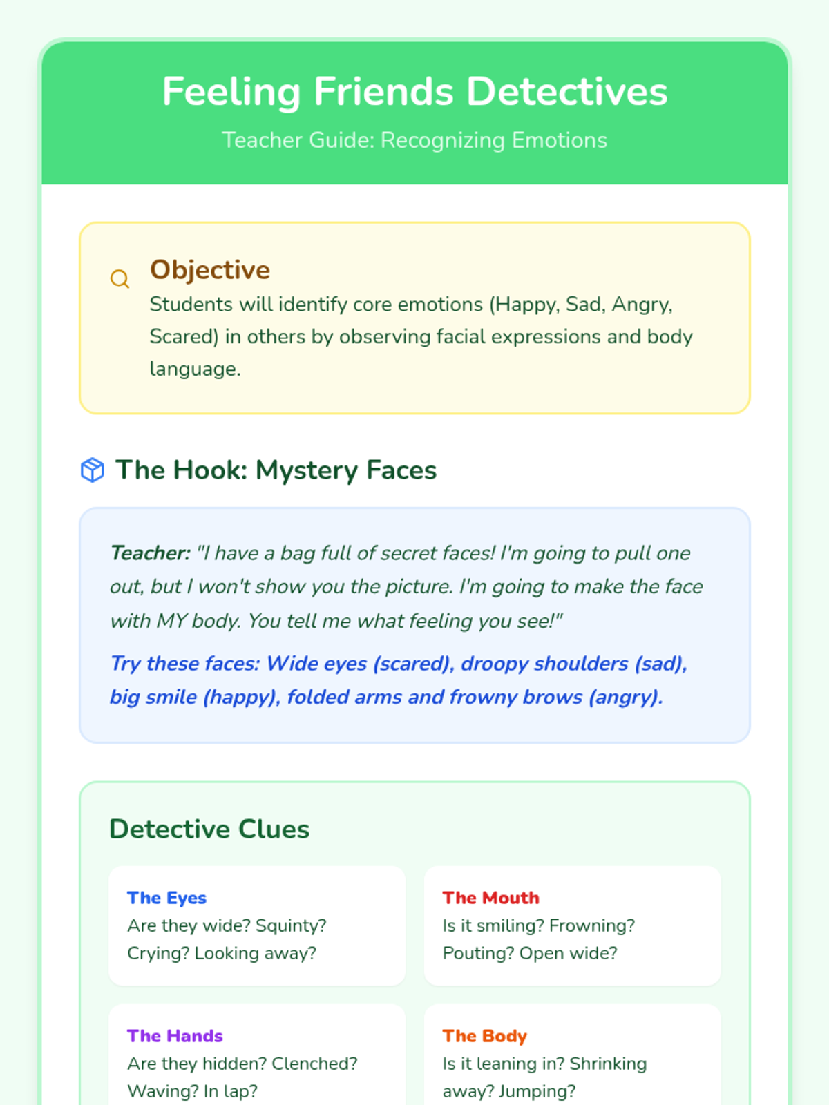 A multi-day social-emotional learning sequence that teaches students how to identify, manage, and communicate difficult emotions like anger and conflict using the metaphor of an 'Emotional Backpack'. Designed with high-visual support for EAL and neurodivergent learners.