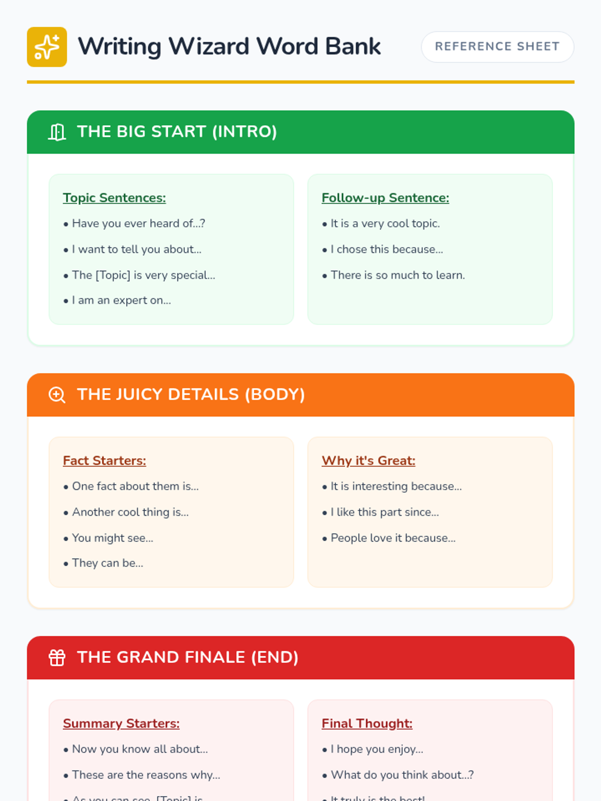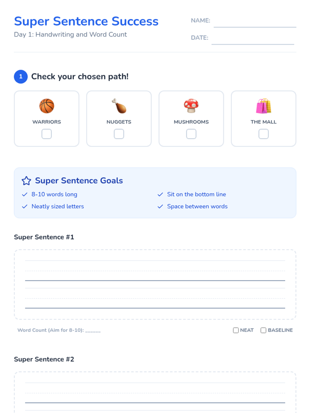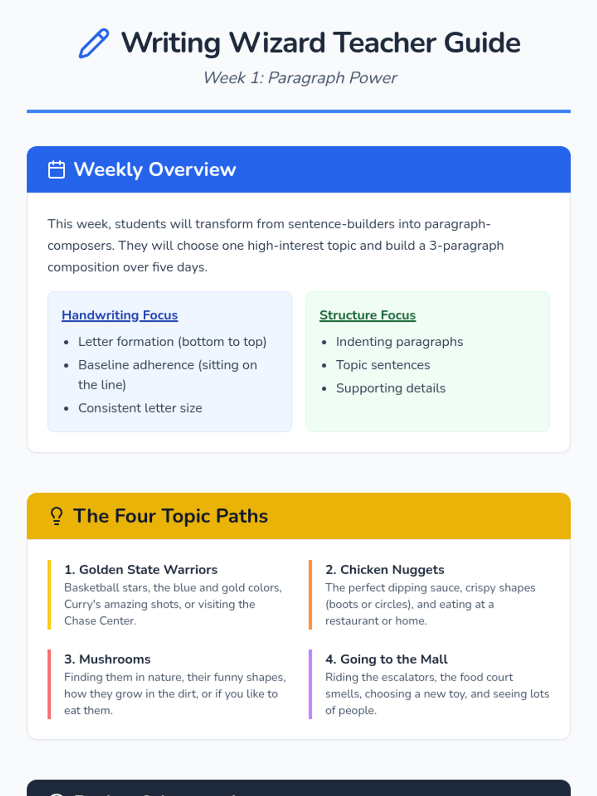 A week-long writing unit for 1st-2nd grade students focused on sentence structure, handwriting, and multi-paragraph composition through high-interest topics.