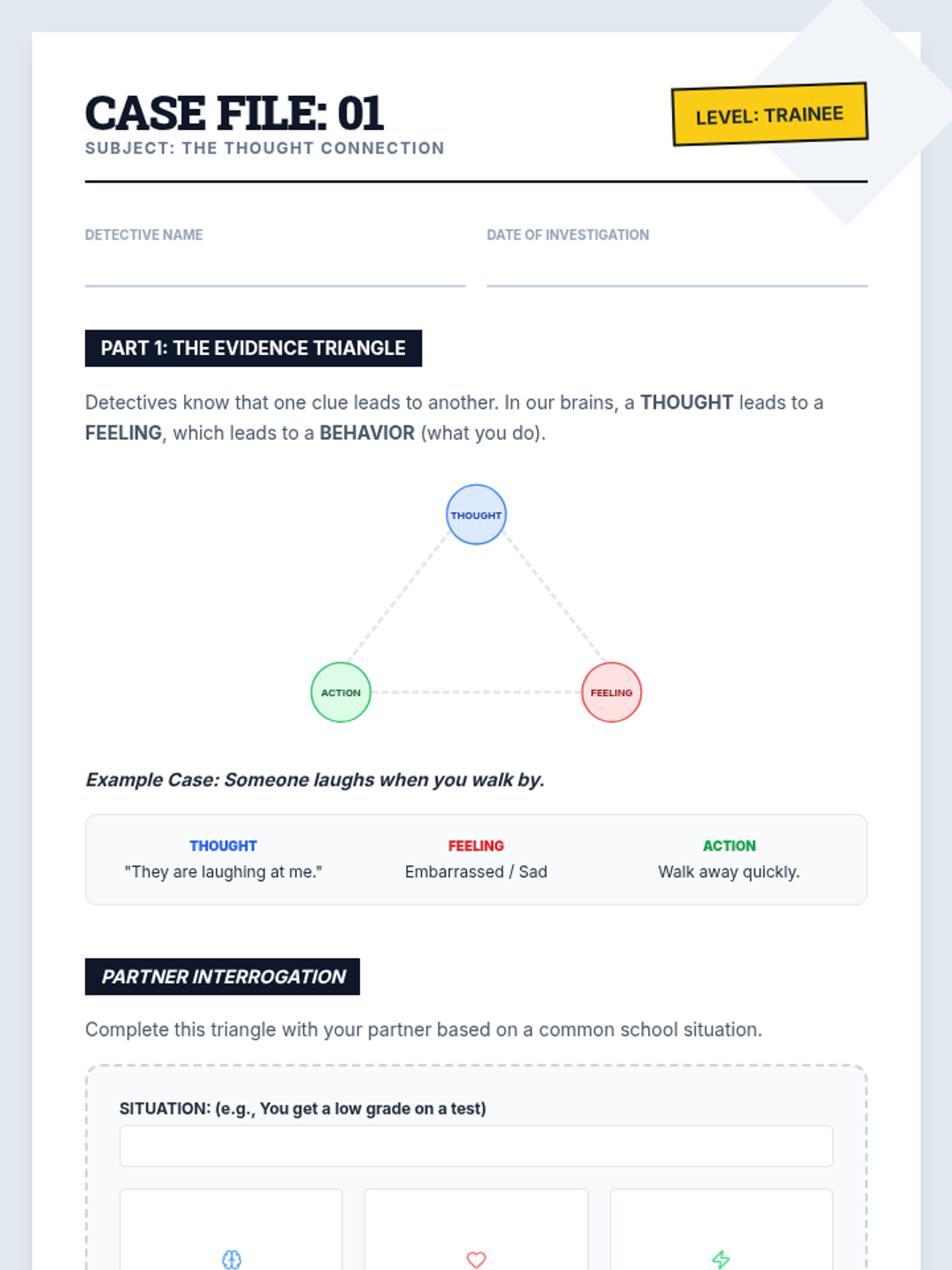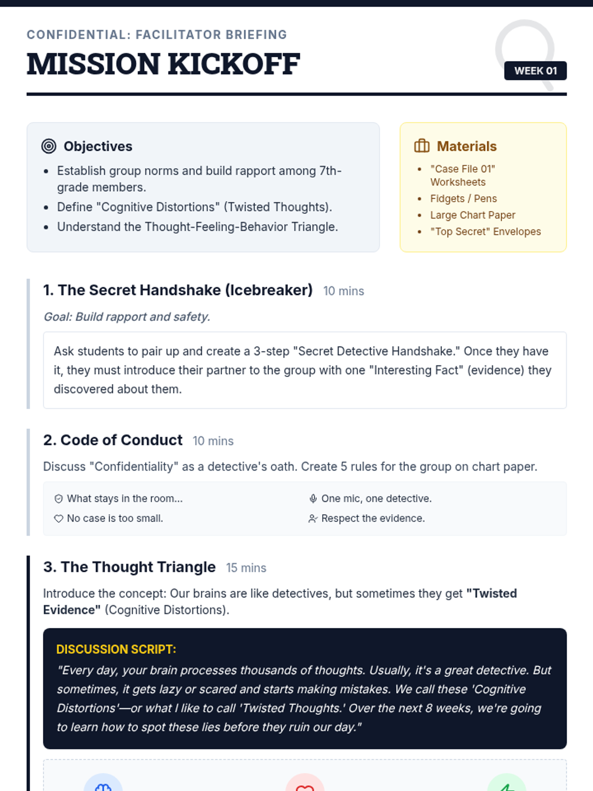 An 8-week cognitive behavioral therapy (CBT) based small group curriculum for 7th graders, focused on identifying and challenging cognitive distortions using a fun detective theme.