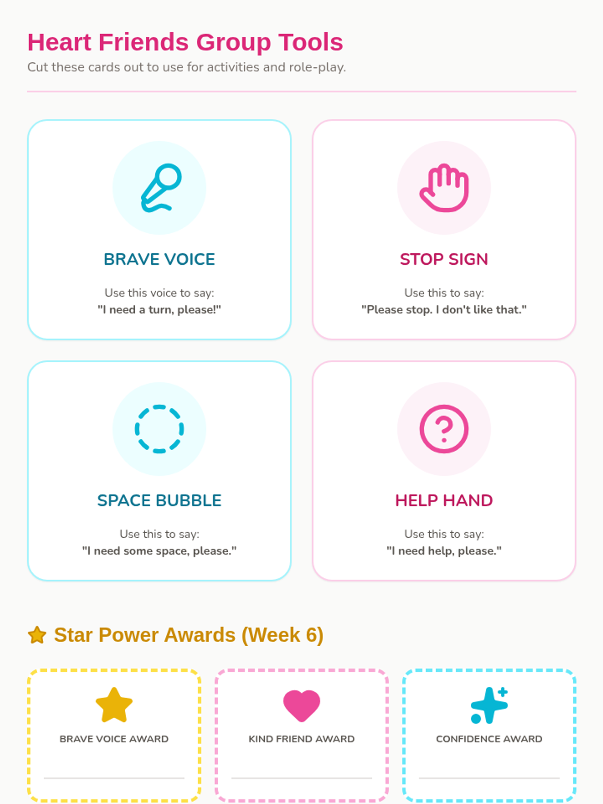 A 6-week social-emotional learning sequence for Kindergarten girls focused on building confidence, identifying feelings, speaking up for needs, and fostering kind friendships through the theme of a 'Heart Friends Circle'.