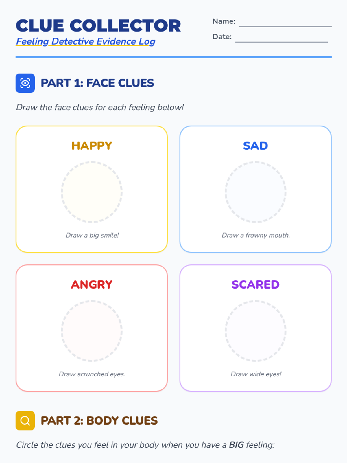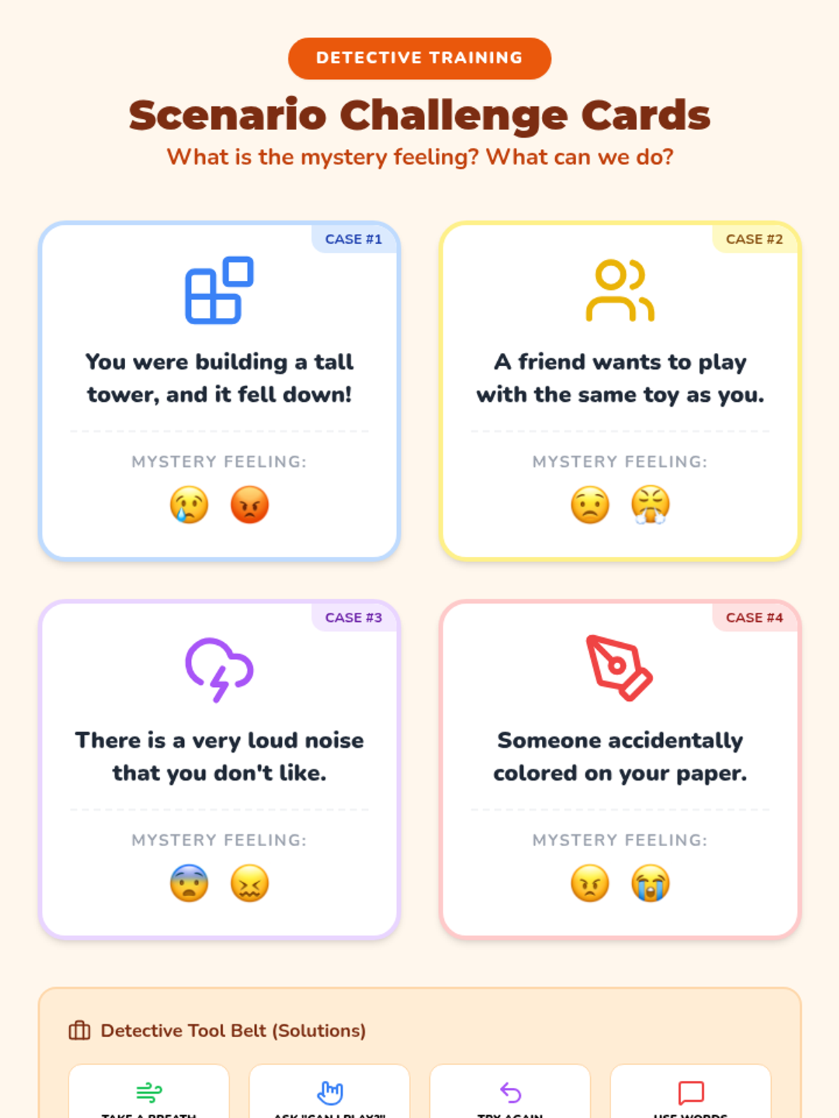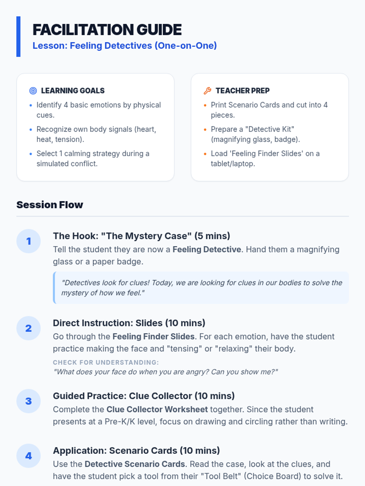 A multi-lesson counseling program for young learners that uses a detective theme to build emotional literacy, self-regulation, and conflict resolution skills through visual and interactive activities.