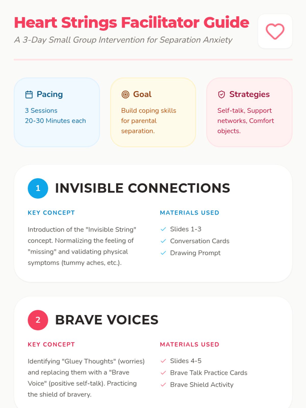A 3-day small group intervention focusing on coping strategies for separation from a parent, including self-talk, support networks, and comfort strategies.