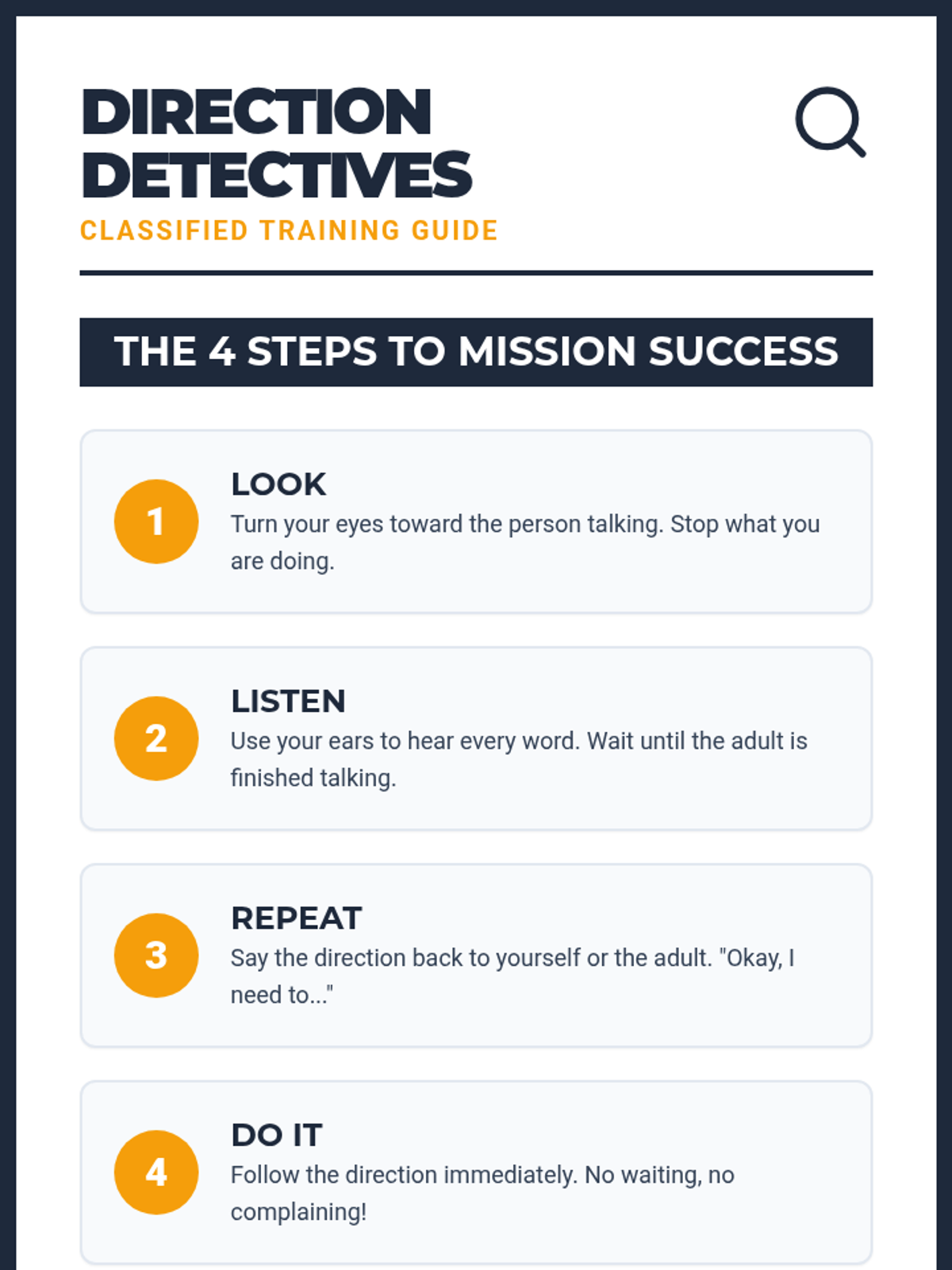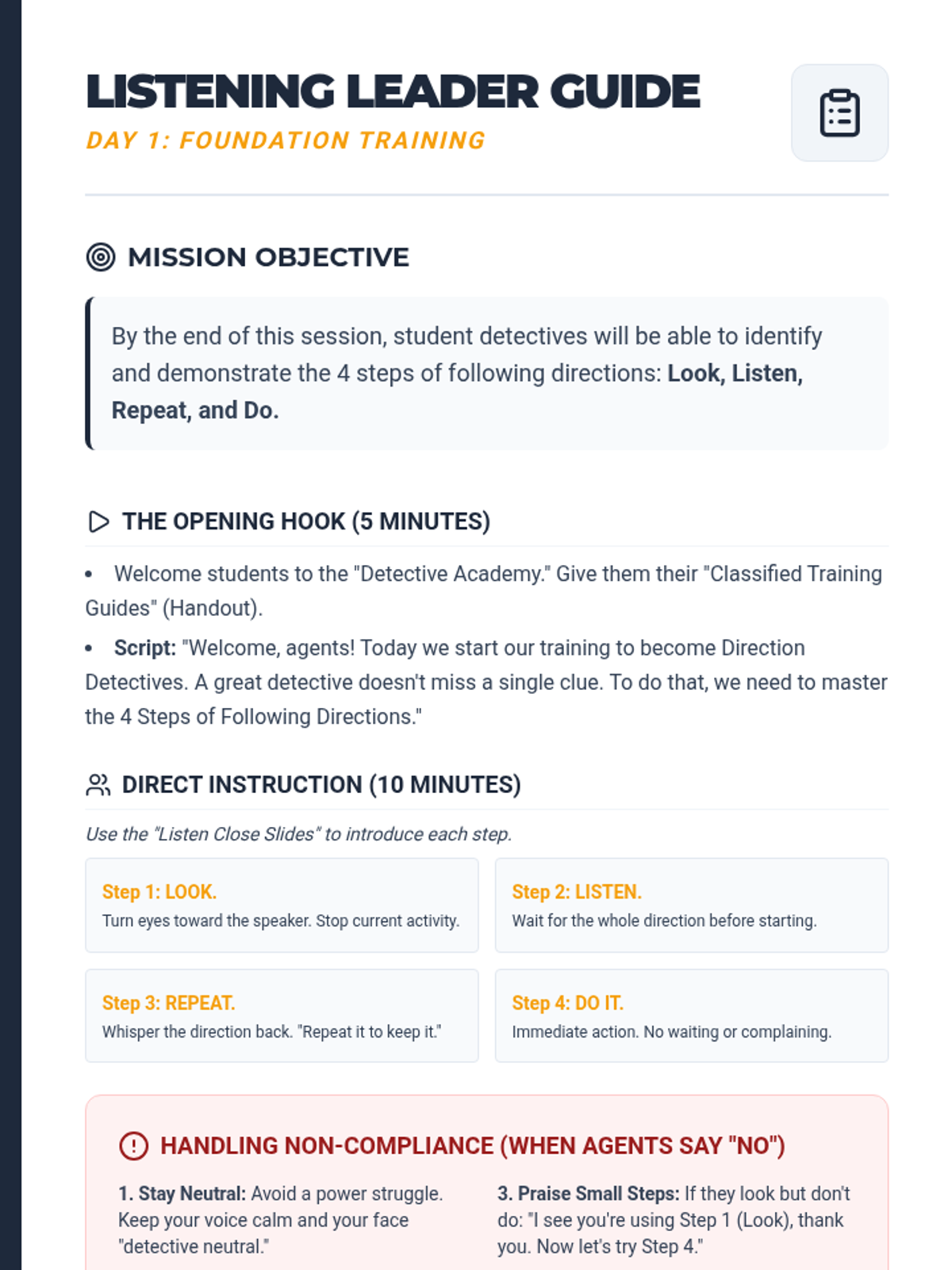 A 3-day small group intervention focused on mastering the art of following adult directions attentively and quickly using a fun 'Direction Detective' theme.