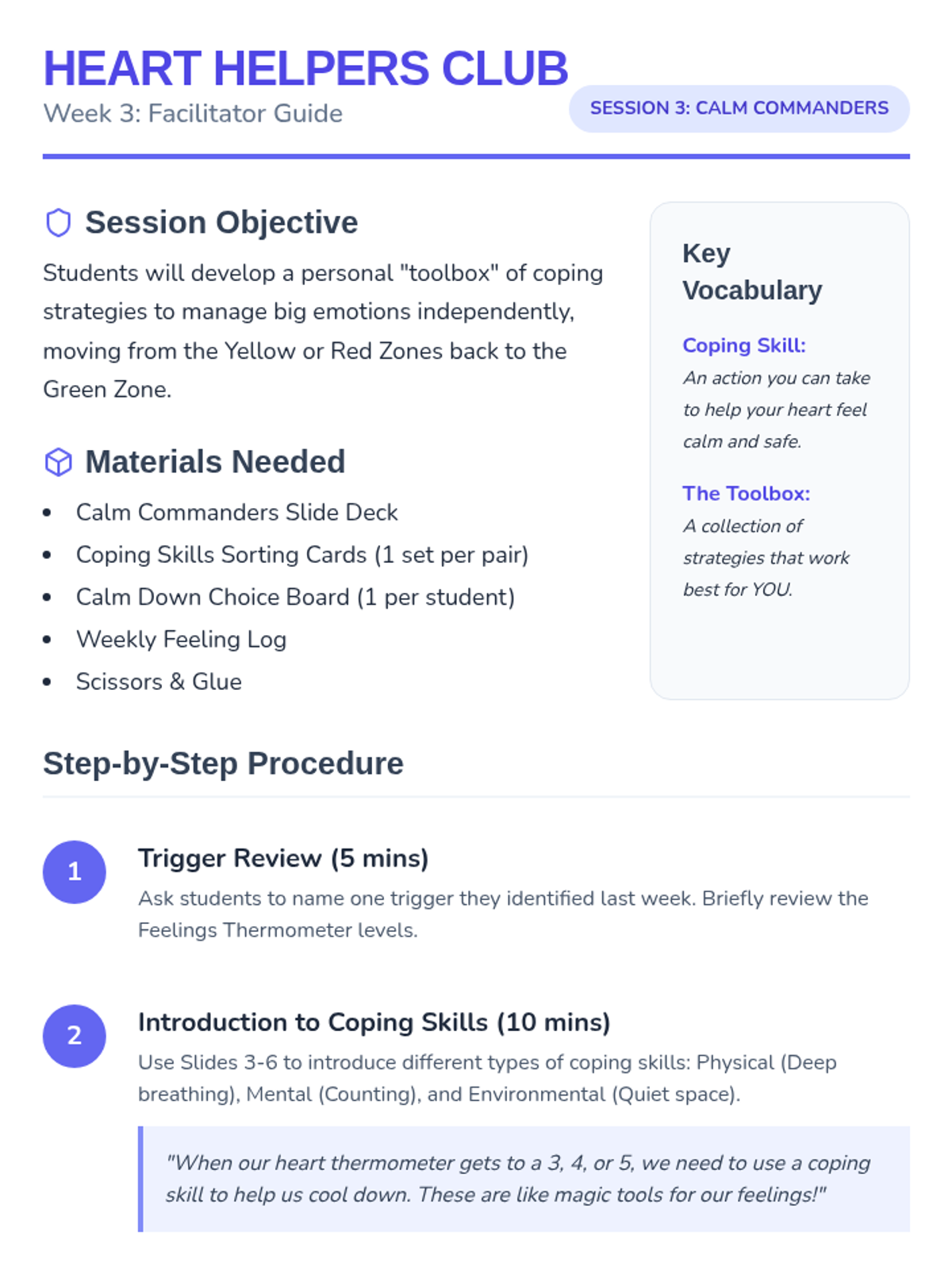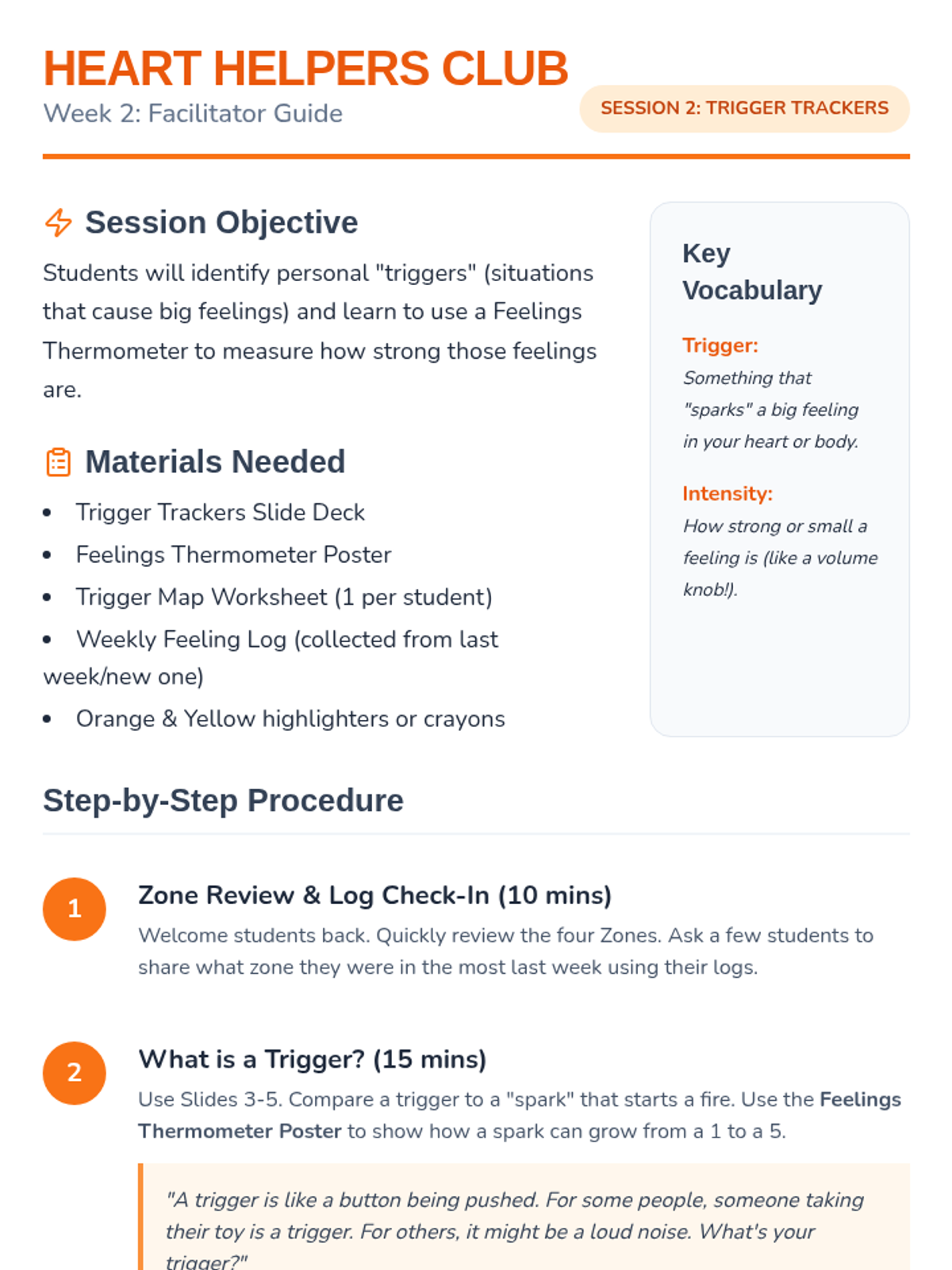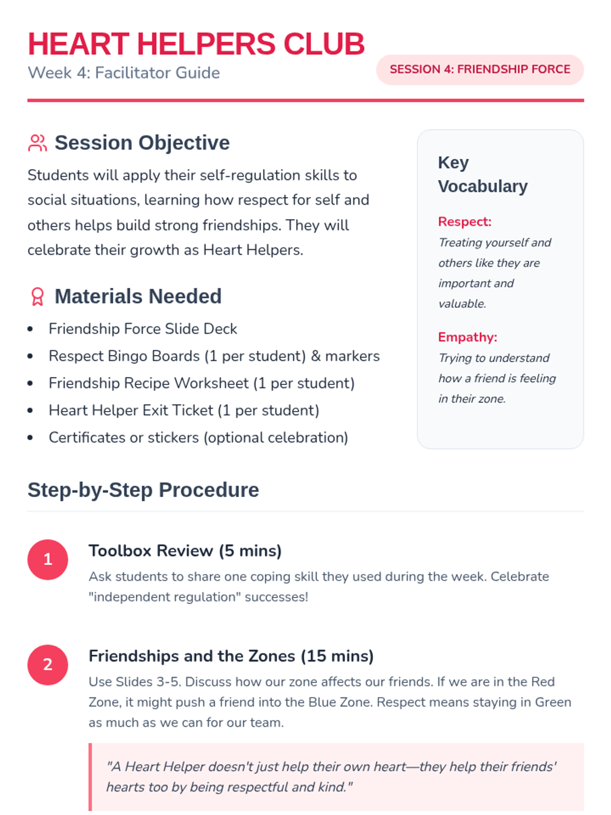 A comprehensive 4-week social-emotional learning curriculum for 1st and 2nd graders. Students learn to identify emotions using the Zones of Regulation, track triggers with a Feelings Thermometer, develop coping strategies, and build respectful friendships.
