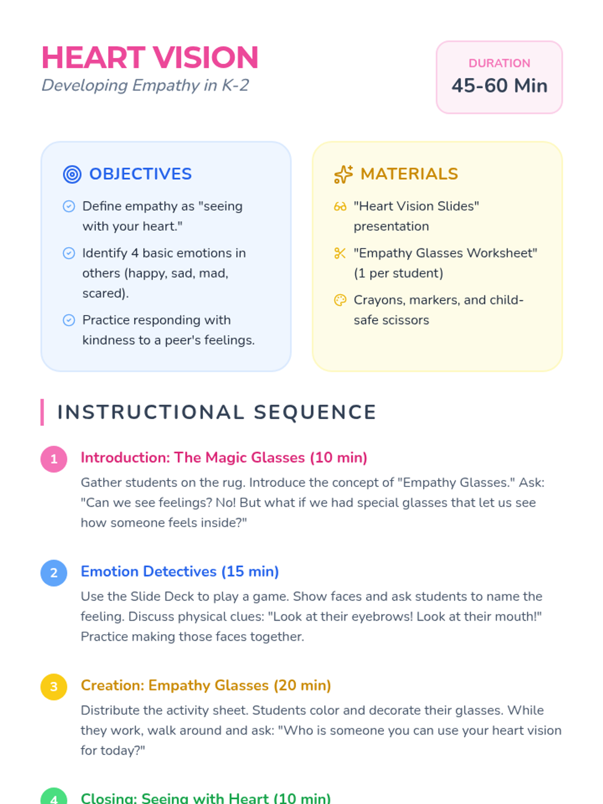 A comprehensive SEL sequence for K-2 students focused on building empathy, social awareness, and relationship skills through perspective-taking and identifying emotional clues in others.