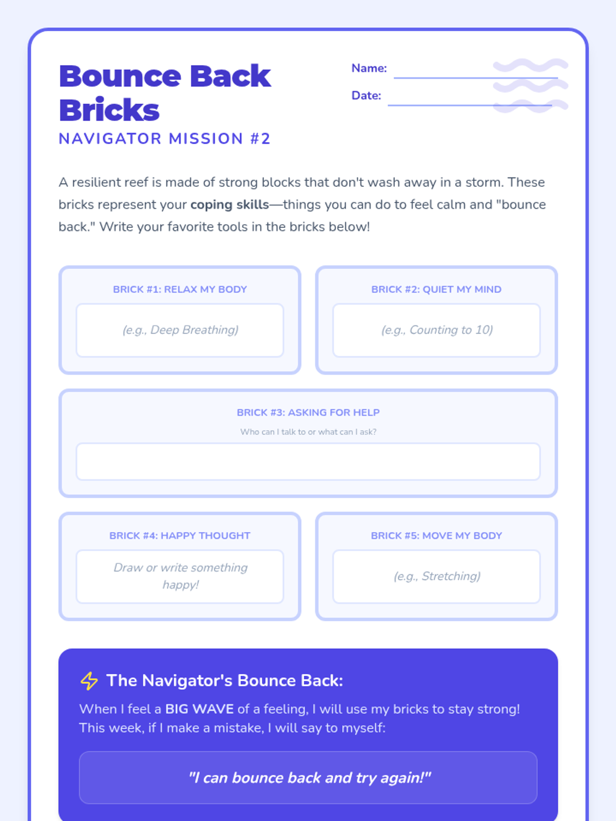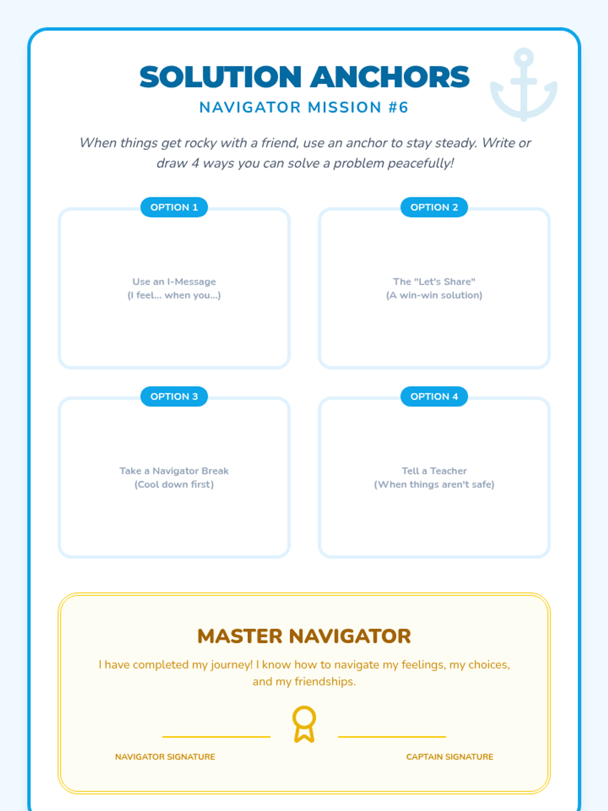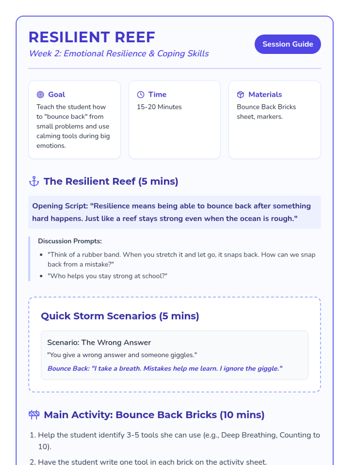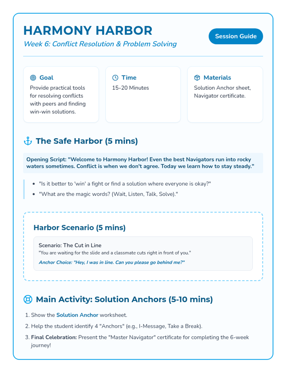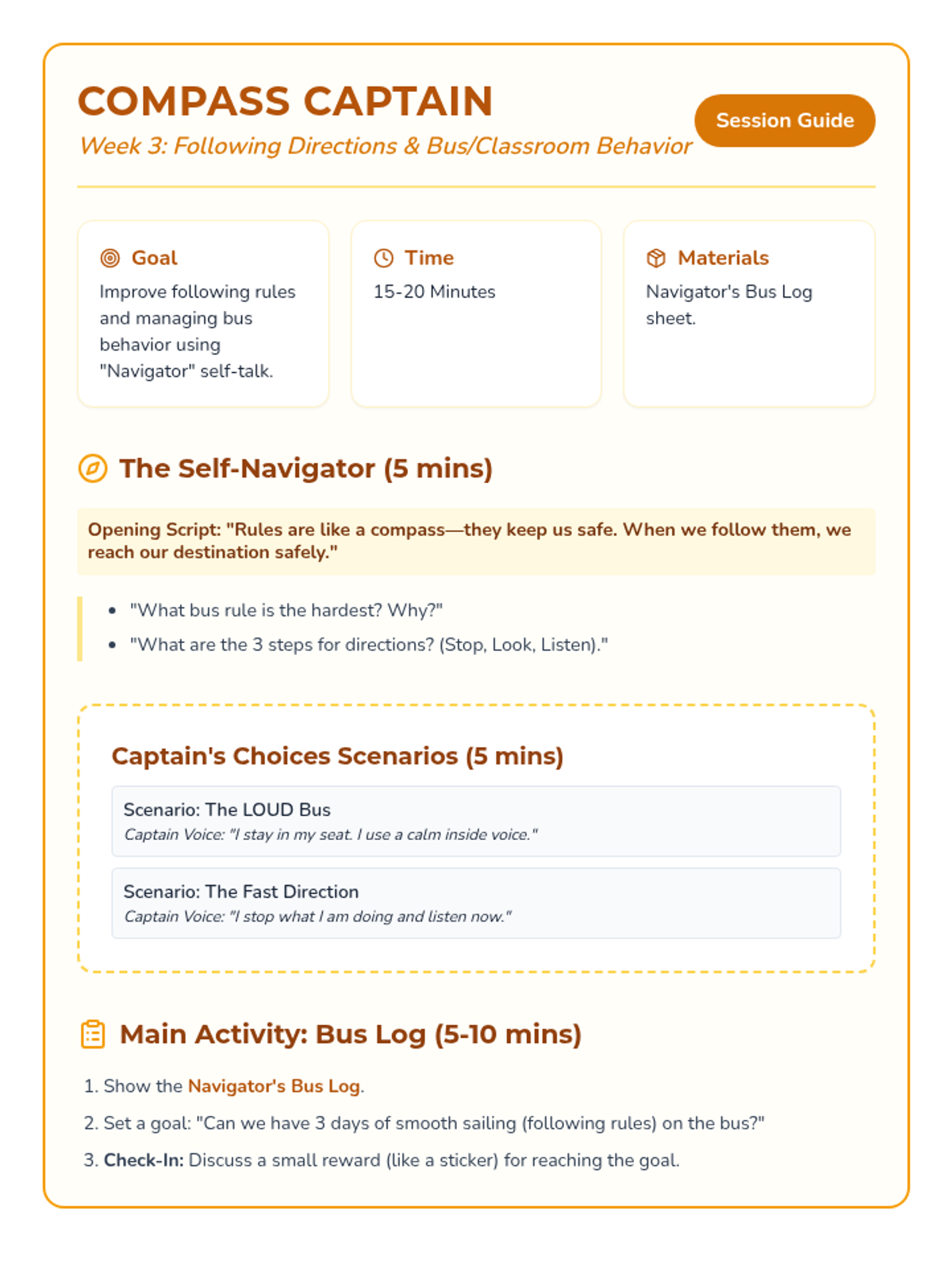 A 6-week social-emotional intervention designed for a 3rd-grade student to build emotional resilience, behavioral self-regulation, and interpersonal skills using a 'Navigator' theme. Each week focuses on a core area of growth through discussion, scenarios, and hands-on activities.