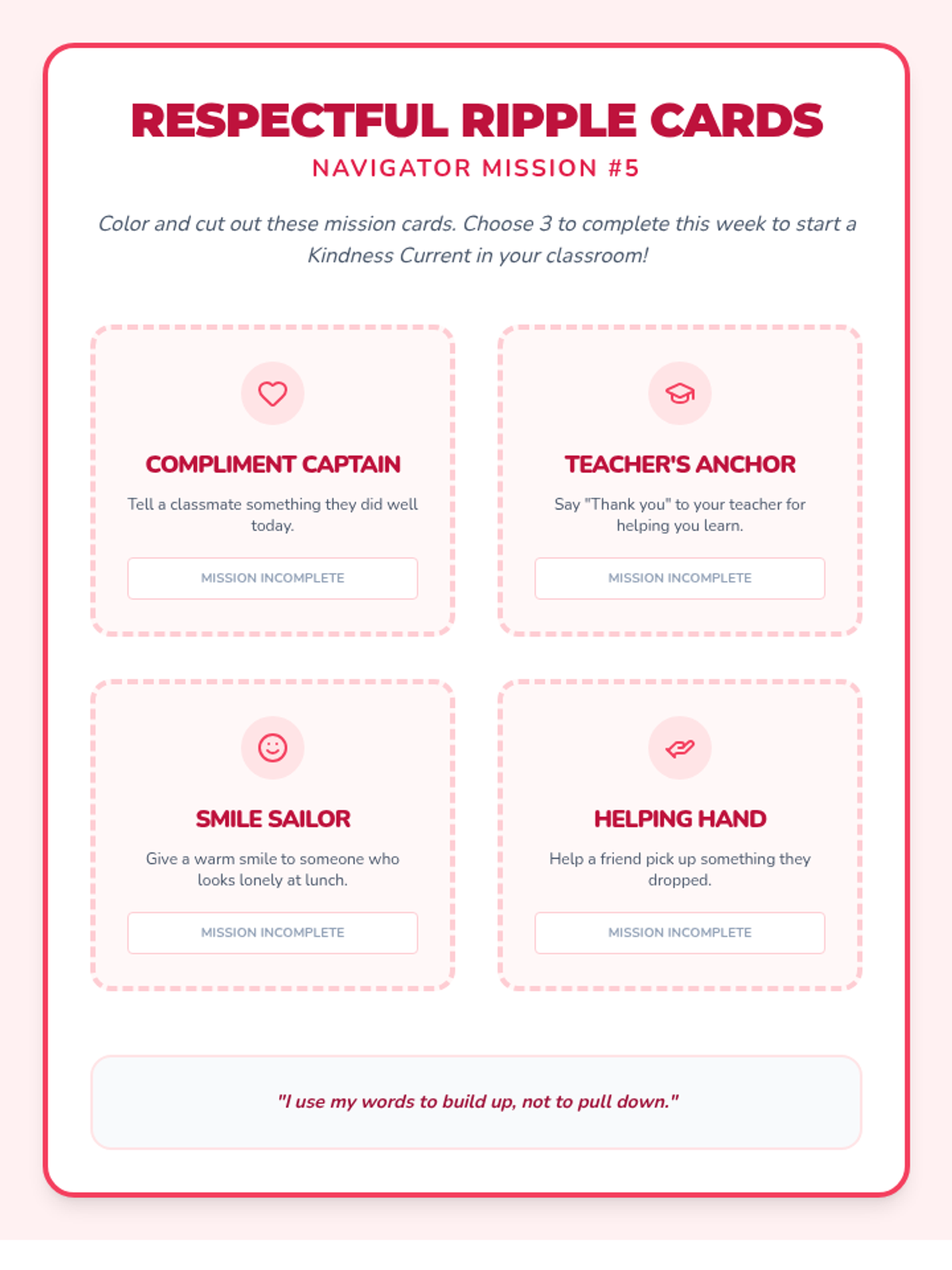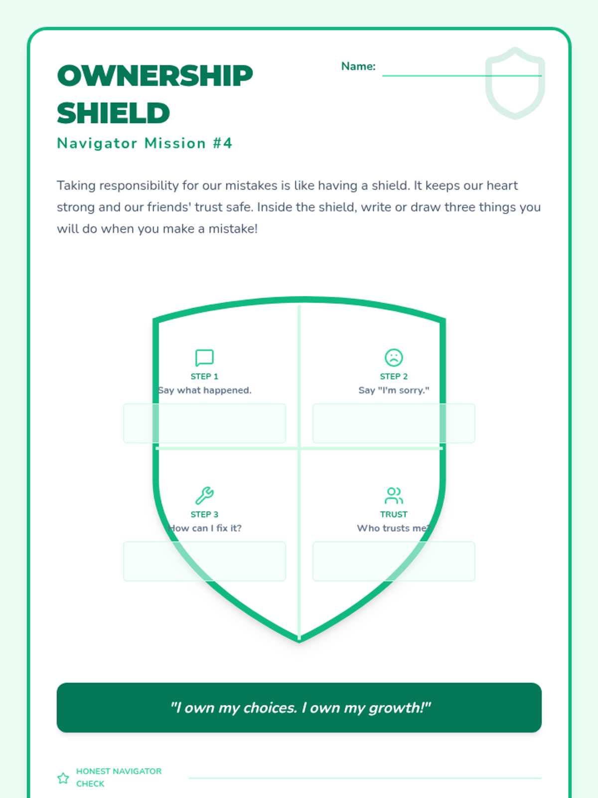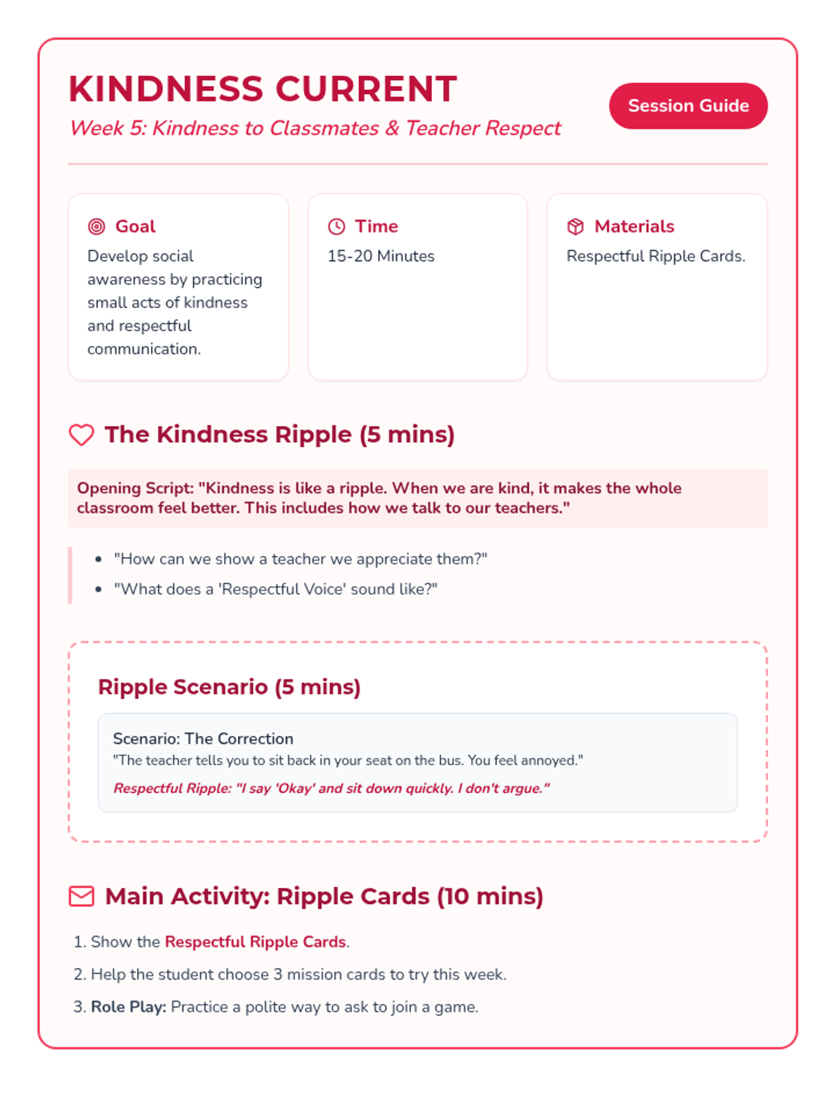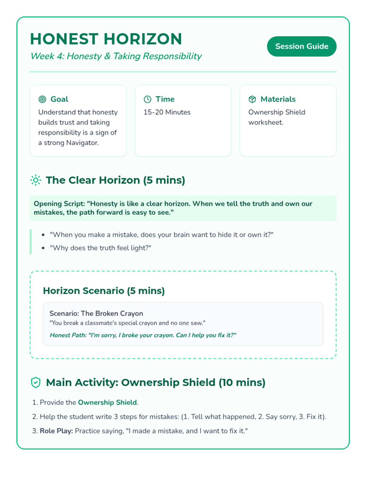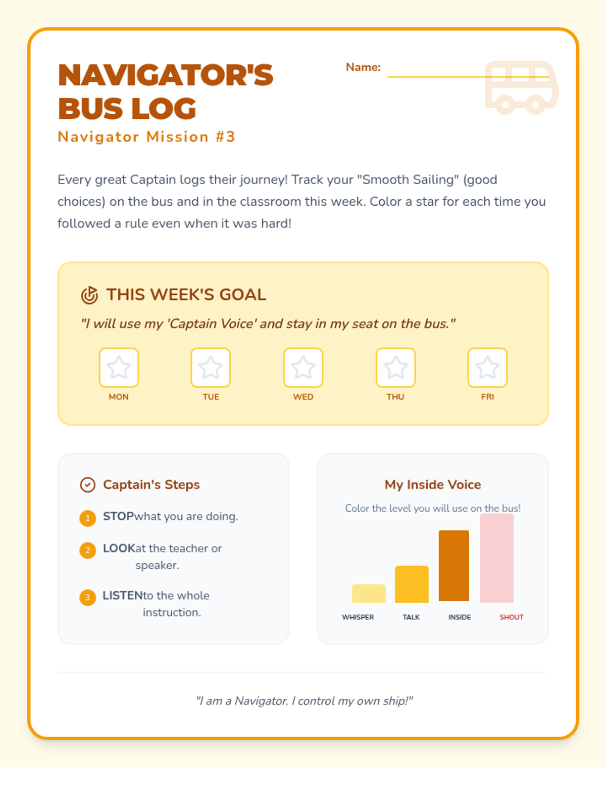A 6-week social-emotional intervention designed for a 3rd-grade student to build emotional resilience, behavioral self-regulation, and interpersonal skills using a 'Navigator' theme. Each week focuses on a core area of growth through discussion, scenarios, and hands-on activities.