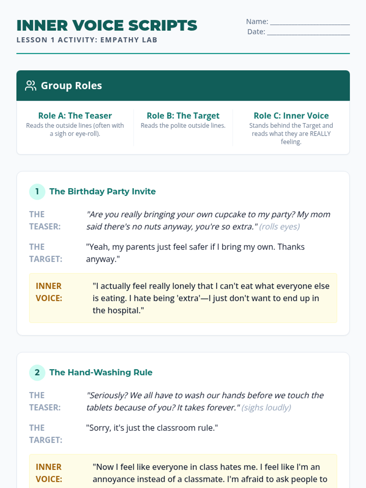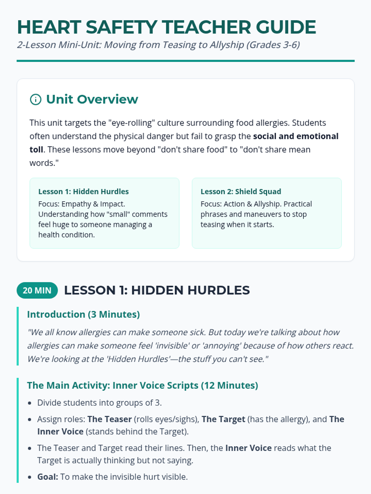 A two-part series designed for grades 3-6 to shift classroom culture from teasing and eye-rolling about allergies to active empathy and allyship.