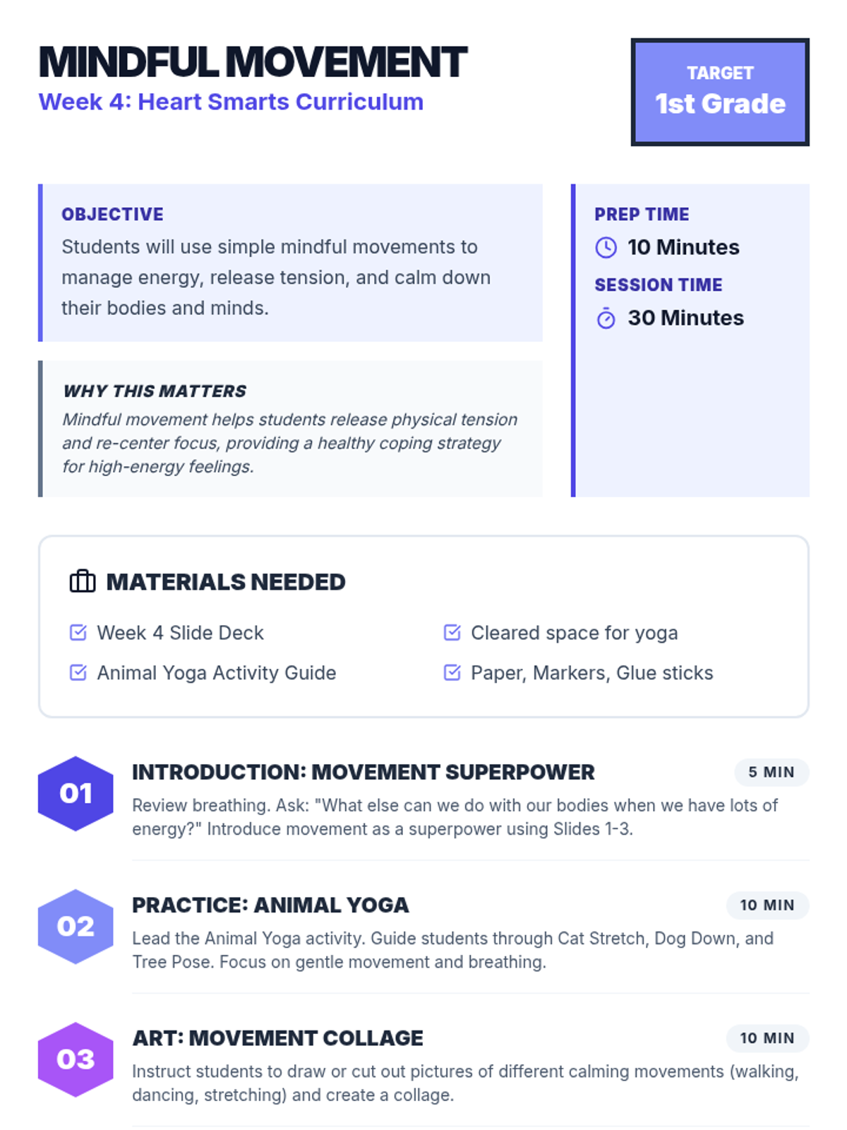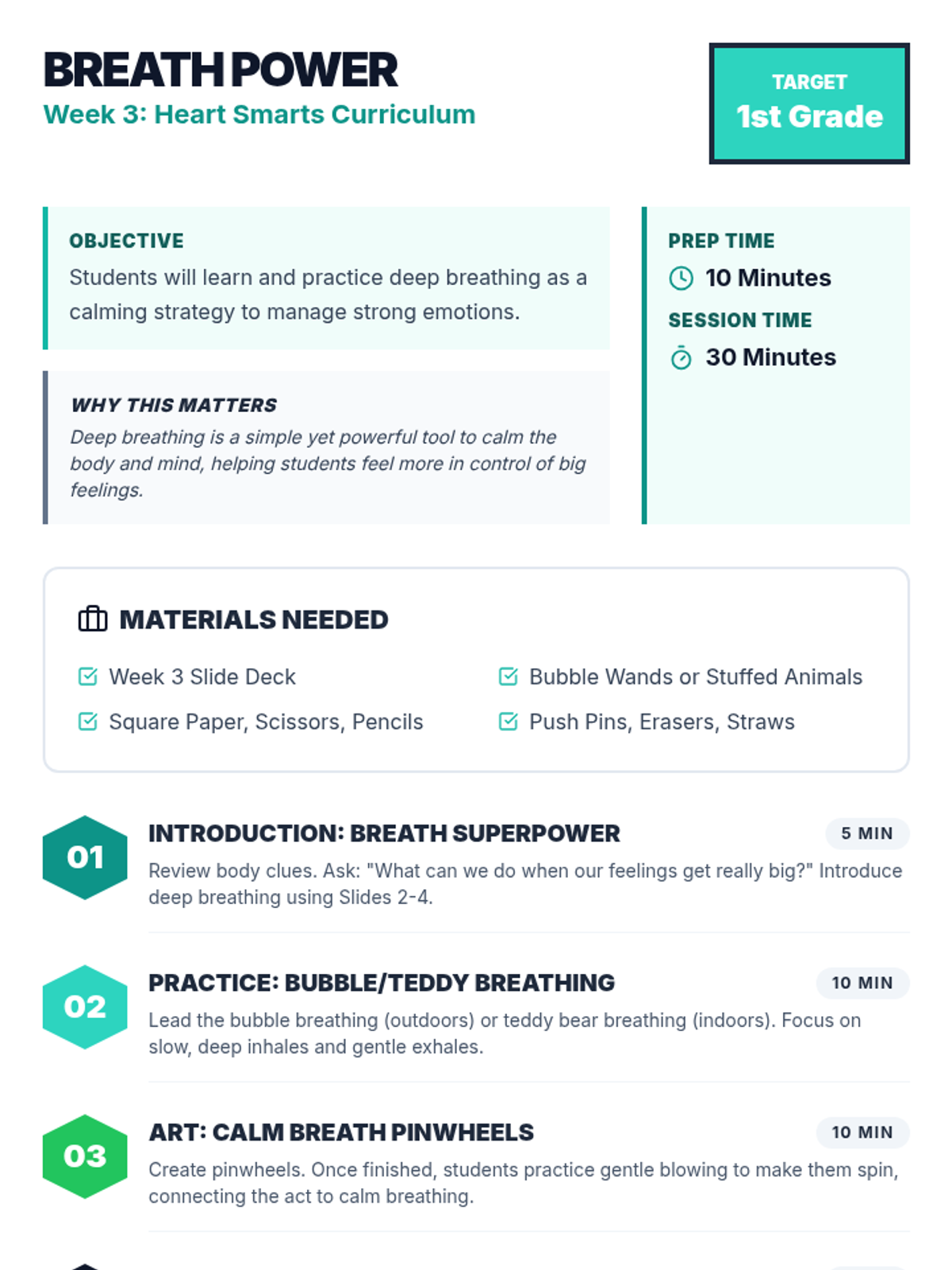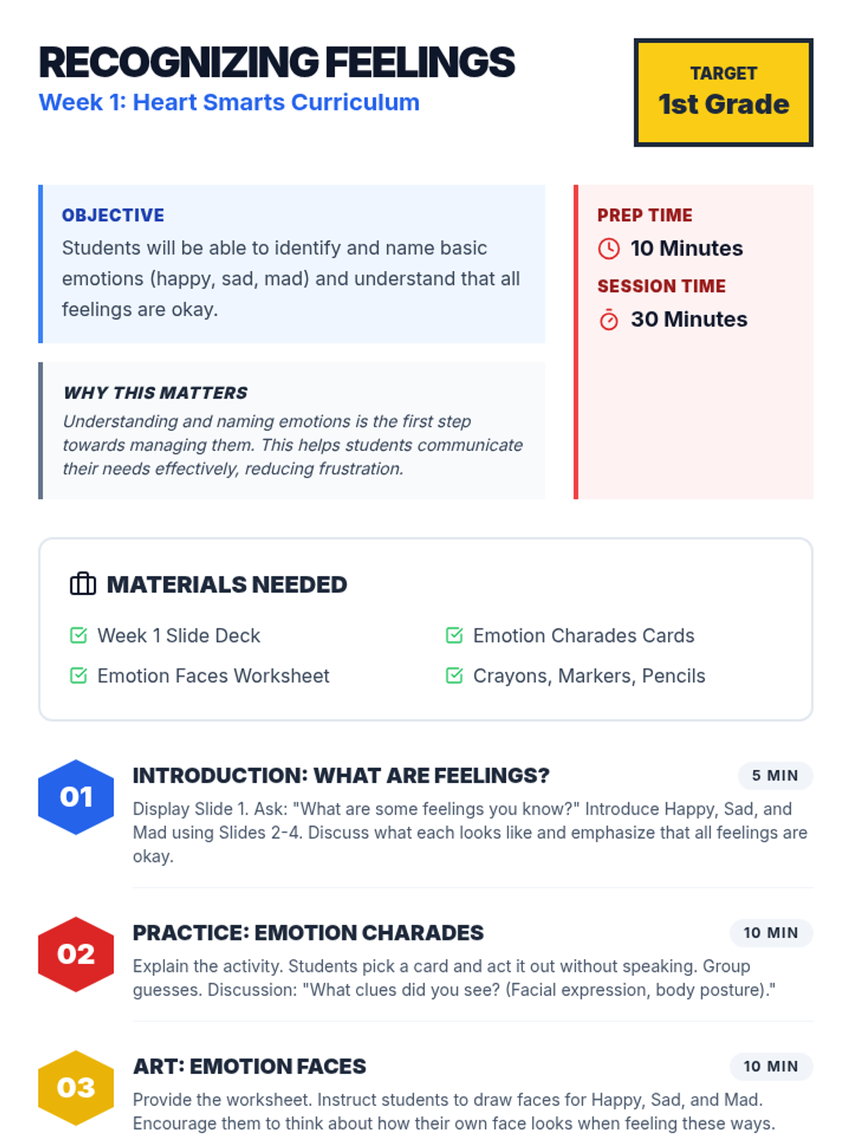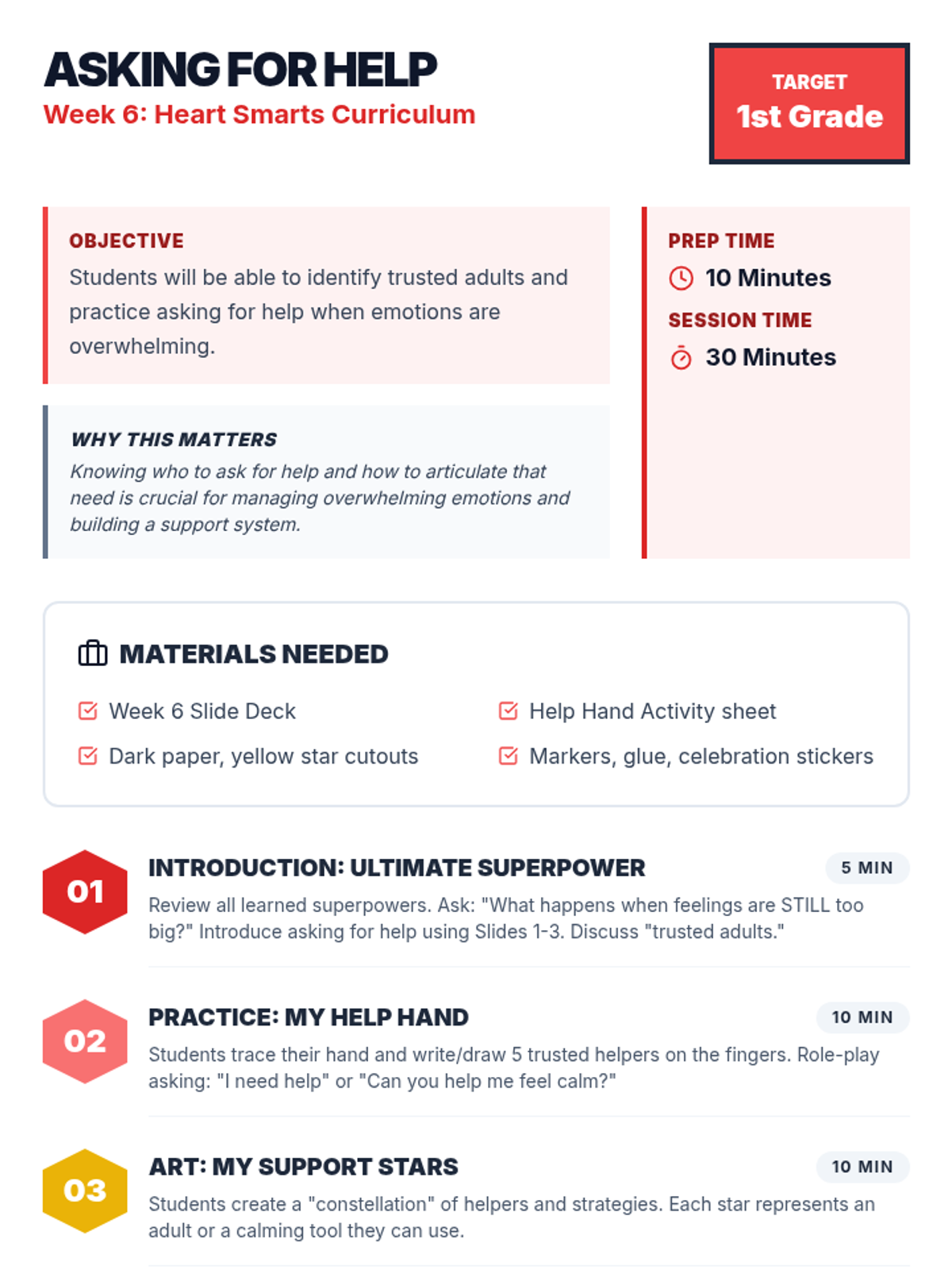 A 6-week Tier 2 social-emotional learning curriculum for 1st graders, focusing on identifying emotions, body awareness, calming strategies, and communication through a superhero-themed lens.