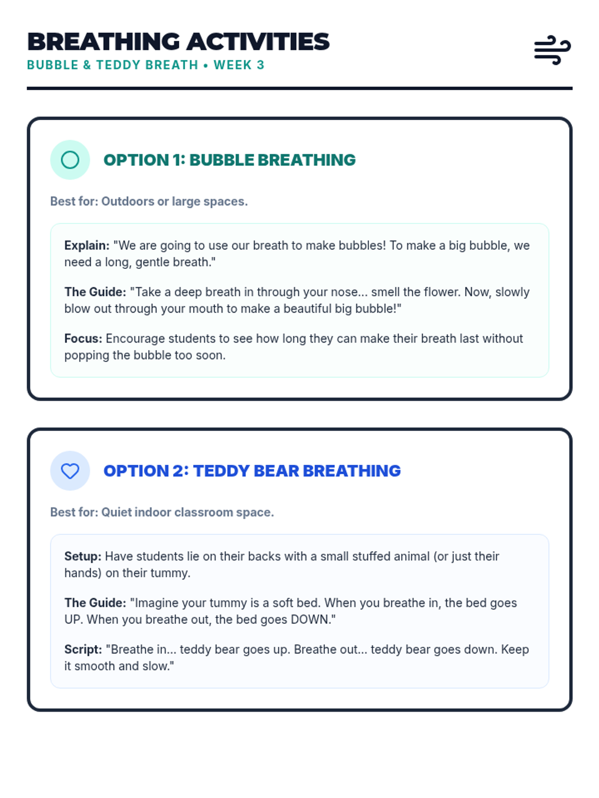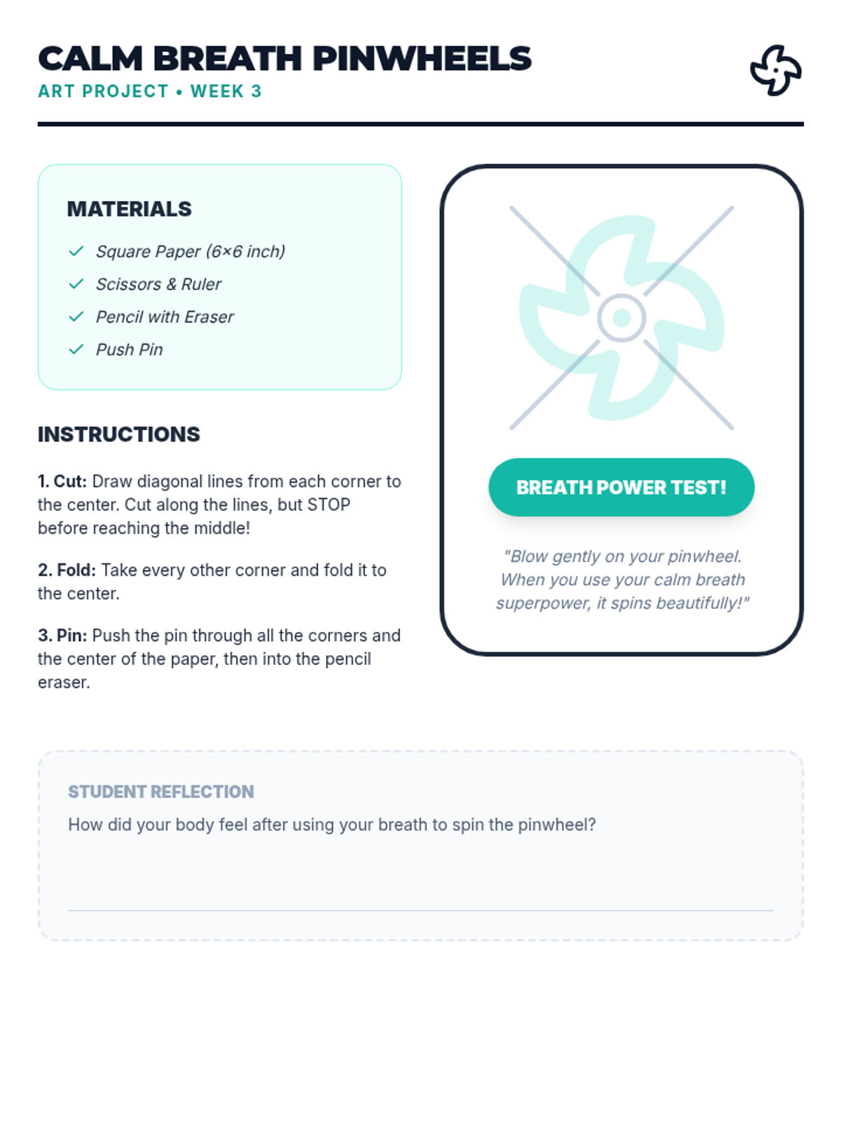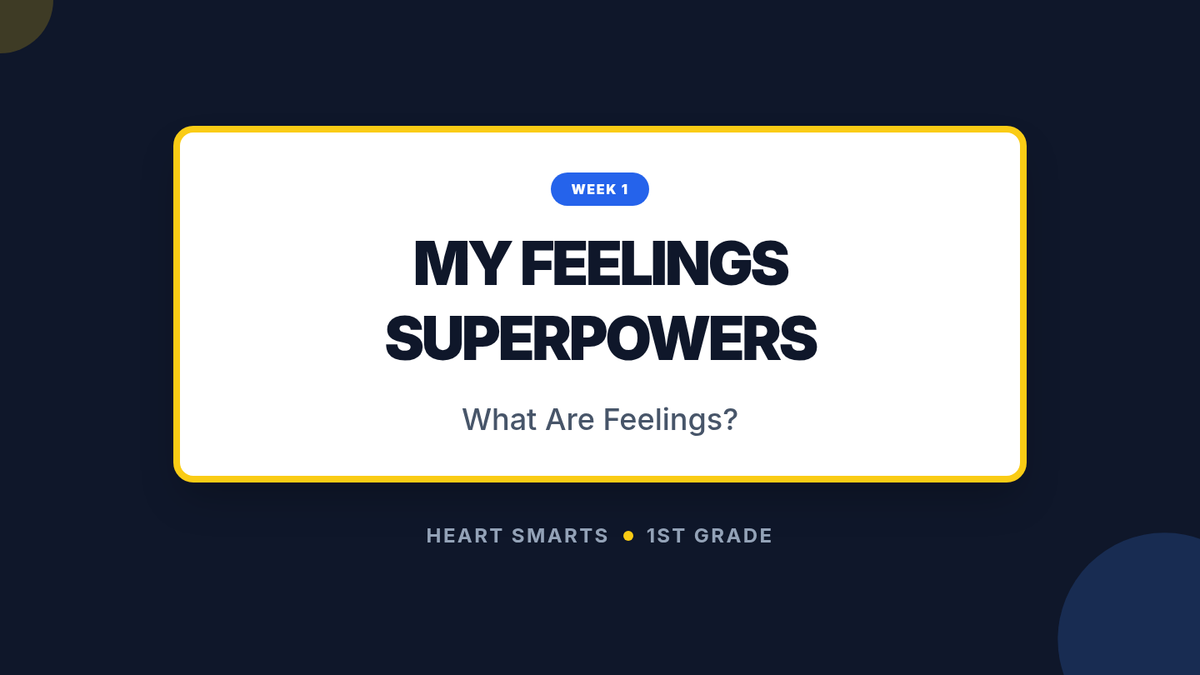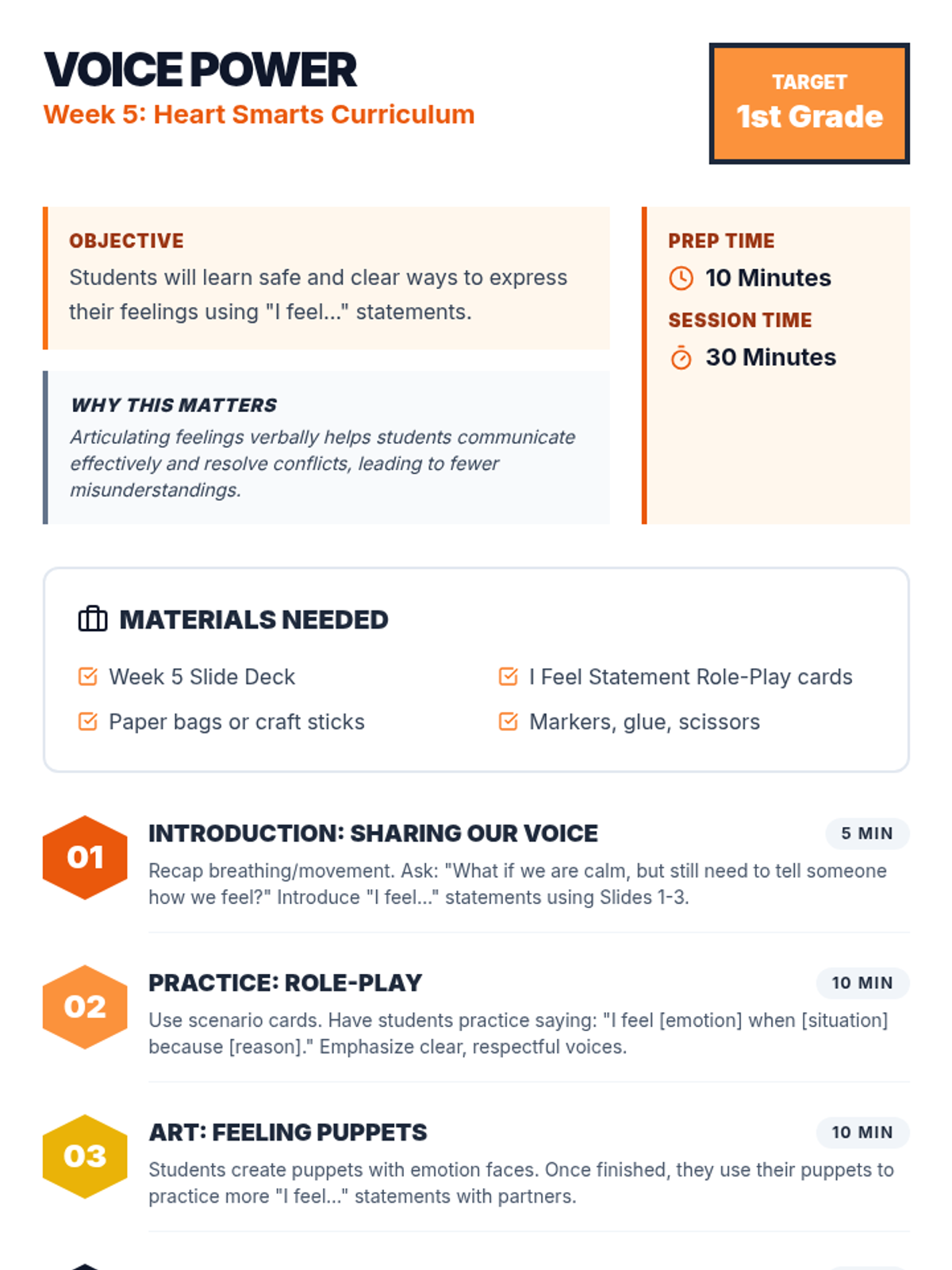 A 6-week Tier 2 social-emotional learning curriculum for 1st graders, focusing on identifying emotions, body awareness, calming strategies, and communication through a superhero-themed lens.