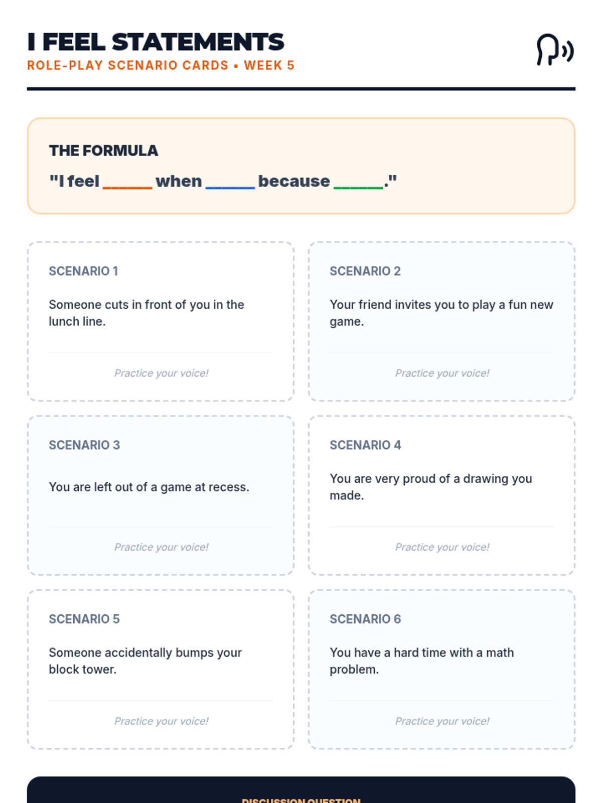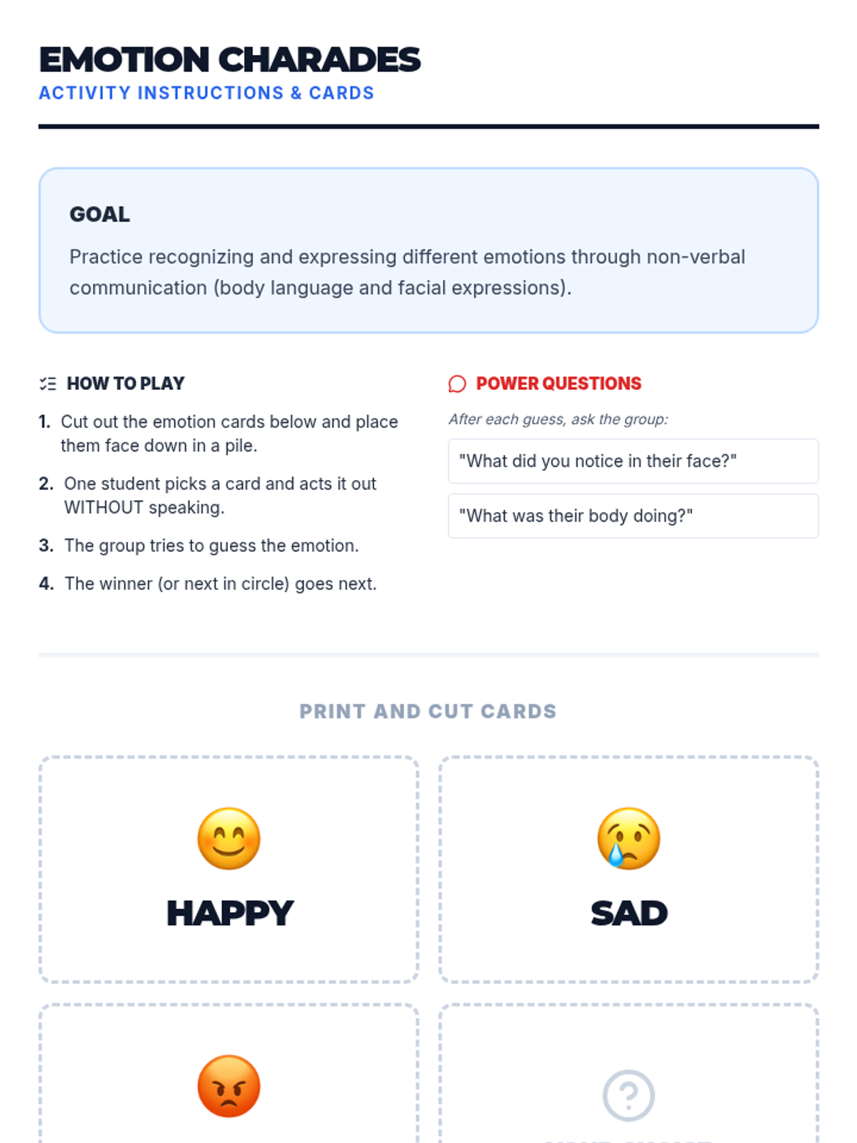 A sequence focused on building social-emotional competencies, starting with identifying and understanding a wide range of emotions. Students learn to recognize physical cues and situational triggers for different feelings.